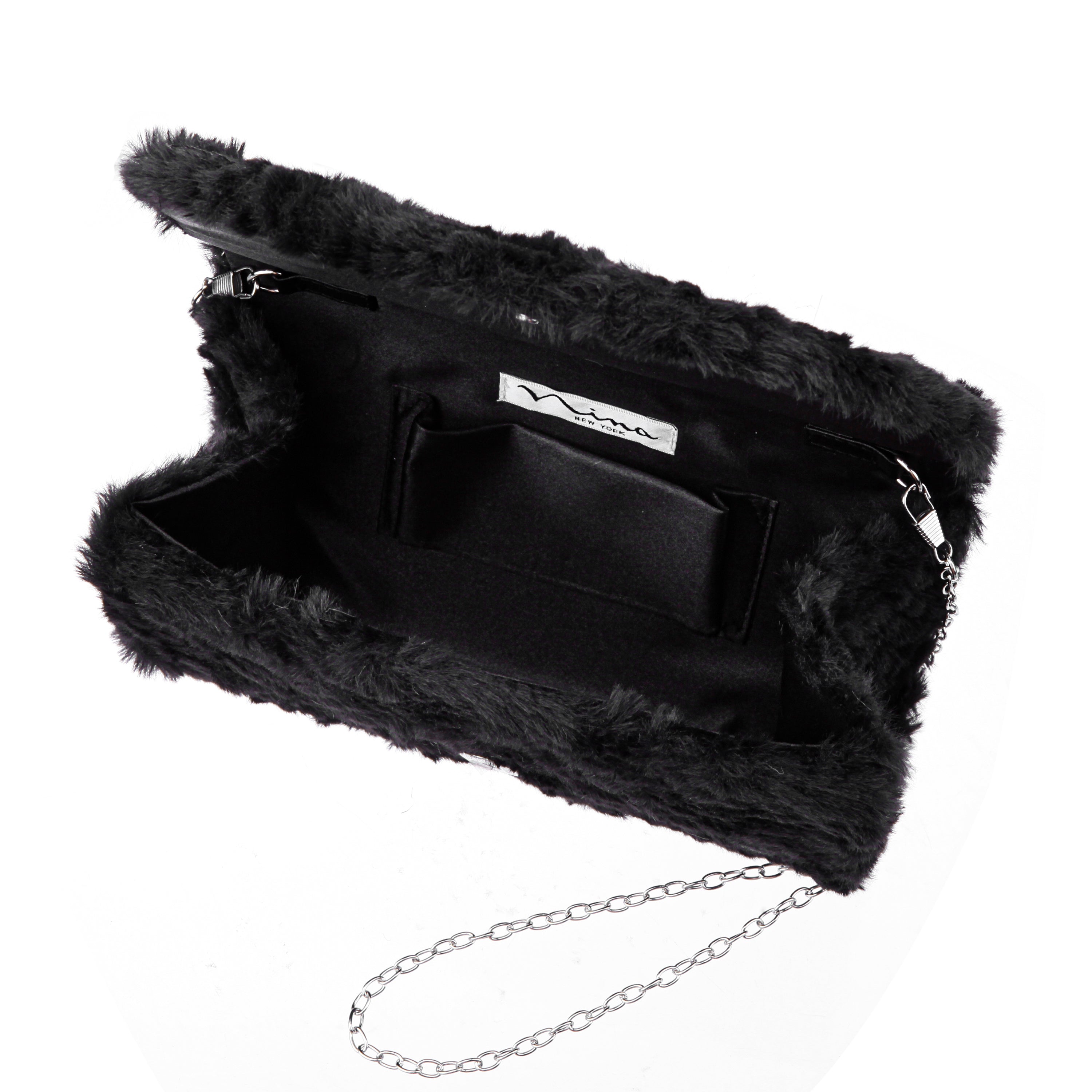 FOLDOVER CLUTCH FAUX FUR 100% POLYESTER CRYSTAL CHAIN 8" x 5.125" x2.375" back interior wall 44'' TON O-CHAIN MAG SNAP