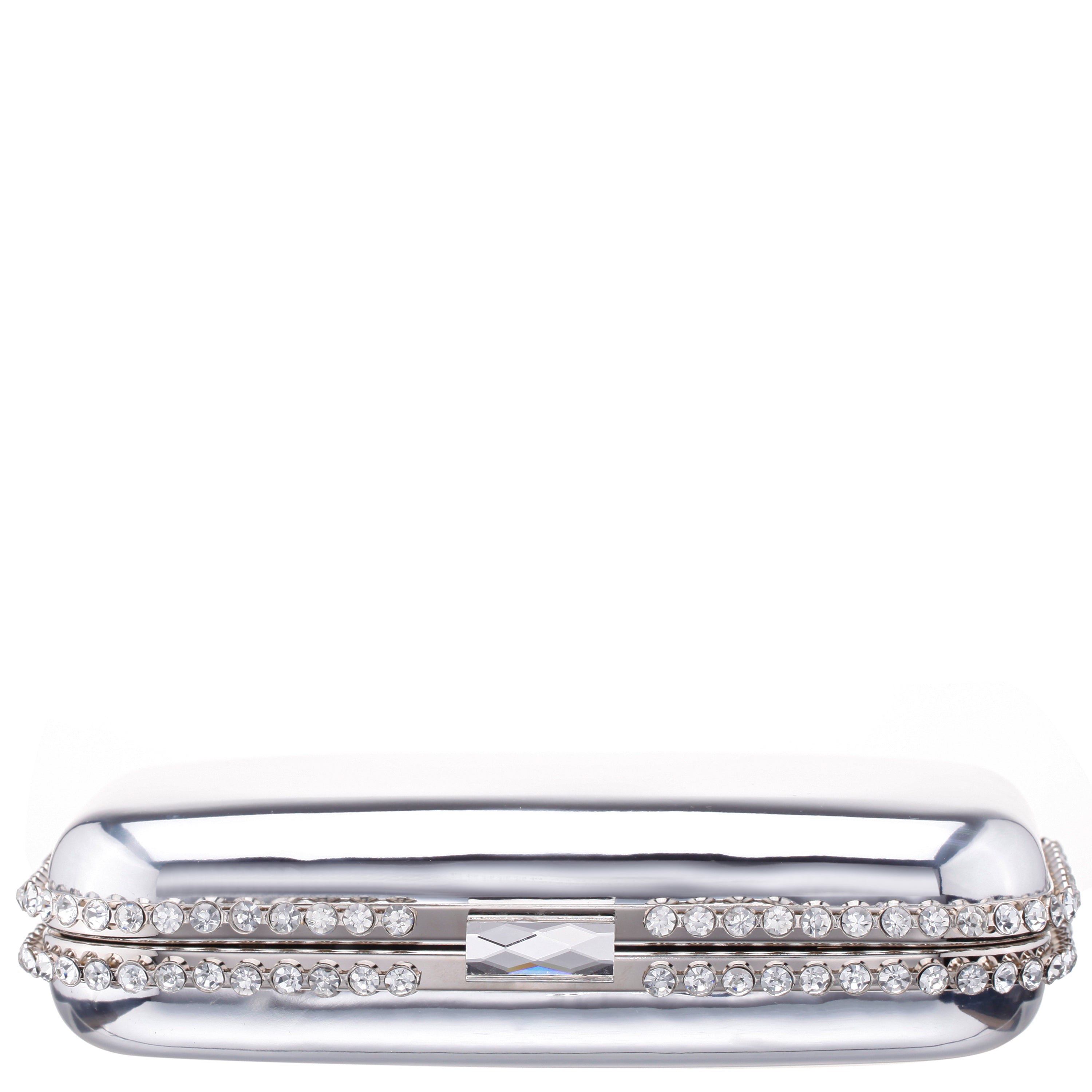 A signature crystal-clasp sits atop a metallic material frame clutch fashioned with a crystals adorned on edges, also includes a drop-in chain strap for versatile styling.