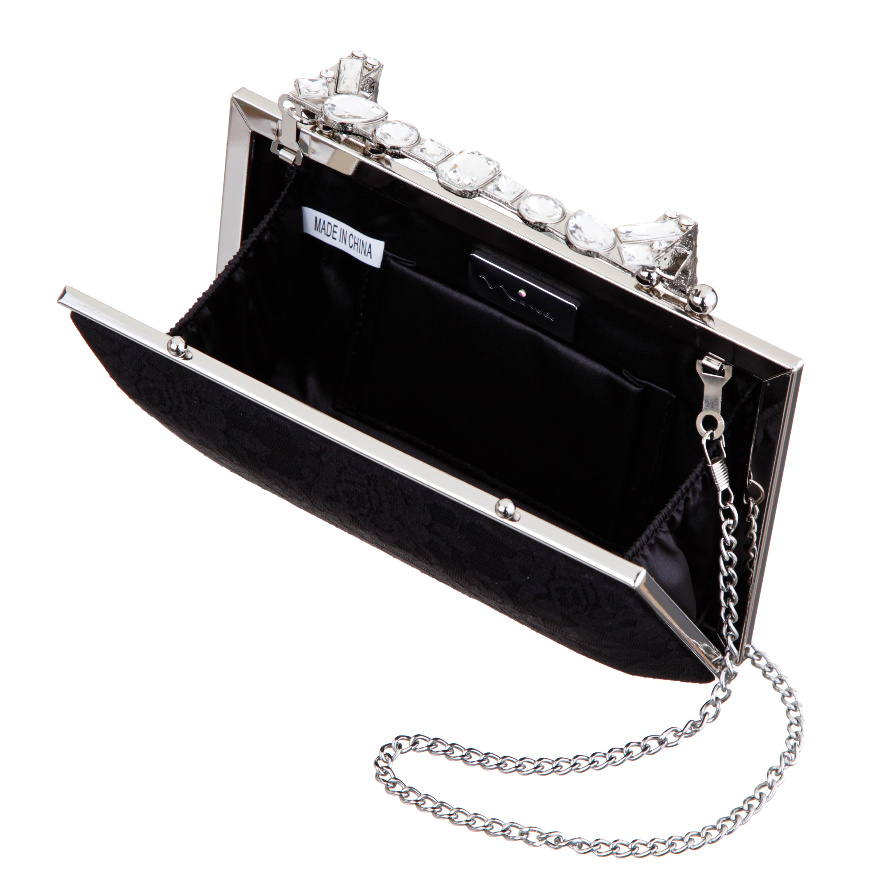 The BOUJEE-L by Nina is the definition of luxurious sparkle with a sleek edge, wrapped in a beautifully textured lace body that adds romantic sophistication. Topped with a crystal-embellished 1" drop handle, this minaudière doubles as a sparkling accessory and a show-stopping statement. The structured silhouette is both modern and refined, secured with a lift-lock clasp for a touch of vintage elegance. Inside, the satin-lined interior and back wall pocket provide just enough room for your essentials. Whether you carry it by hand or wear it with the 18" drop-length chain strap, the BOUJEE-L by Nina brings evening drama and classic beauty together in perfect harmony. For complementary styles, explore our satin shop or browse our newest arrivals.