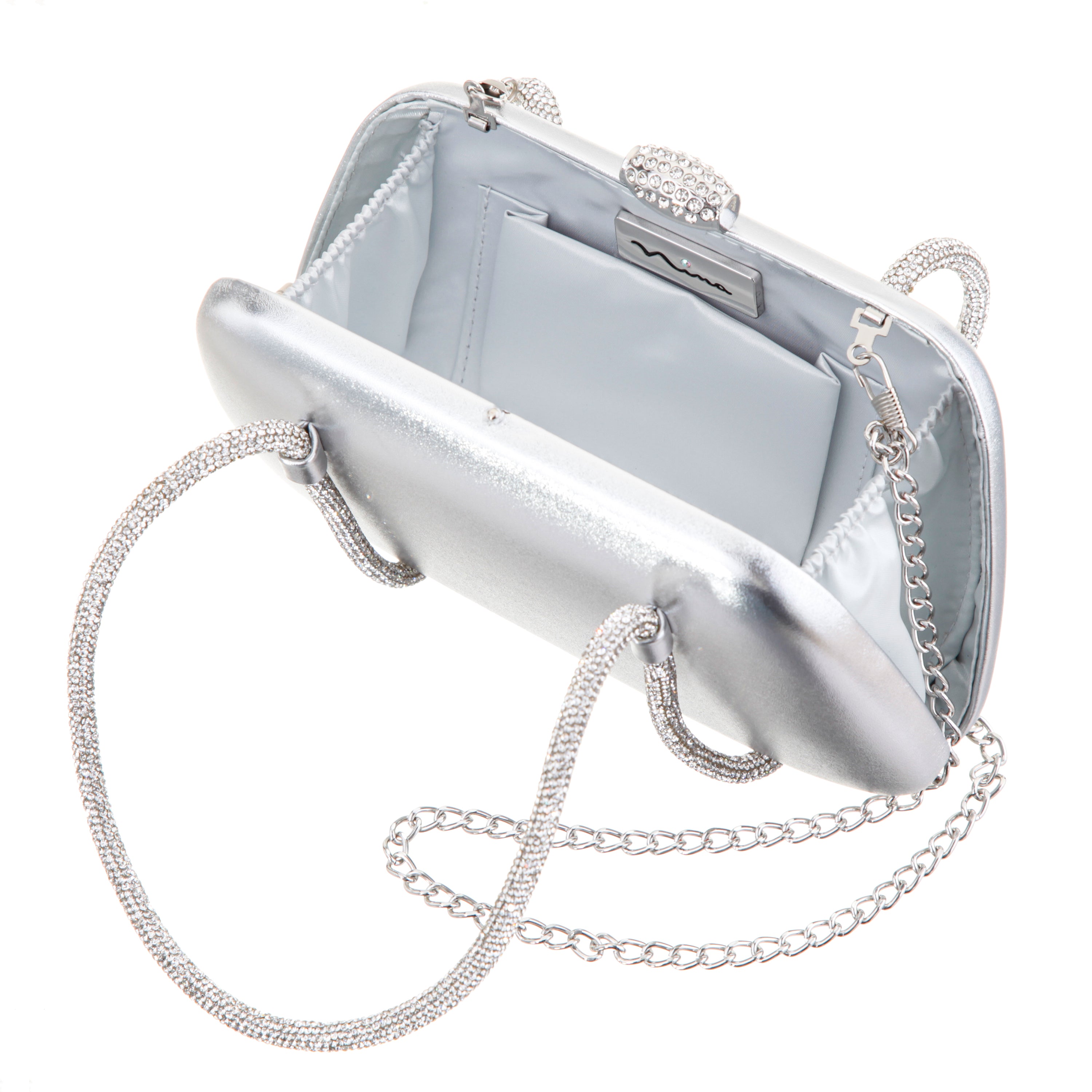 CAMARA by Nina is a sleek and shimmering minaudiere designed to elevate any evening look. Its standout feature—a handheld crystal cord handle—adds a bold yet elegant touch, perfectly balanced by the sparkle of glass crystal embellishments. With a hidden magnetic closure, compact shape, and both a handle and a chain strap, CAMARA blends versatility and glamour in one dazzling accessory.