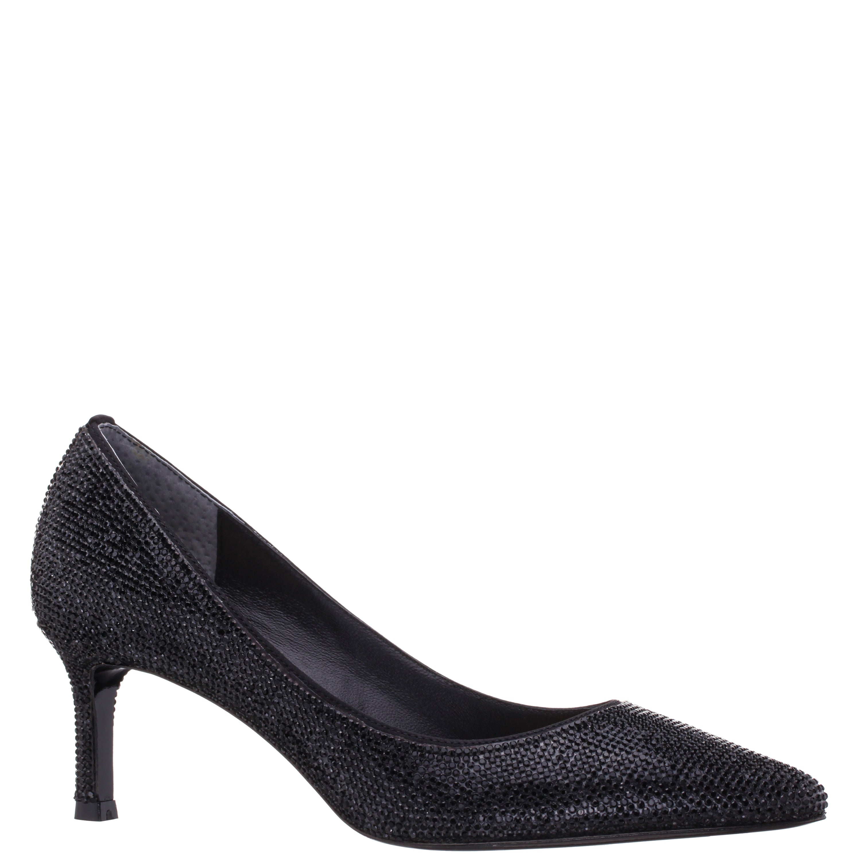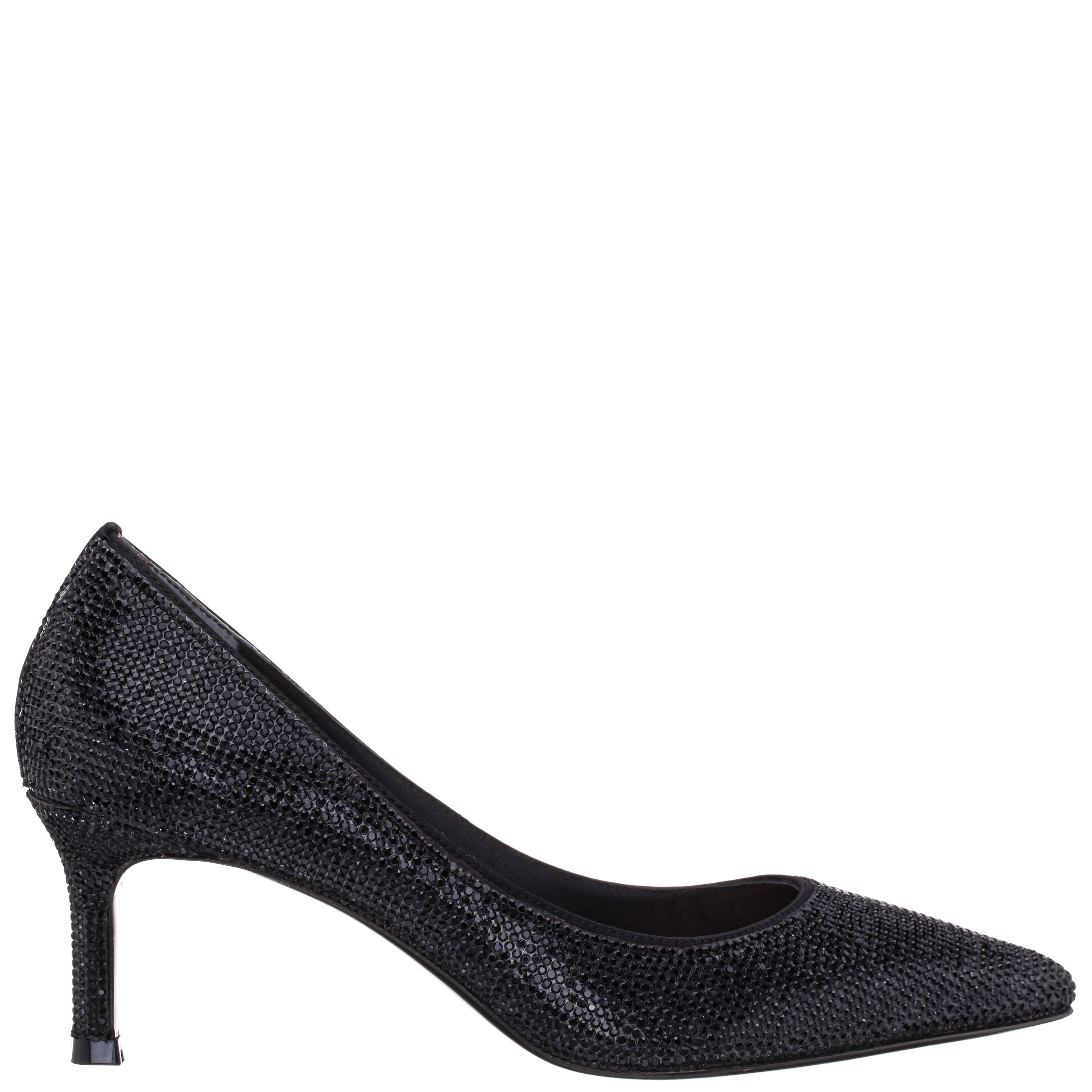 BLACK CRYSTAL ON BLACK SATIN MID-HEEL CLASSIC PUMP