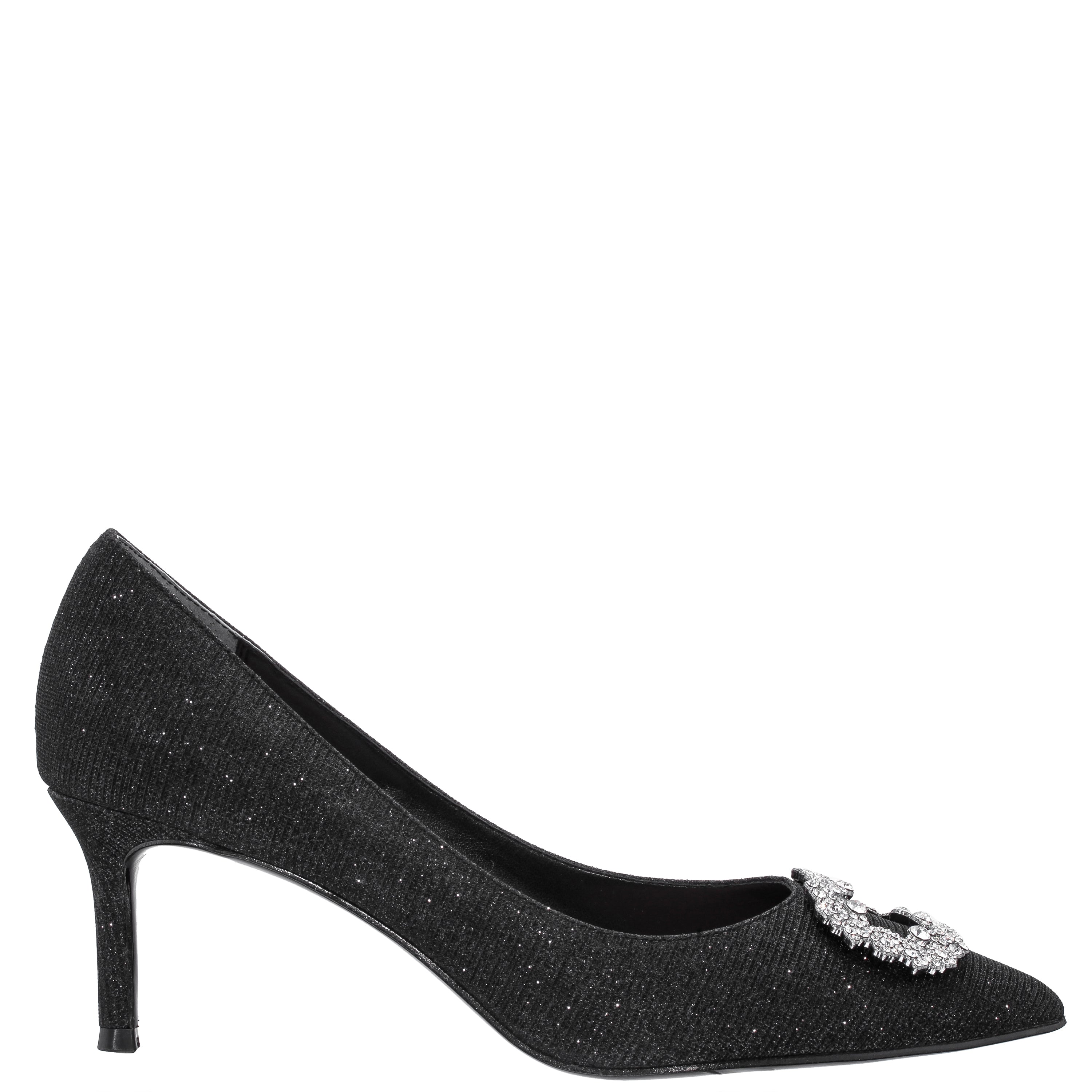 BLACK TEXTURED METALLIC MID-HEEL PUMPS WITH JEWELED BUCKLE
