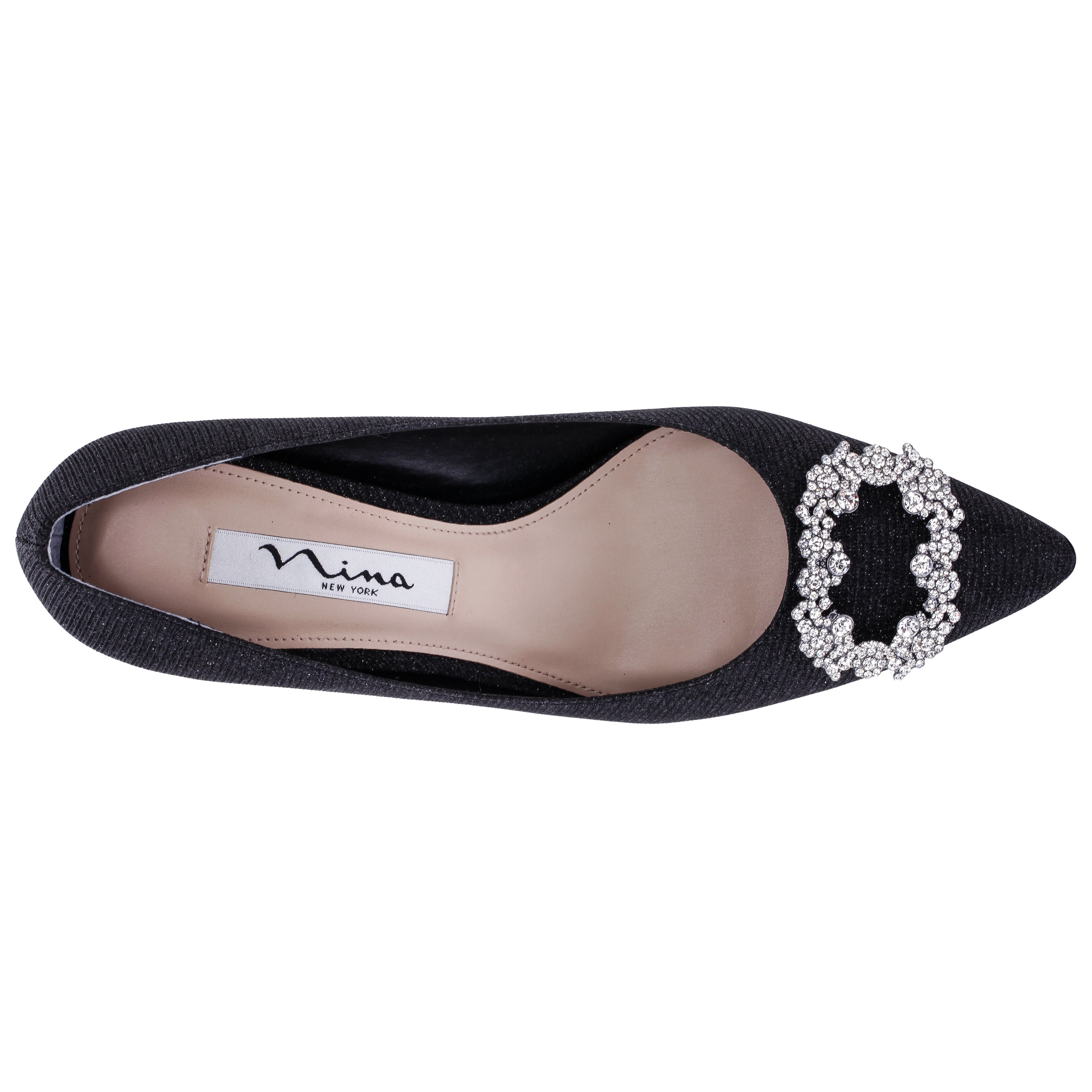A stunning crystal-jewel buckle adorns Neya by Nina -  an elegant pump inspired by the opulence of the French court. A must-have mid-height heel addition to your footwear wardrobe is also available in wide-widths.