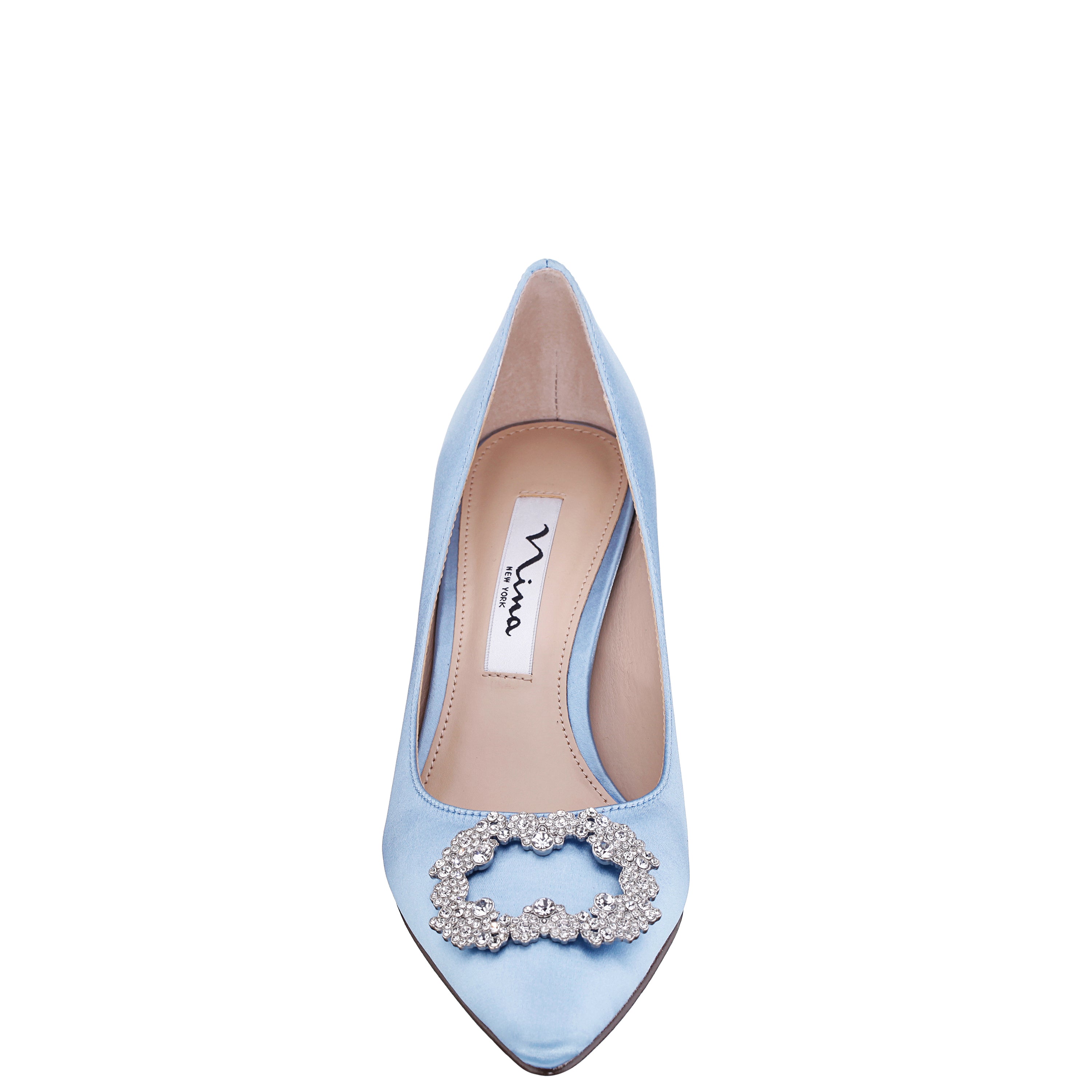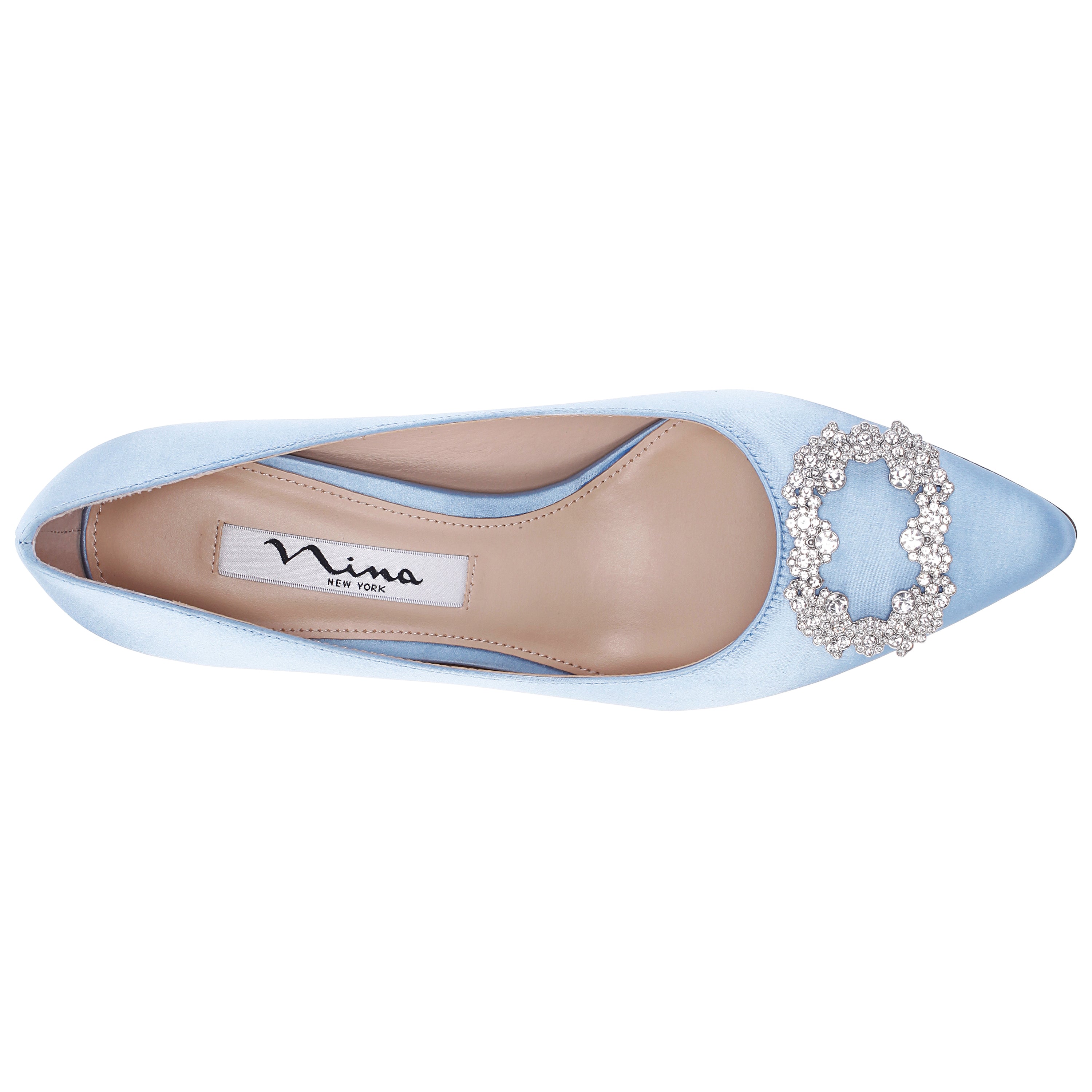 A stunning crystal-jewel buckle adorns Neya by Nina -  an elegant pump inspired by the opulence of the French court. A must-have mid-height heel addition to your footwear wardrobe is also available in wide-widths.