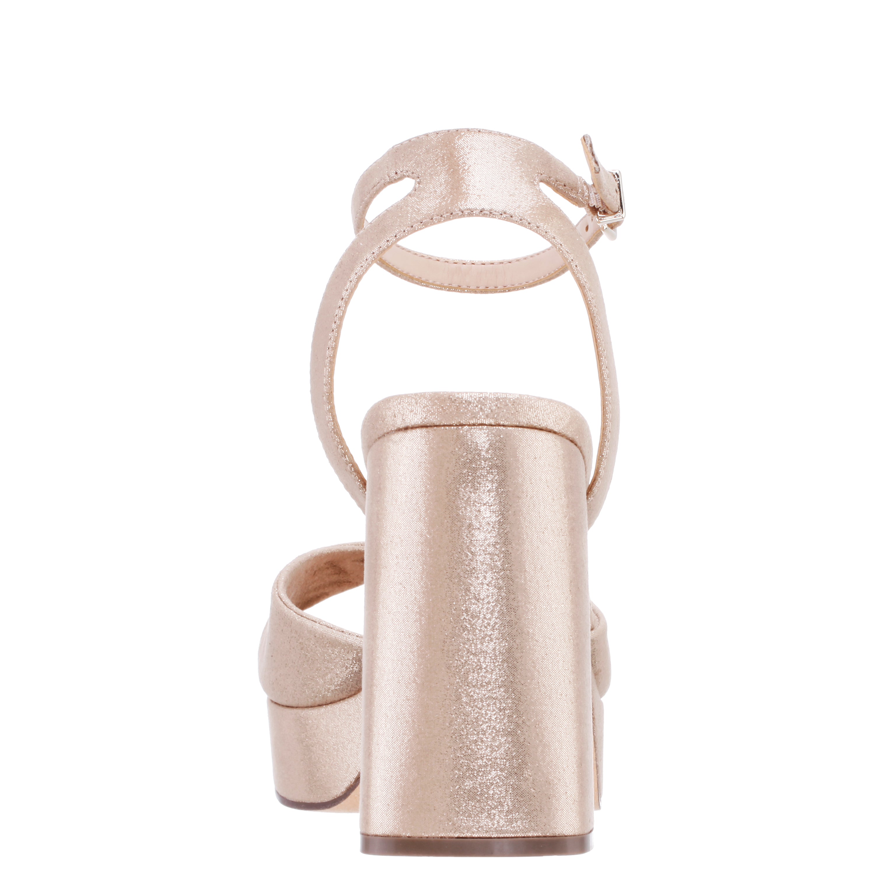 TAUPE METALLIC SUEDETTE BLOCK-HEEL PLATFORM SANDALS WITH TWIST-FRONT AND ANKLE-STRAP