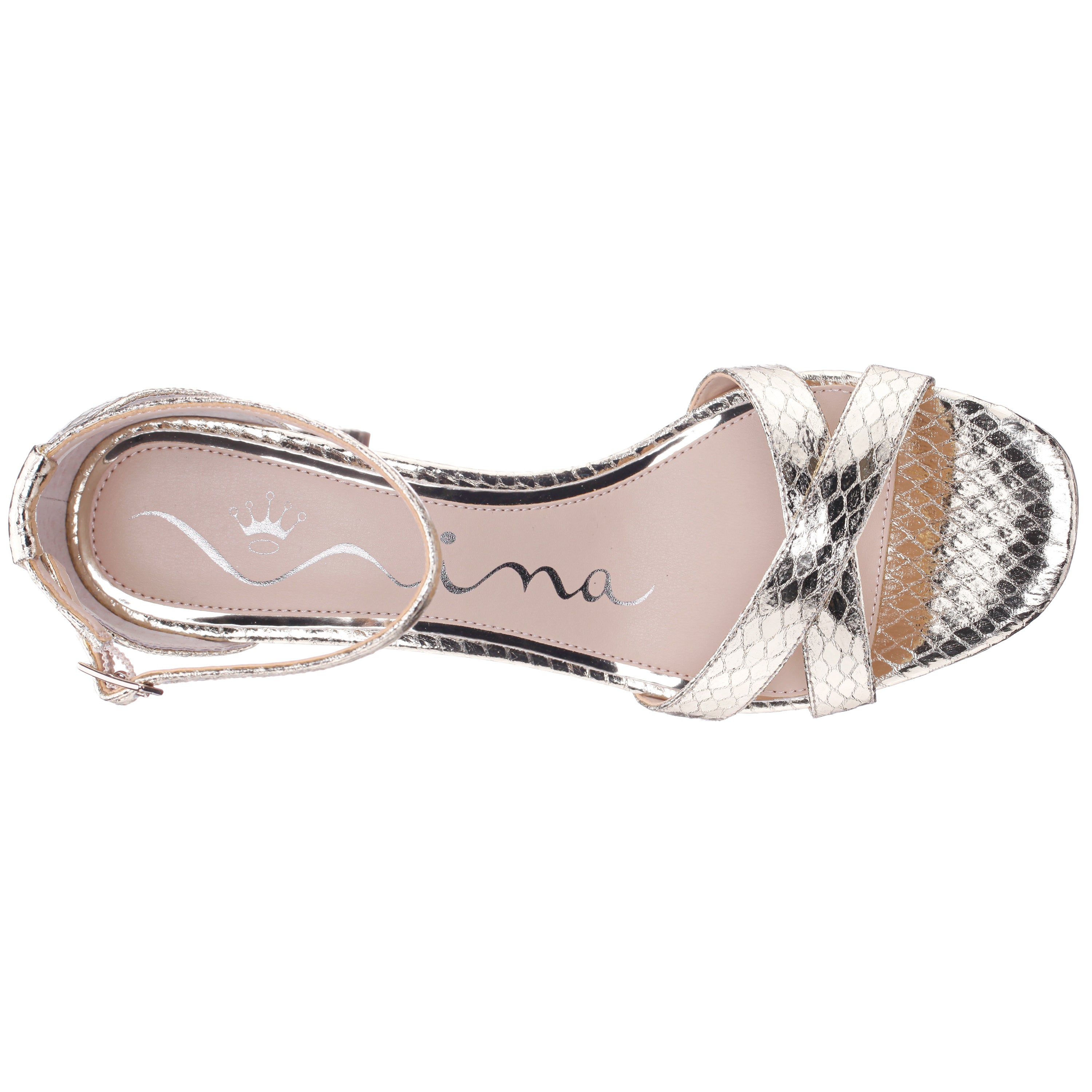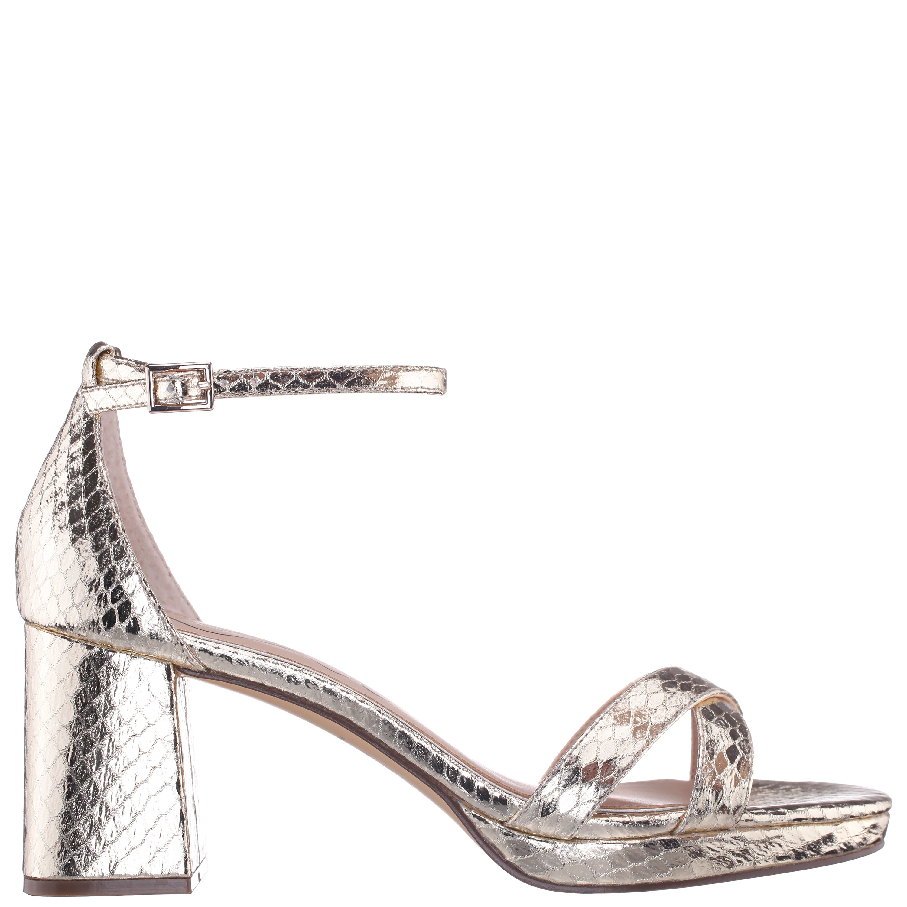 BEAU by Nina Shoes is a must-have for every fashionable woman's shoe collection. Sitting on a low block heel balanced with a just-right platform, a slender adjustable ankle strap and a modern soft square toe, this graceful X-band vamp pattern is always in style. This iconic style is detailed in snakeskin for stepped-up style.