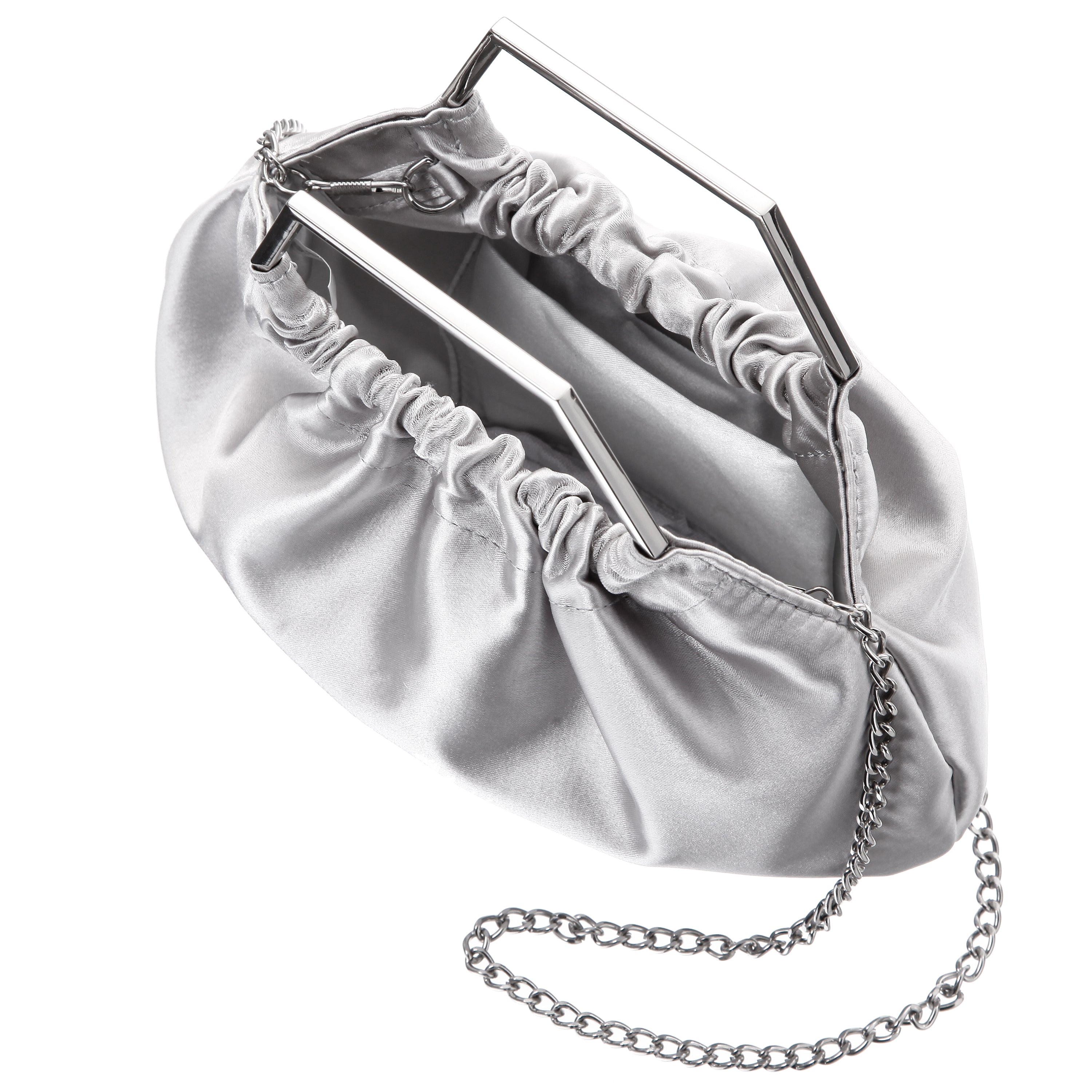 Geometrical handle pairs well with a satin pouch silhouette creates a trendy yet classy look. Can fit all the essentials also include drop in chain to go hands free