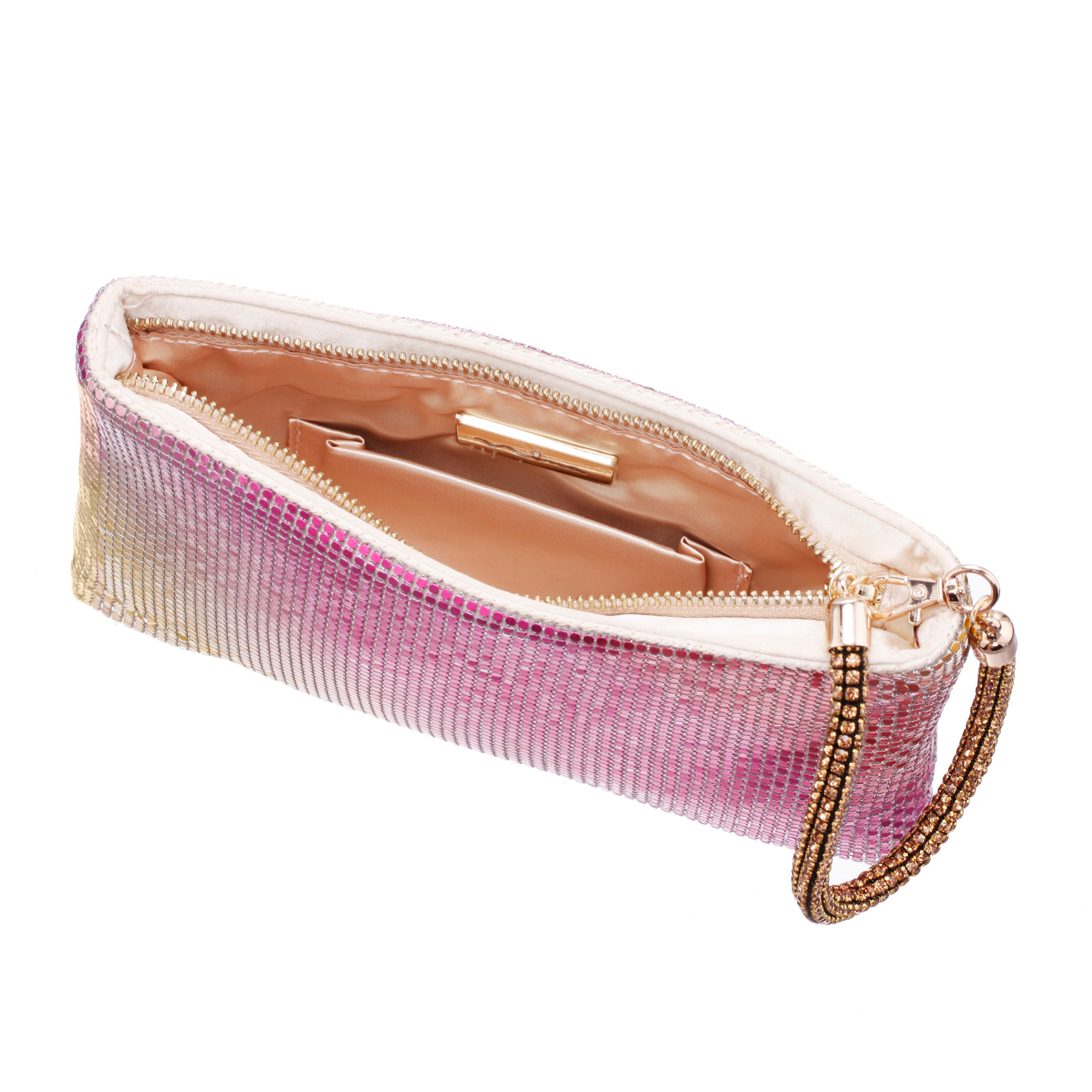 This mesh cosmetic bag with crystal wristlet strap is both functional and fashionable.