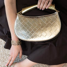 The CORY by Nina is the ultimate blend of modern elegance and artistic craftsmanship. Designed with a sleek half-moon silhouette, this stunning bag features an embossed woven texture that adds depth and dimension to its metallic faux leather body. The sculpted metal handle, with a 3" drop length, enhances its sophisticated appeal, while the 18" flat curb chain strap offers a stylish hands-free carrying option. Secured with a smooth zipper closure, the satin-lined interior includes a back wall pocket for easy organization. Perfect for evening soirées, upscale events, or adding a polished touch to your ensemble, the CORY is a true statement accessory.