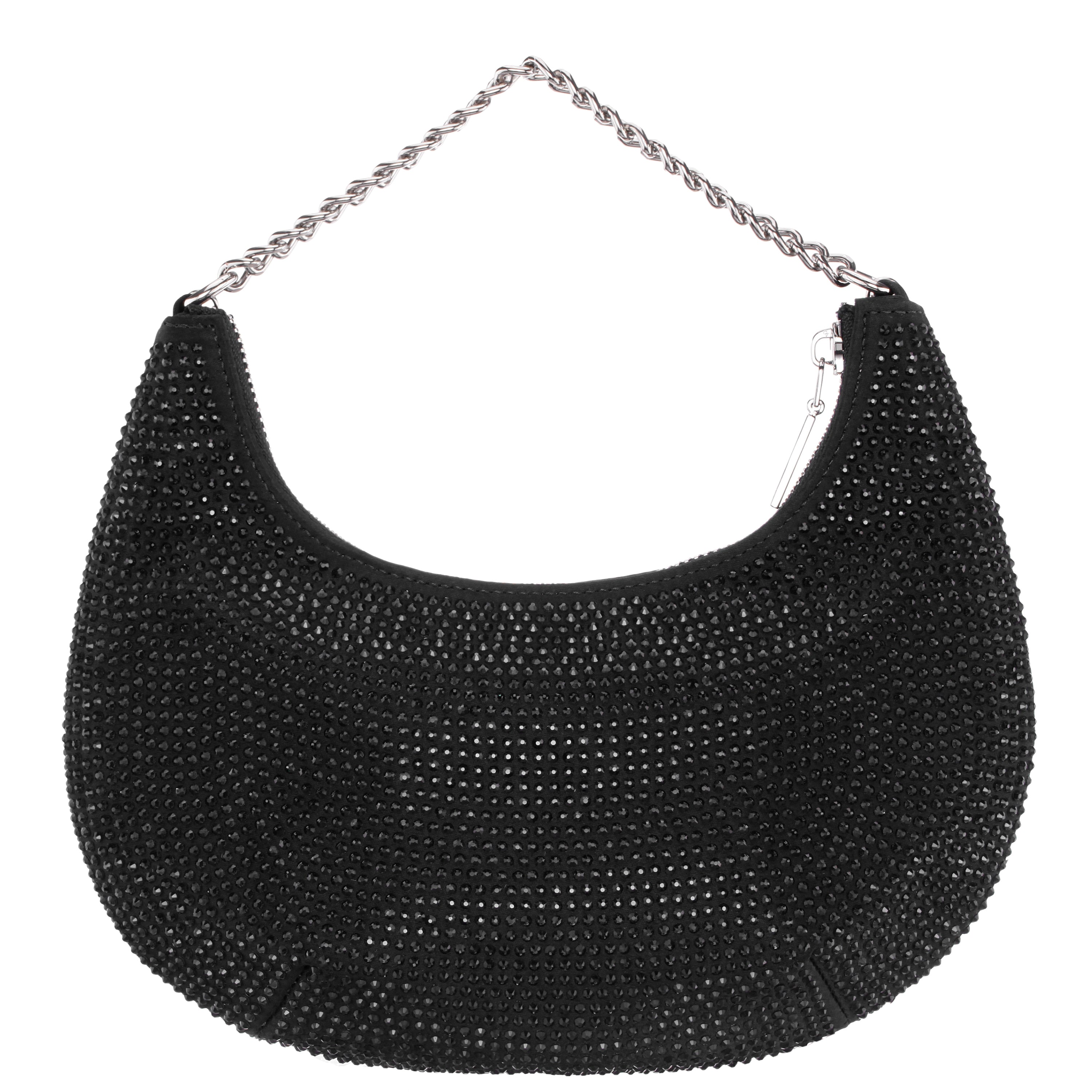 DARYN by Nina is a statement piece that redefines glam. This crescent moon-shaped crossbody is encrusted from edge to edge with all-over glass crystals, creating an unforgettable shimmer with every step. Sleek and structured, it's designed to dazzle from cocktail hours to after-hours. The zip-top closure, 24" chain strap, and 5" handle give you multiple styling options while keeping your essentials close. With its unique silhouette and radiant finish, DARYN is truly out of this world.