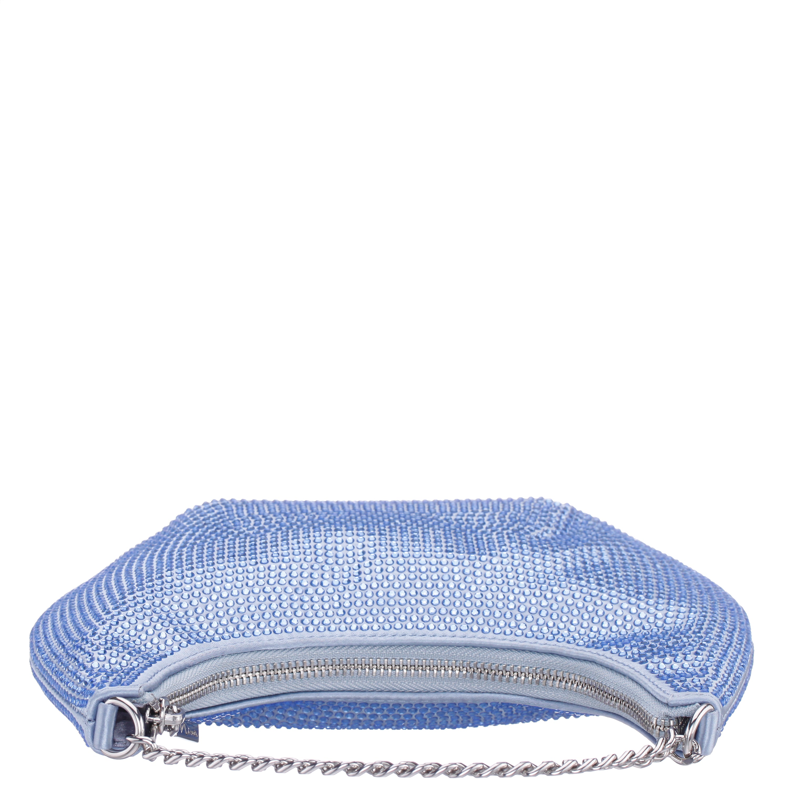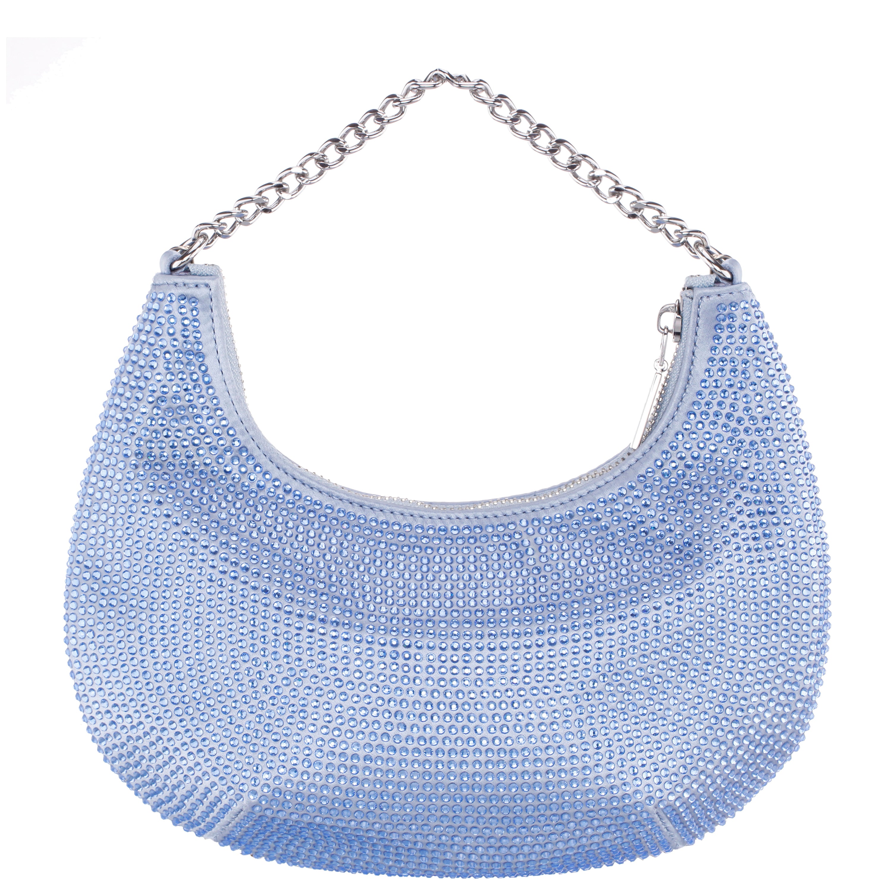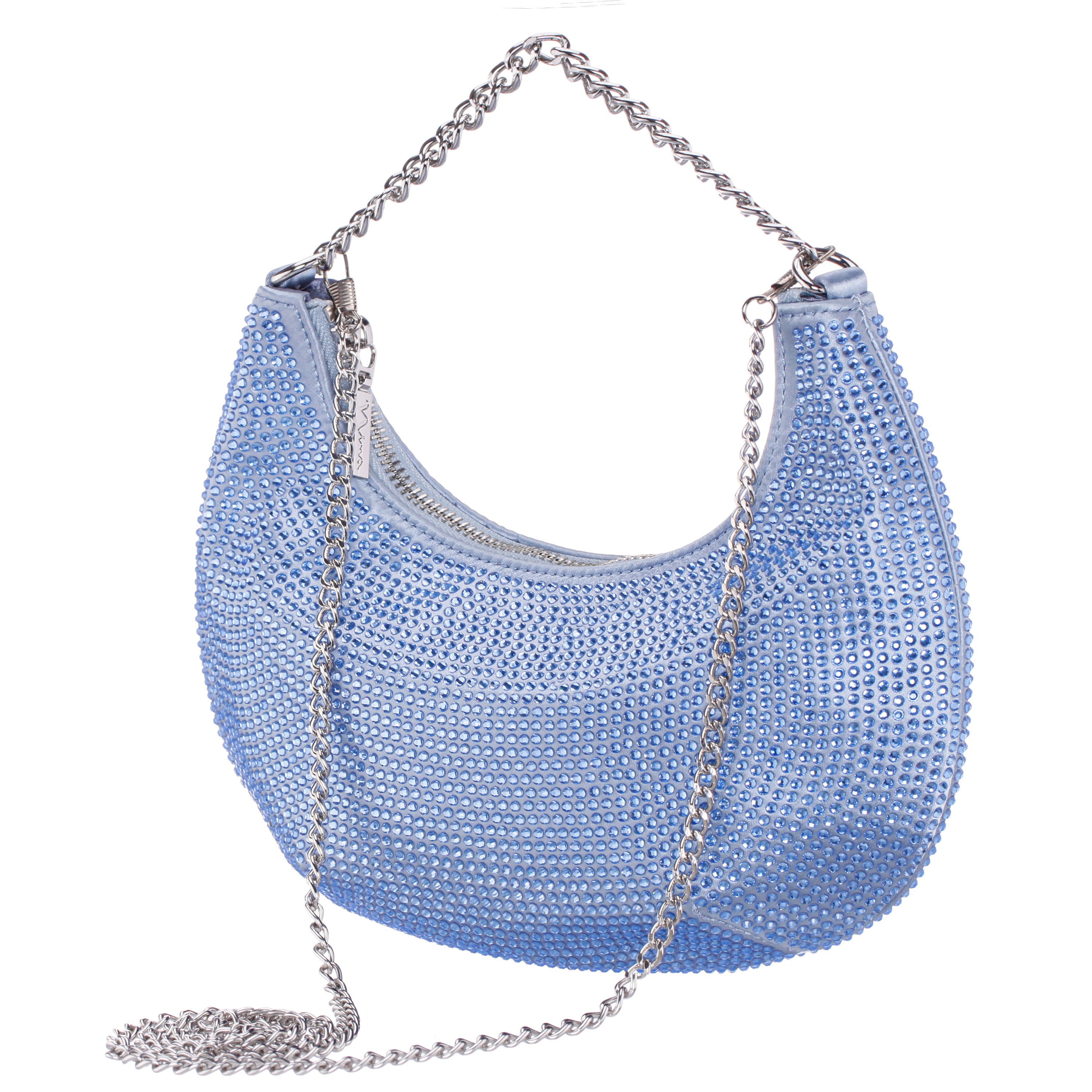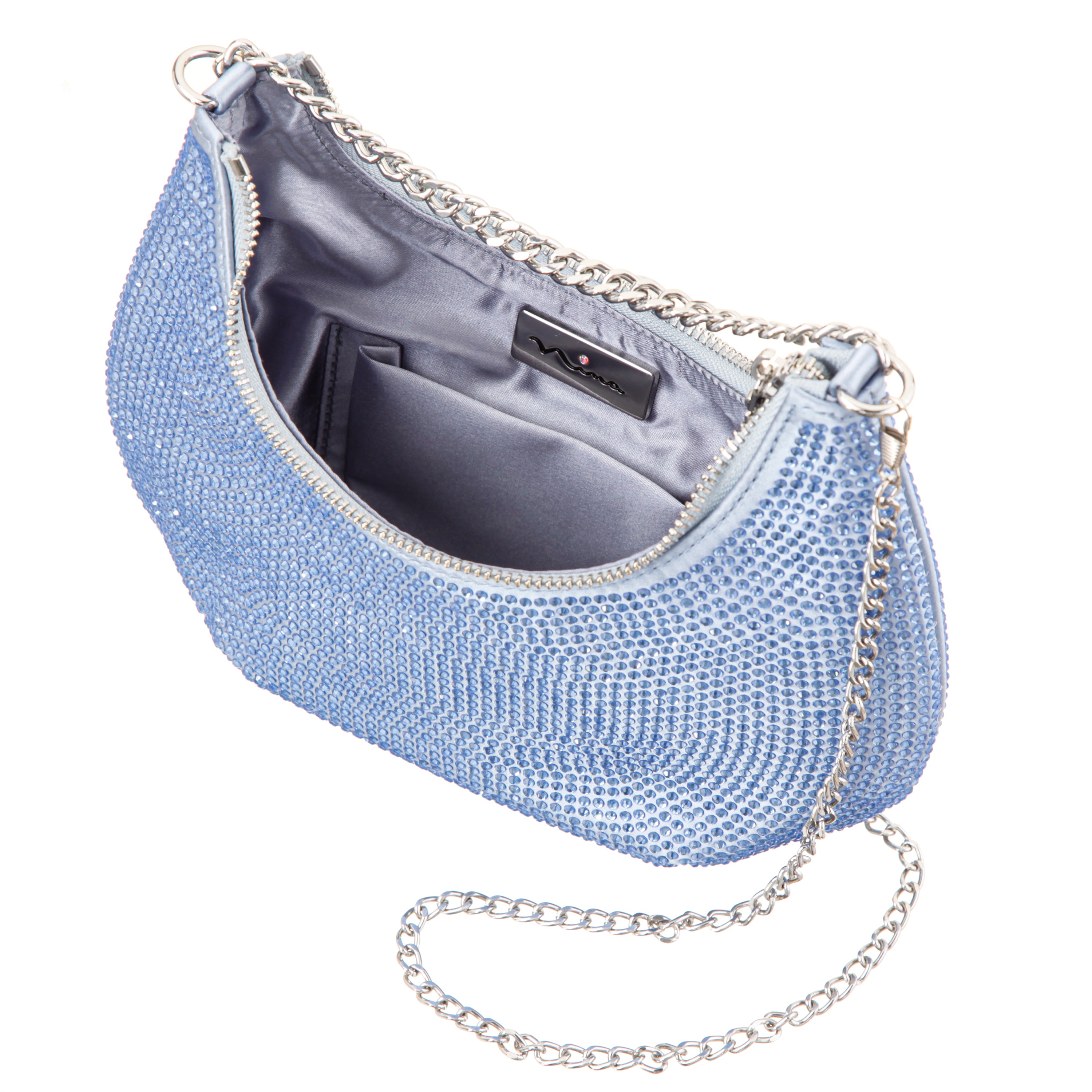 DARYN by Nina is a statement piece that redefines glam. This crescent moon-shaped crossbody is encrusted from edge to edge with all-over glass crystals, creating an unforgettable shimmer with every step. Sleek and structured, it's designed to dazzle from cocktail hours to after-hours. The zip-top closure, 24" chain strap, and 5" handle give you multiple styling options while keeping your essentials close. With its unique silhouette and radiant finish, DARYN is truly out of this world.