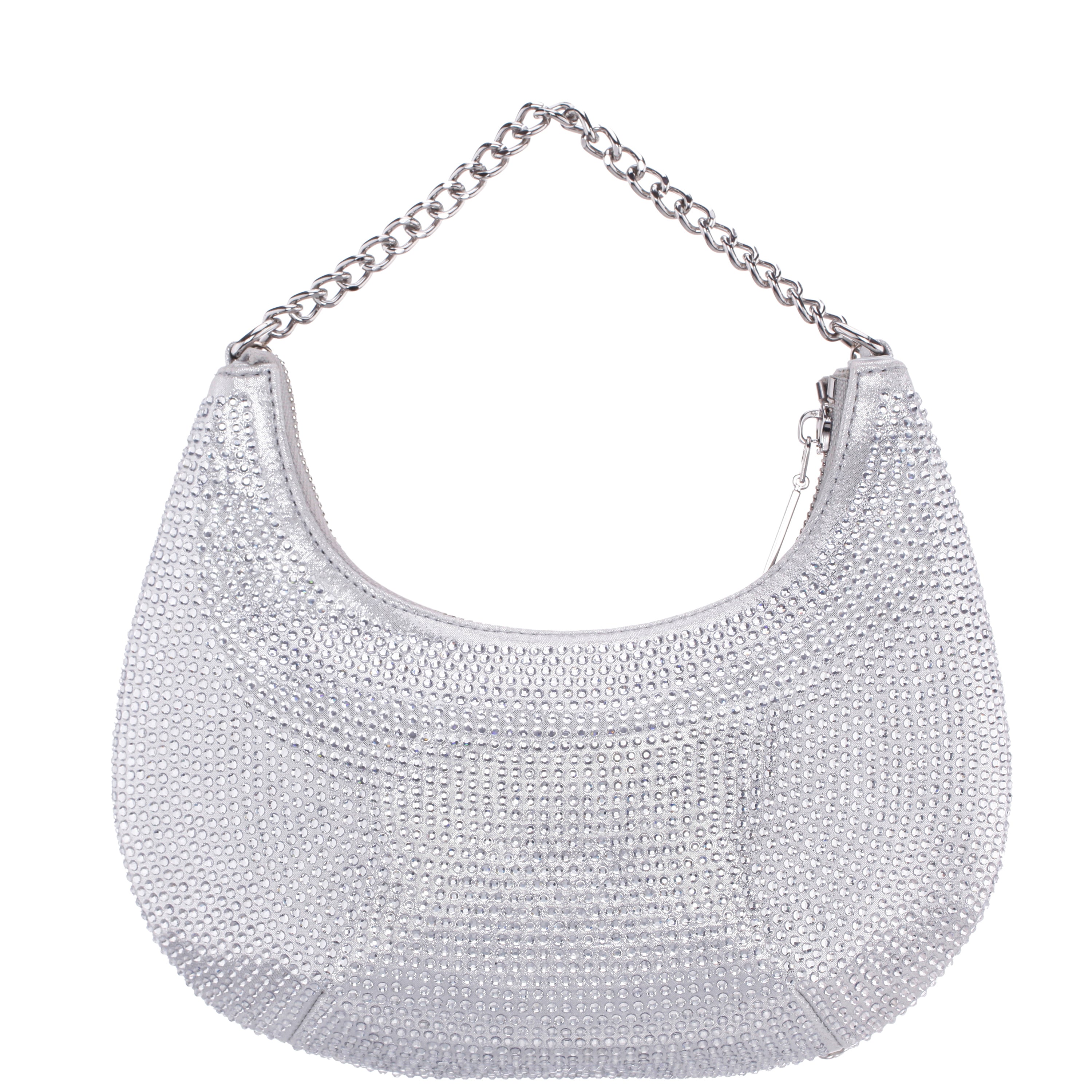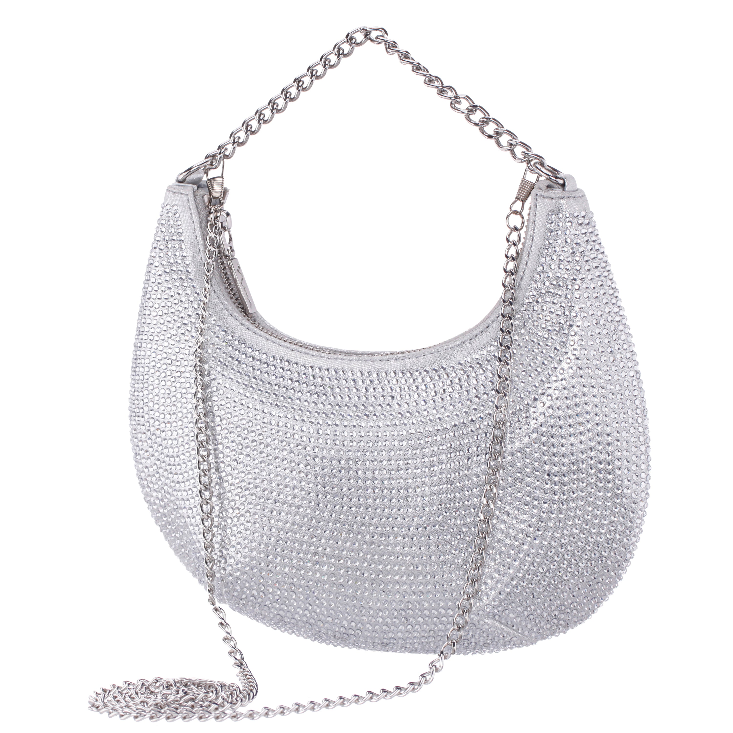 DARYN by Nina is a statement piece that redefines glam. This crescent moon-shaped crossbody is encrusted from edge to edge with all-over glass crystals, creating an unforgettable shimmer with every step. Sleek and structured, it's designed to dazzle from cocktail hours to after-hours. The zip-top closure, 24" chain strap, and 5" handle give you multiple styling options while keeping your essentials close. With its unique silhouette and radiant finish, DARYN is truly out of this world.