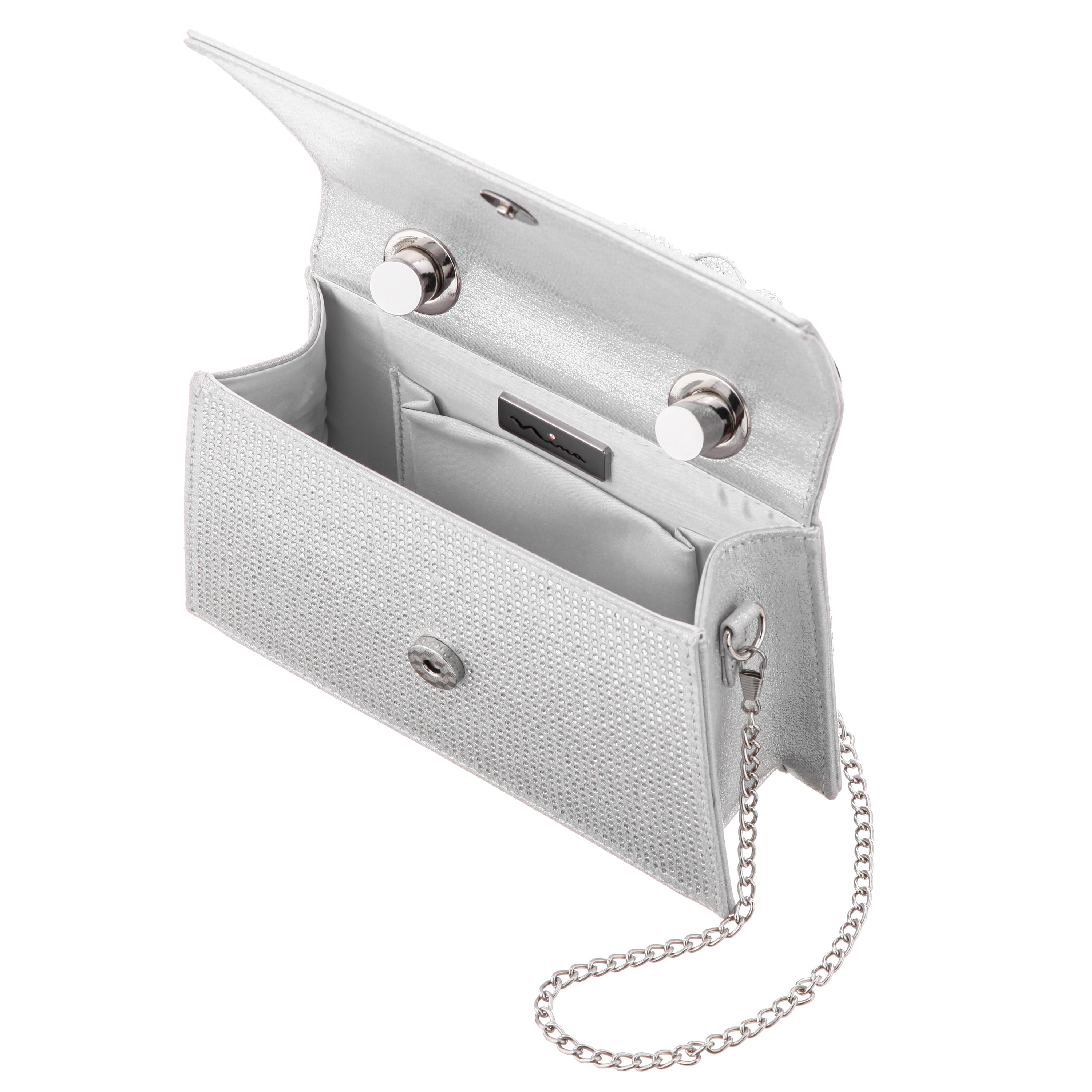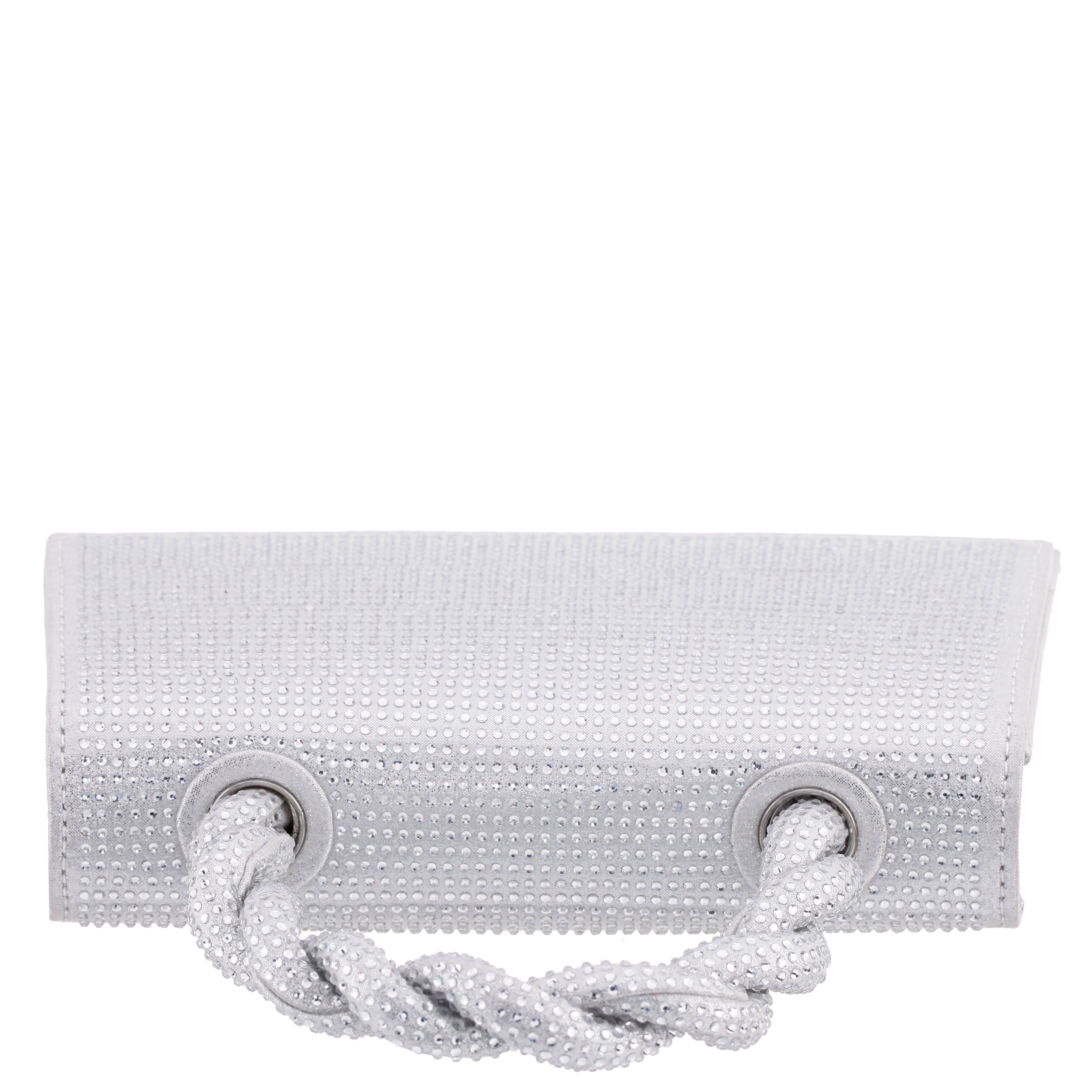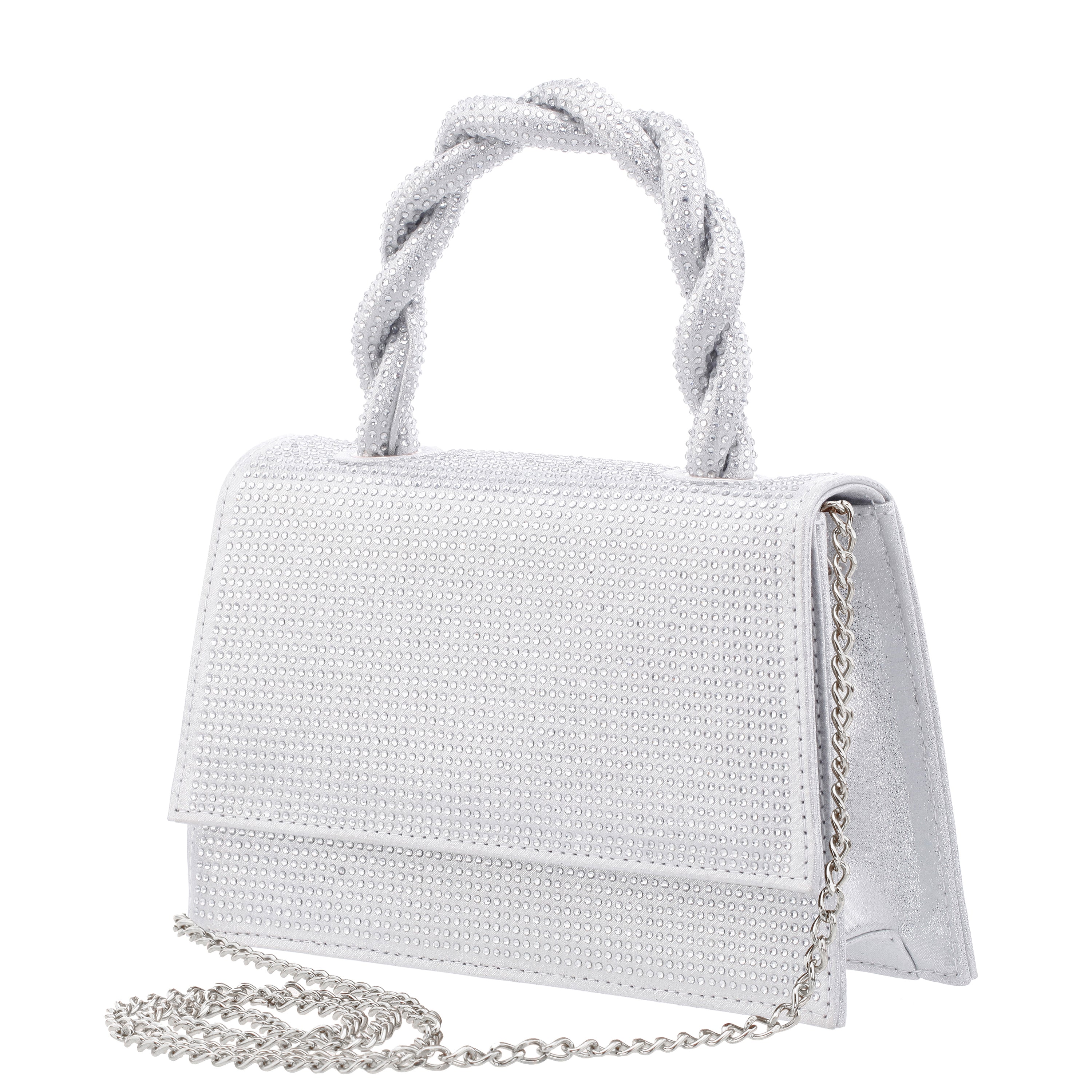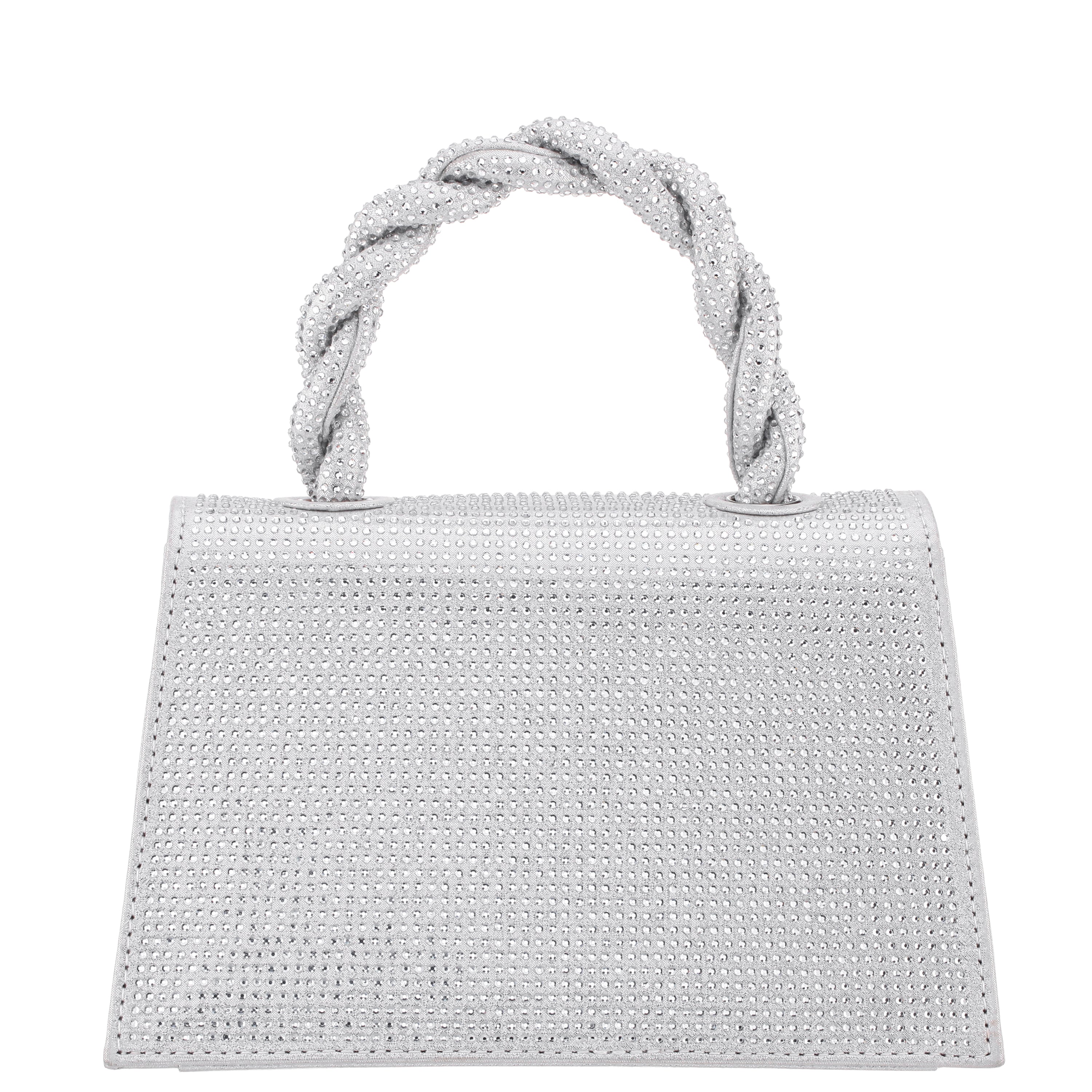 All over crystal and twisted top handle elevates any outfit and includes detachable crossbody strap.