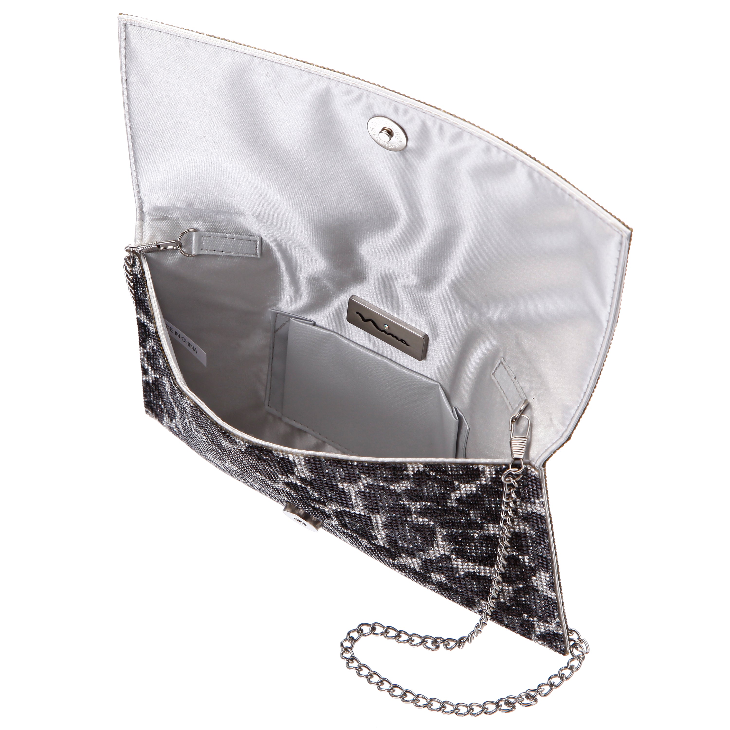 The KIMORA by Nina is the epitome of glamour, designed to make every occasion sparkle. This allover crystal-encrusted envelope clutch delivers a dazzling statement with its brilliant glass crystal embellishments, catching the light from every angle. Its sleek, structured silhouette offers a contemporary edge, while the magnetic snap closure ensures both style and security. The satin-lined interior includes a back wall pocket for effortless organization of your essentials. Carry it as a clutch for an elegant touch, or drape it over your shoulder with the 22" flat curb chain strap for a hands-free look. Whether you're attending a wedding, gala, or night out, the KIMORA ensures you shine with every step.