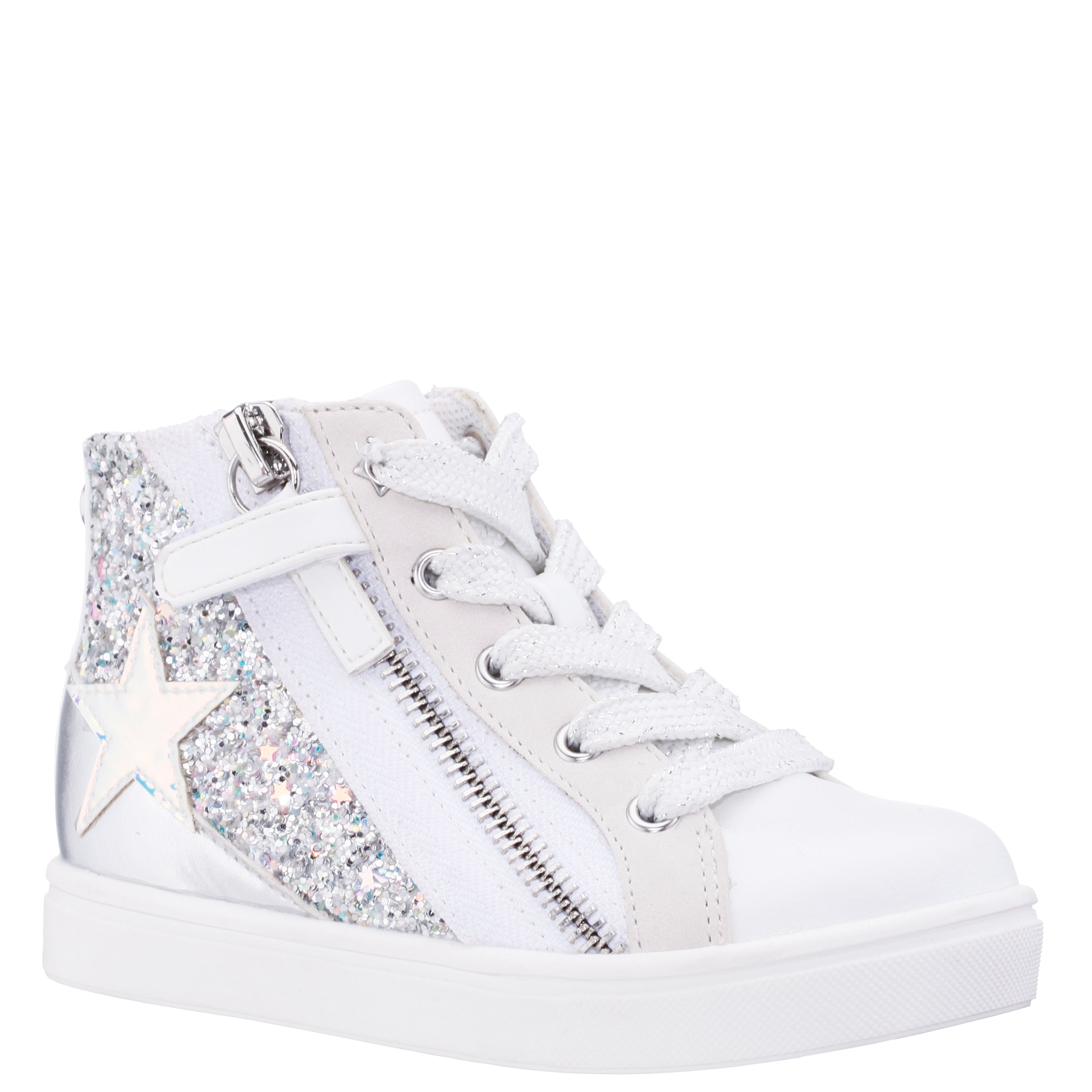Let her shine like a star in YUTI by Nina Shoes, a playful and stylish girls high top sneaker that’s all about sparkle and comfort. Designed with a glittery finish and bold star applique, this standout sneaker features a convenient outside zipper for easy on-and-off wear. Finished with classic laces, a soft memory foam insole, and a flexible non-slip sole, YUTI is the perfect pick for everyday fun, school style, and everything in between.