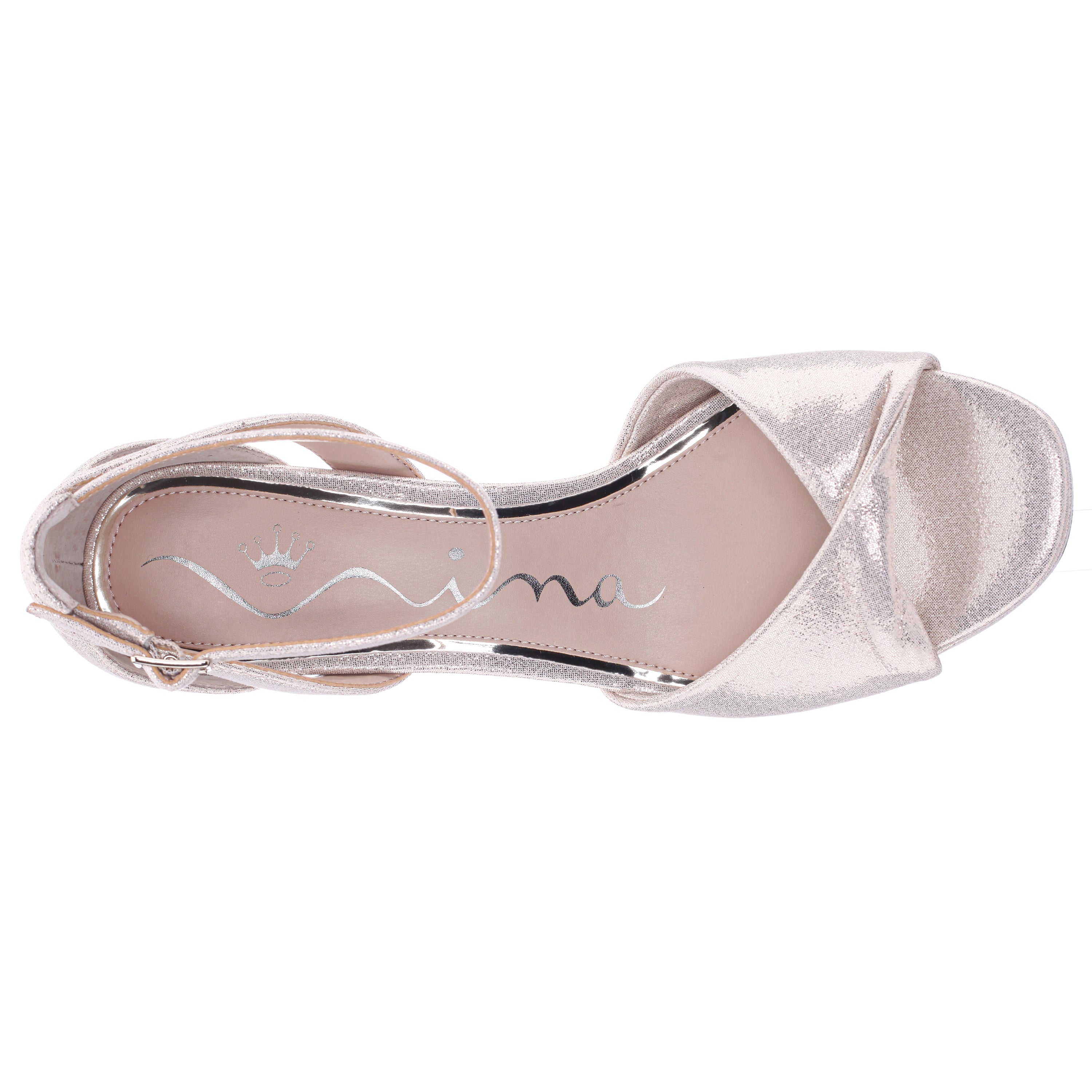 With their air of romance, the BRIZA sandal by Nina Shoes is surrounded by an aura of soft retro-style glamour. Perched on both a comfortable height platform and a mid-height shapely heel, the twist-front vamp features luscious-to-the-hand materials that enhance the style’s feminine look. This elegant sandal’s uniquely designed counter, with its peek-a-boo cut-out, supports the adjustable ankle strap, ensuring a snug fit as you enjoy your evening out.