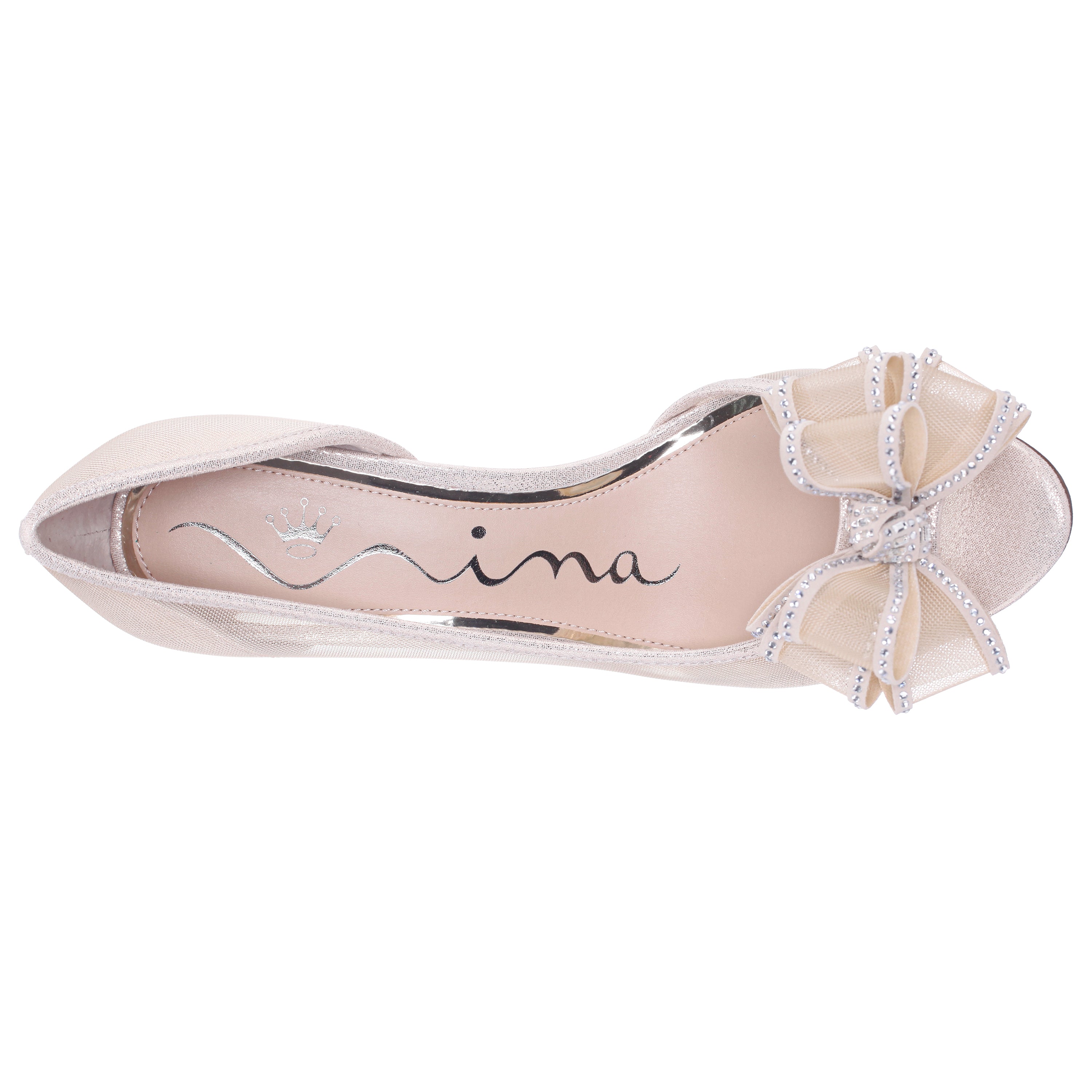 Wear a romantic ensemble or tailored trousers, FARRAH by Nina Shoes delivers undeniable elegance. This classic D'Orsay peep-toe pump strikes the perfect balance of playfulness and sophistication. A feminine bow of sheer mesh loops surrounds a satin knot edged with crystals, while the neutral mesh side-wall creates the illusion of a delicate metallic suedette border. Set on a comfortable 3-1/4" (82mm) high heel, Farrah speaks softly with special-occasion style.