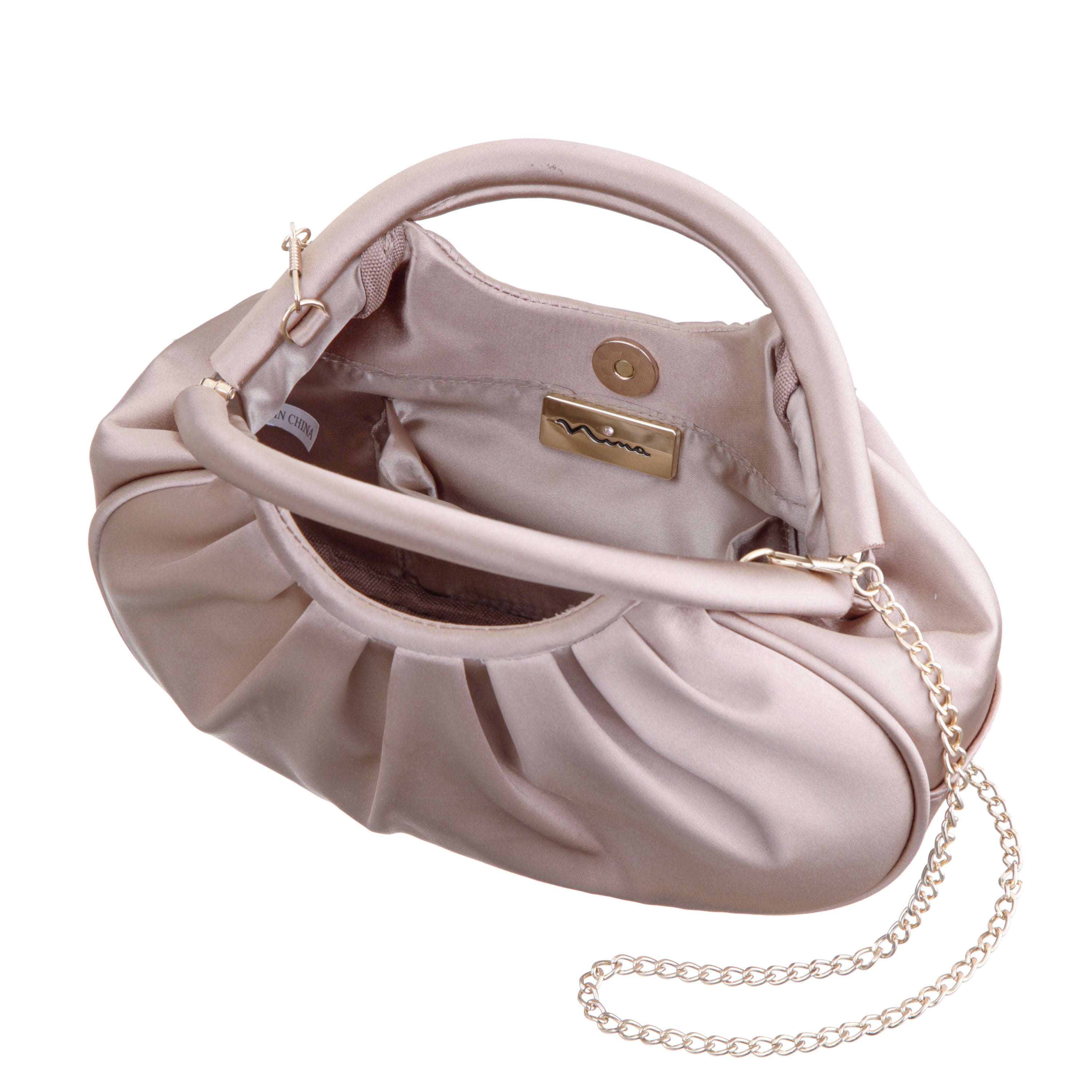 BREN is a modern and chic mini moon satchel, designed to bring a touch of effortless elegance to your evening ensemble. With its curved silhouette and sleek cut-out handle, this bag offers a contemporary twist on classic sophistication. Made from luxurious satin, its smooth, soft texture adds a refined touch to any outfit. The versatile design allows you to carry it as a top-handle bag or wear it as a shoulder bag with the 18" flat curb chain strap. Inside, a satin synthetic fabric lining and back interior wall pocket provide organization and practicality. The hidden magnetic closure maintains the bag’s sleek and seamless aesthetic while keeping your essentials secure. Whether you're attending a wedding, cocktail party, or night out, BREN by Nina is the perfect accessory for a modern, sophisticated look. For complementary styles, explore our satin shop or browse our newest arrivals.