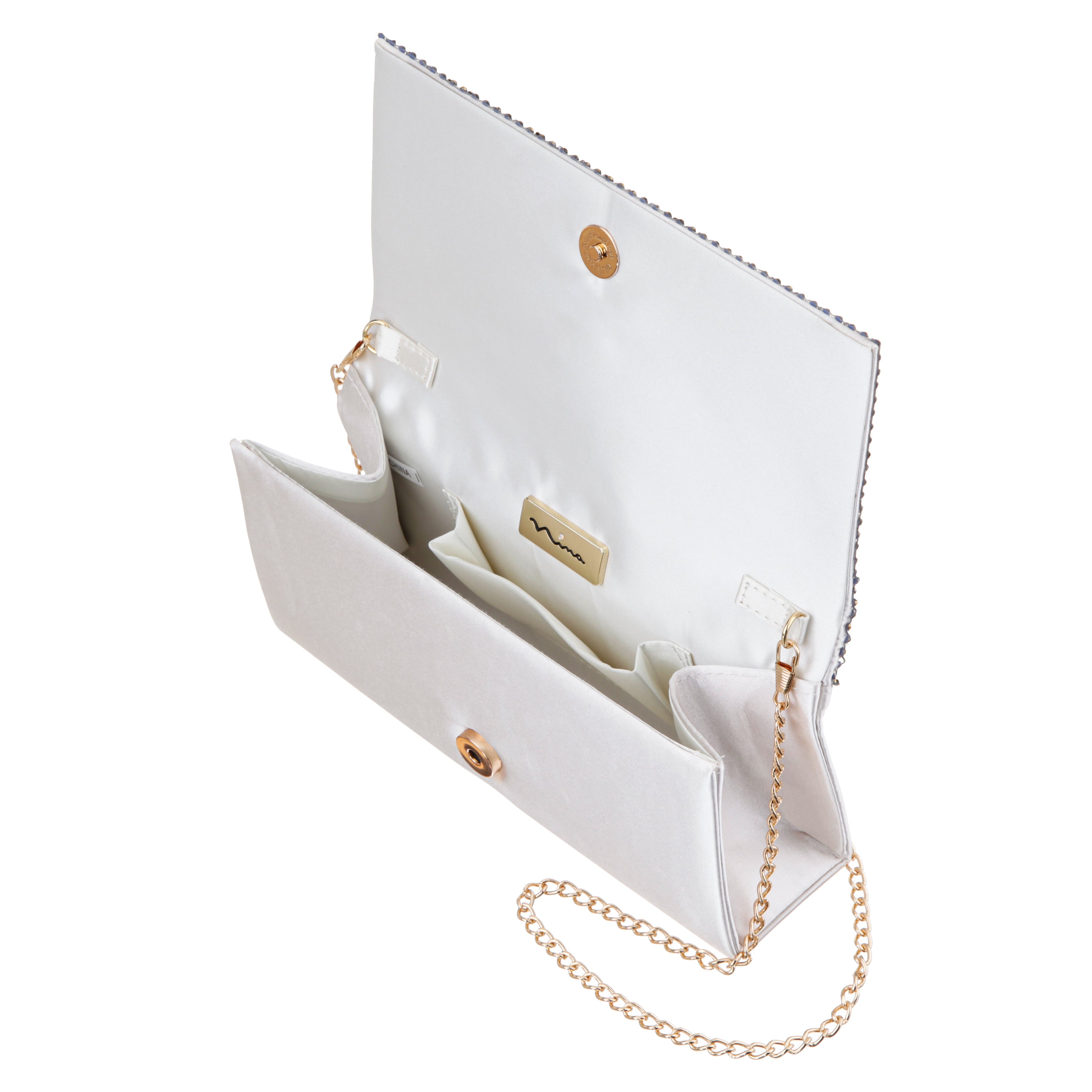 Chic and structured, the DEVA-P by Nina is a flap clutch that blends timeless elegance with a modern metallic twist. Crafted from smooth satin and detailed with a precise pattern of metallic studs across the front flap, this piece adds just the right amount of edge to your evening or occasion look. Carry it by hand or wear it on your shoulder—DEVA-P by Nina is the perfect finishing touch.