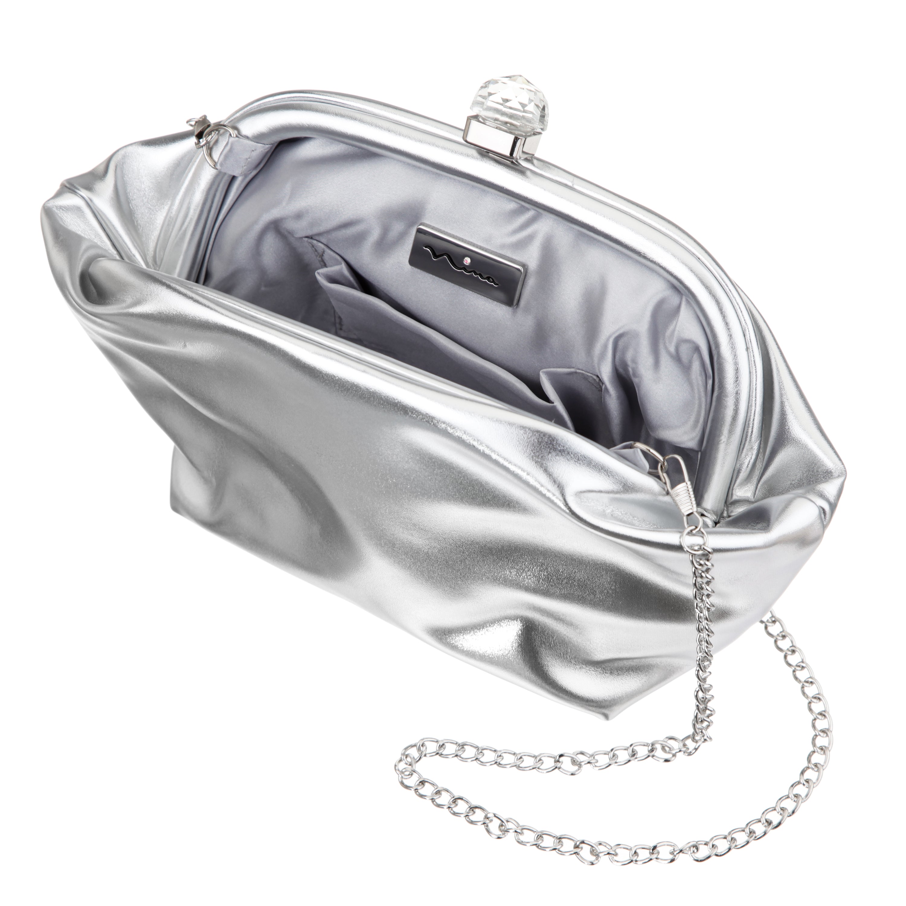 Glamour meets modern edge with the LYRIC-M by Nina. This elegant frame clutch features a shimmering metallic PU body and a stunning crystal clasp that catches the light with every movement. Sleek yet structured, it’s designed to elevate both everyday and evening looks with ease. With an optional strap and a roomy interior, LYRIC-M blends functionality and sparkle in perfect harmony.