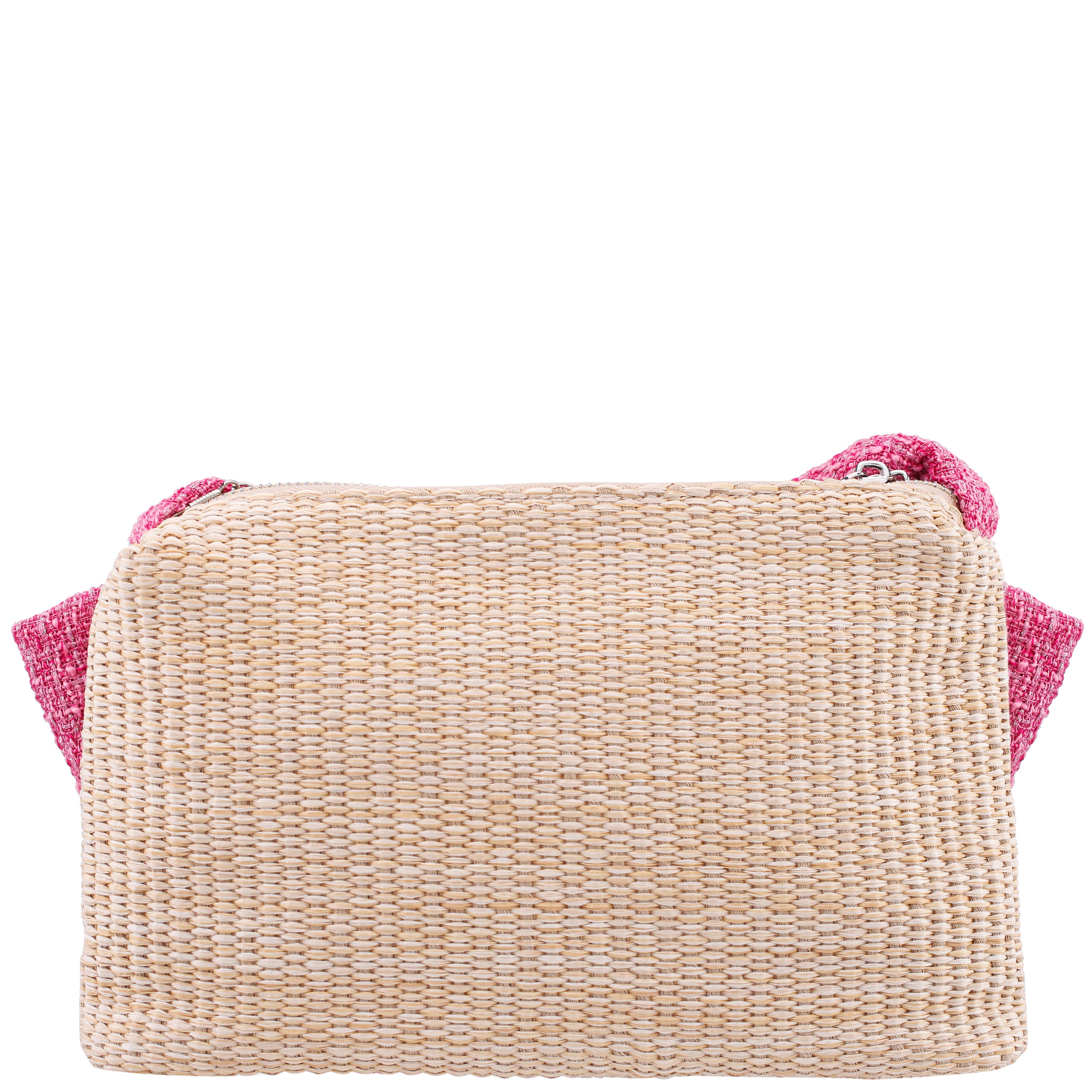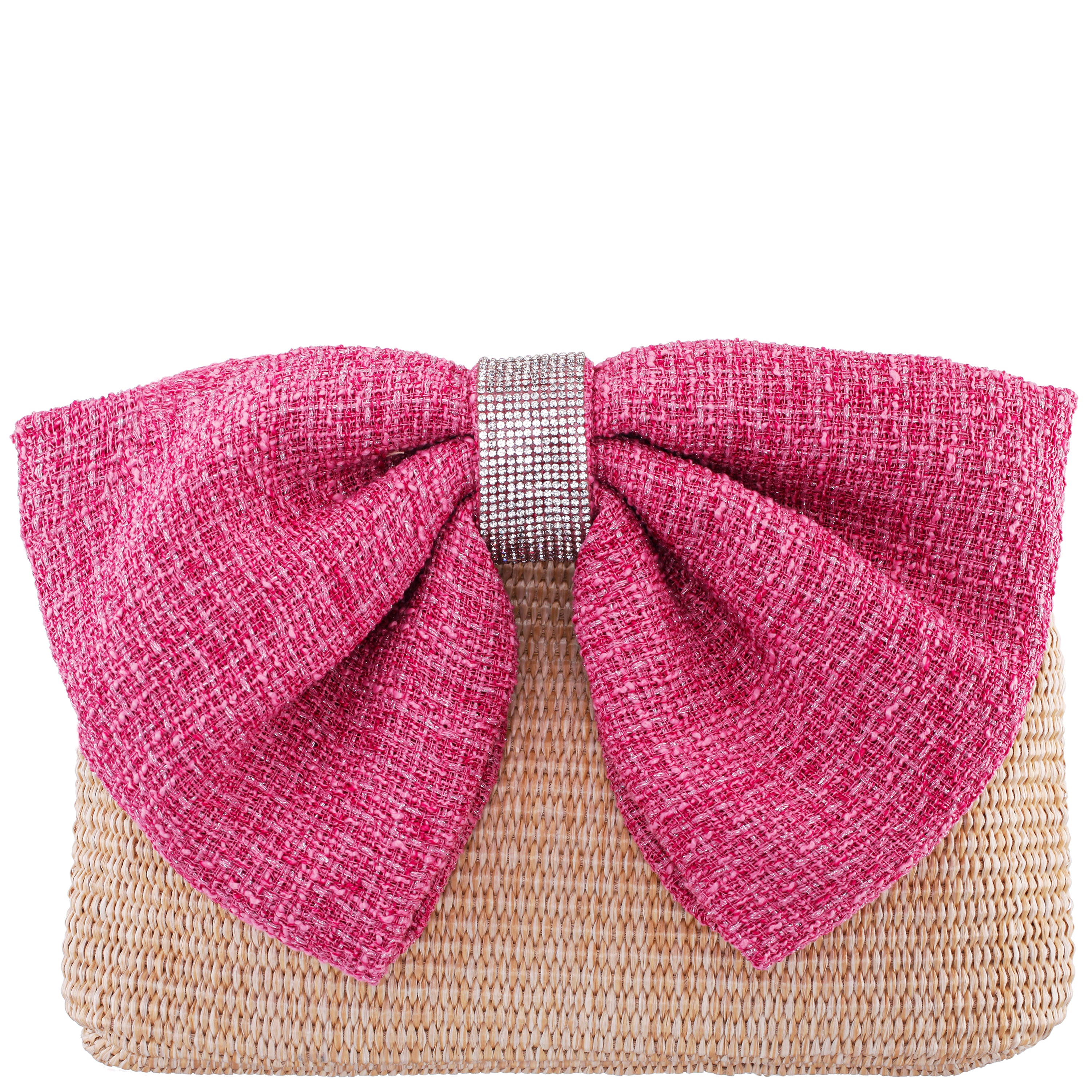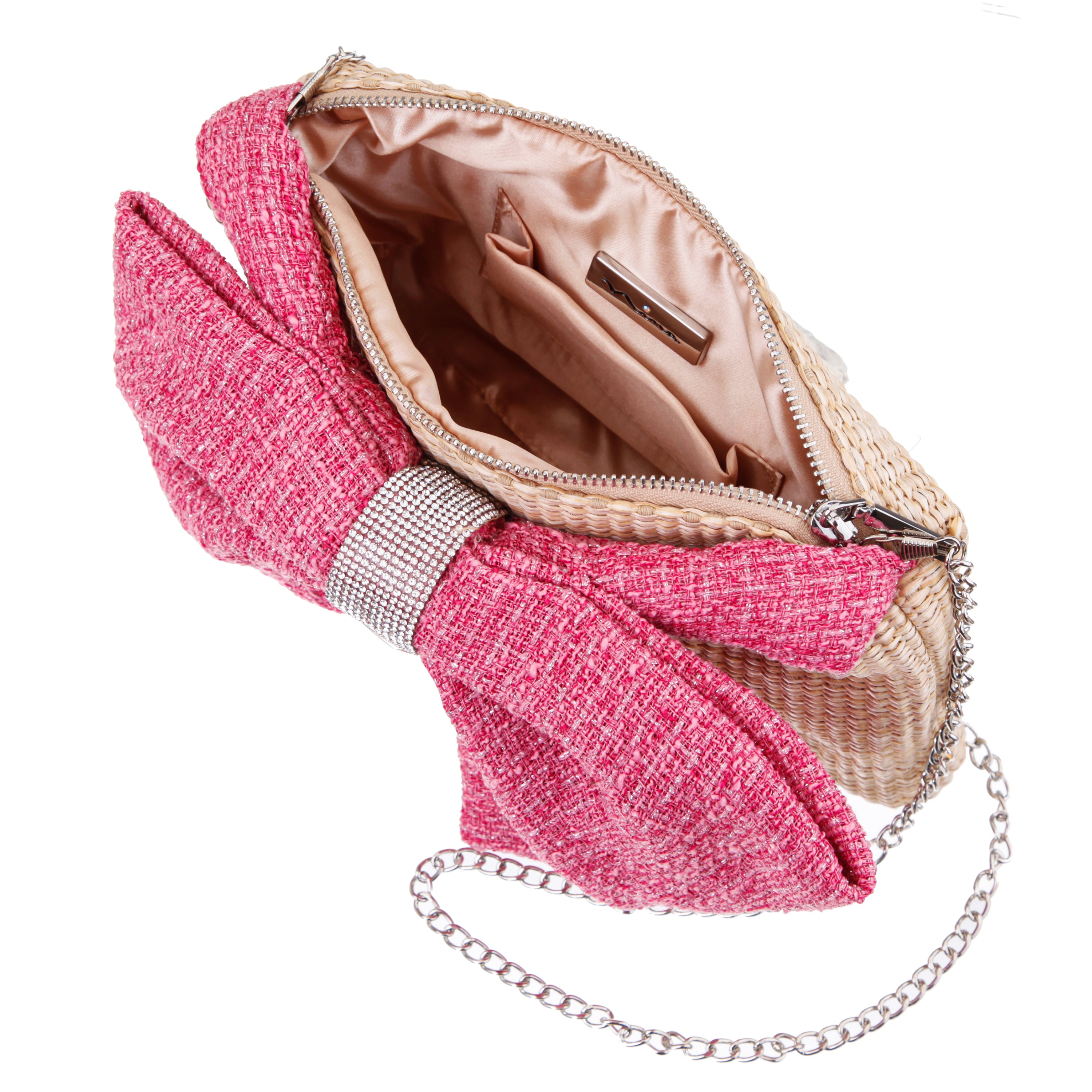 The TULA by Nina is a refined yet playful clutch designed for warm-weather occasions. Crafted from woven PP straw, this hand slip-thru silhouette is adorned with a charming lightweight Spring tweed bow, finished with a delicate crystal center for just the right amount of sparkle. A zip-top closure keeps things secure, while the optional chain strap lets you go hands-free. From garden parties to daytime soirées, the TULA by Nina adds polished texture and whimsical elegance to your look.