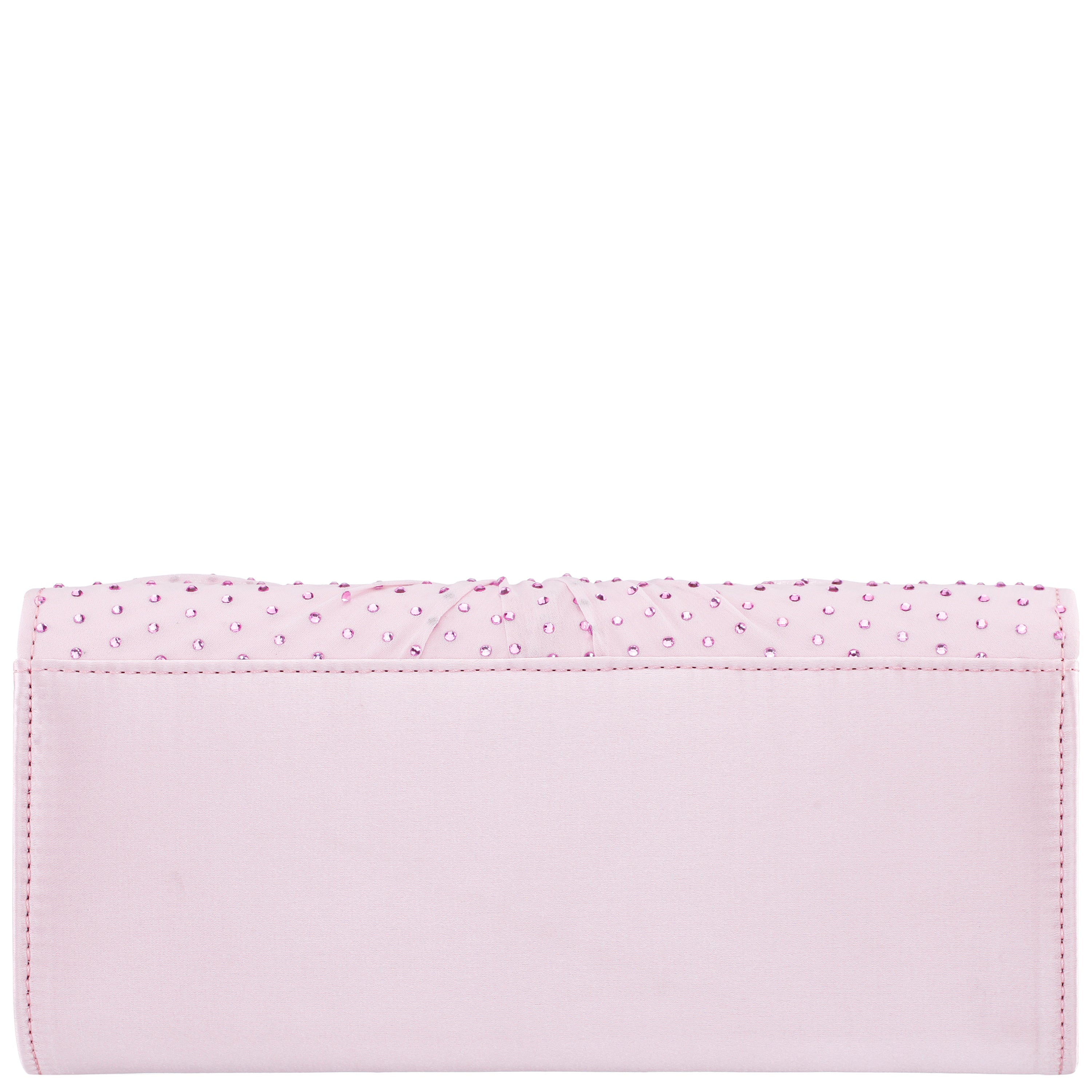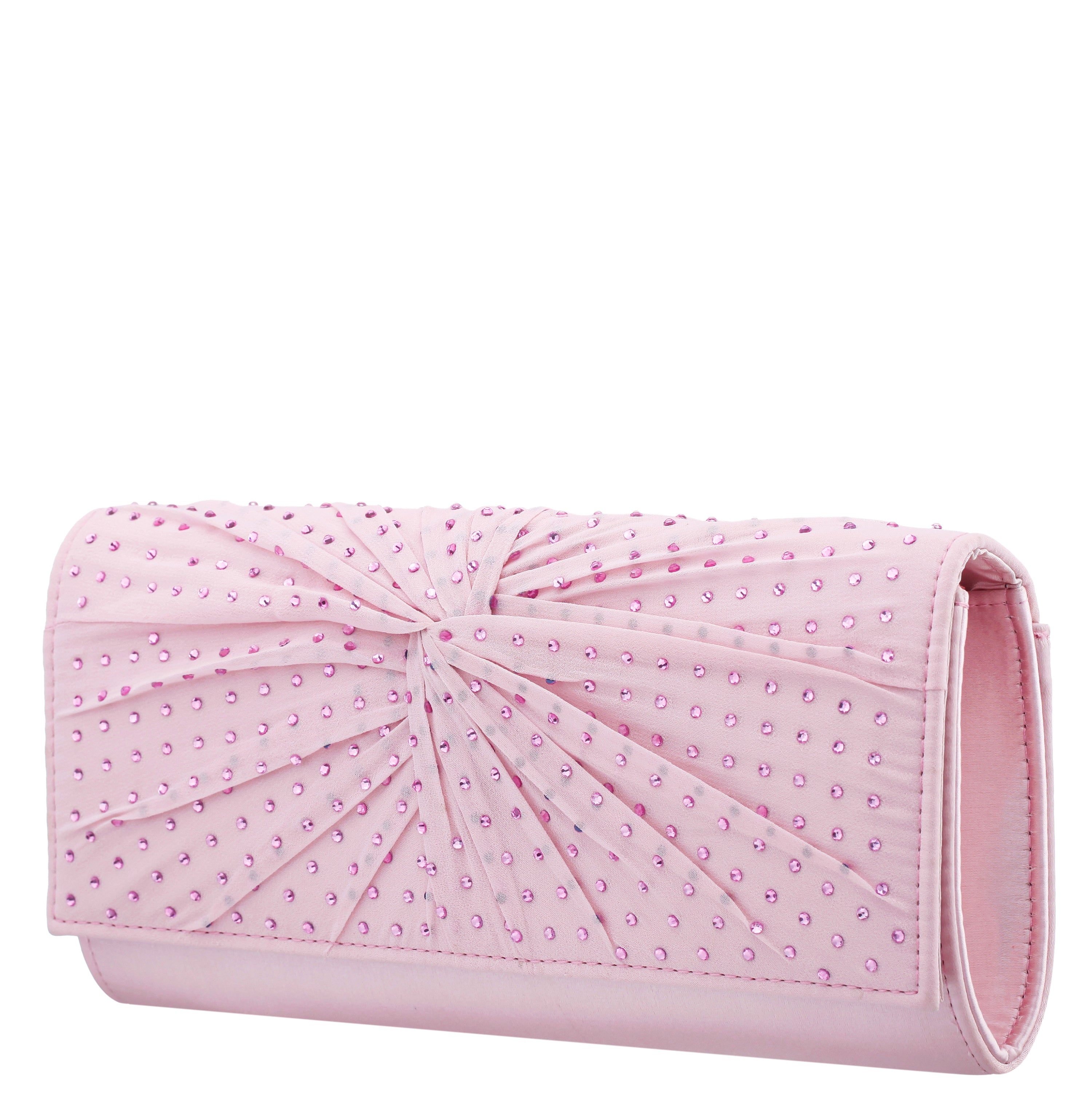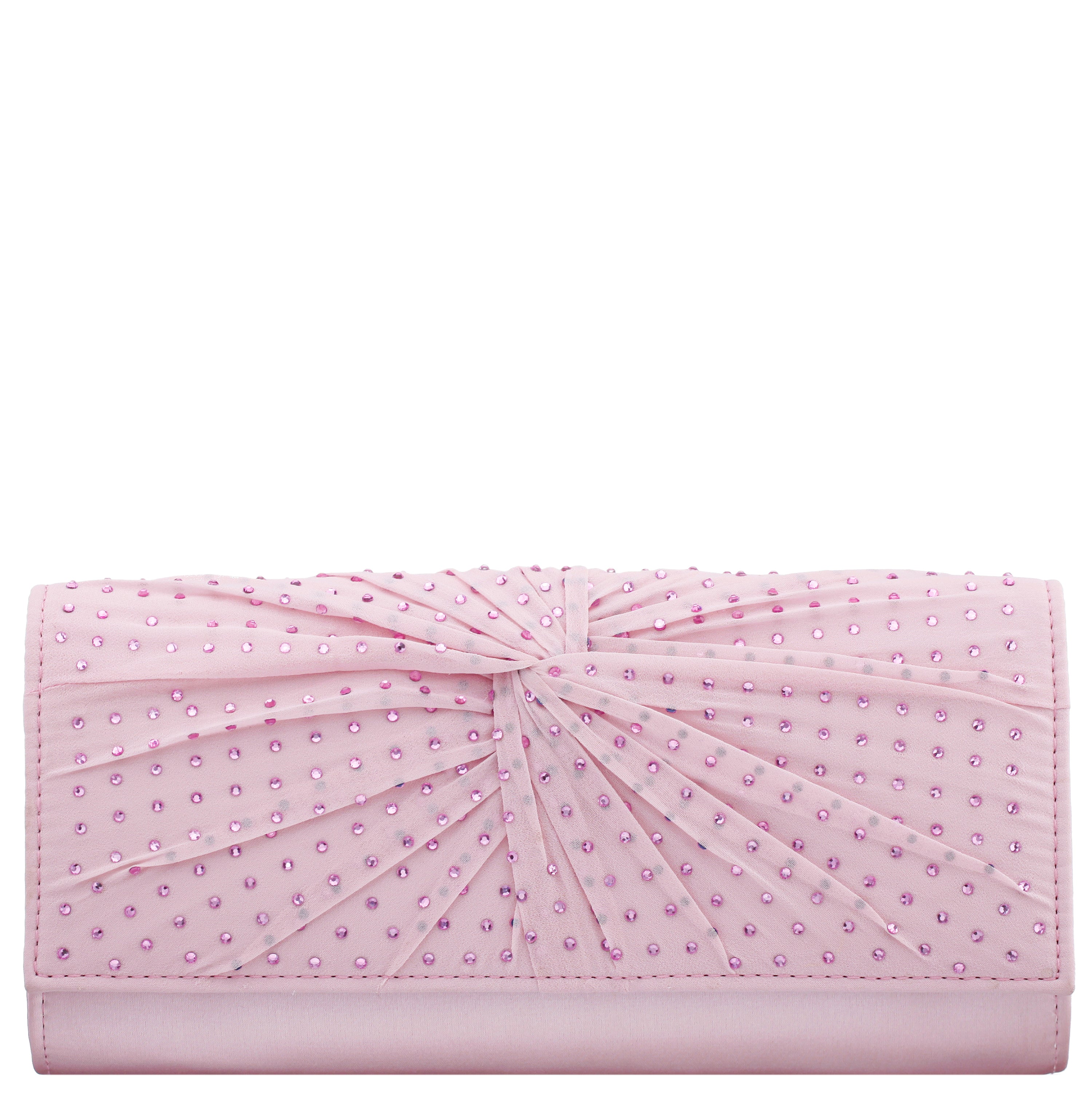 The UNIQUE by Nina is a dreamy fusion of texture, shimmer, and statement detail. Crafted with a chiffon and satin body, this elegant clutch features a chiffon front flap adorned with a soft twist detail and a scattering of crystals that sparkle with every movement. Its refined silhouette makes it perfect for evening occasions, while the optional 18" drop-length chain strap offers hands-free versatility. With its layered textures and delicate shine, the UNIQUE by Nina is as graceful as it is glamorous.