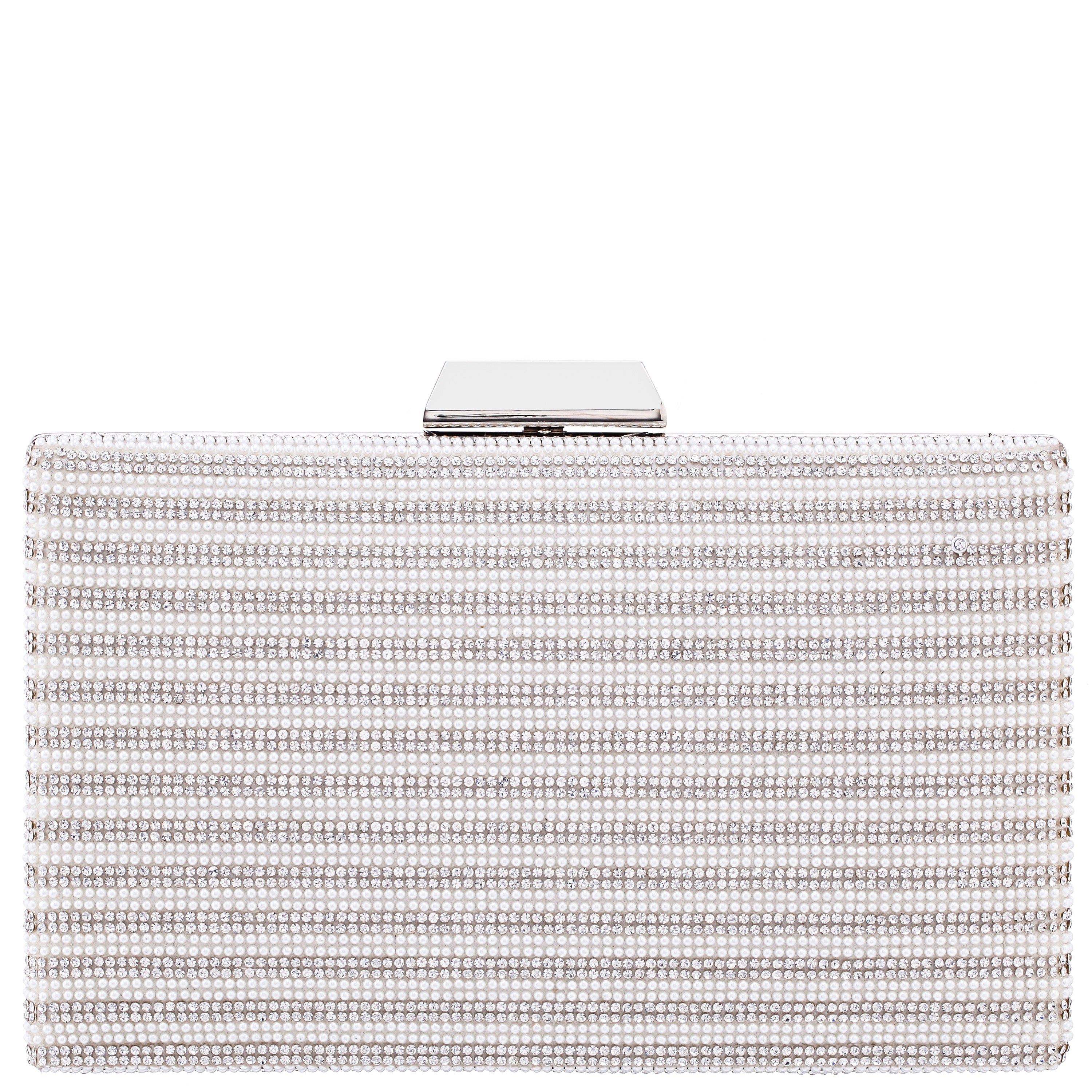 Tiny crystals and pearls catch the light on this stunning clutch outfitted with a removable drop-in chain strap.