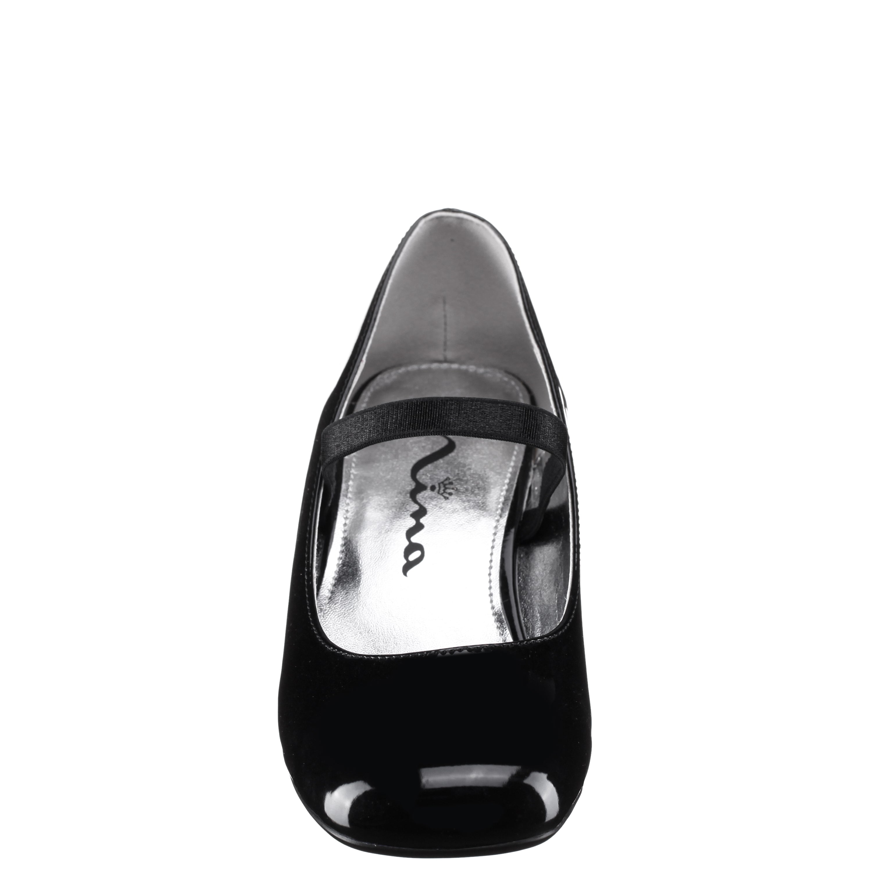 Step into modern elegance with TEVI by Nina Shoes, a chic girls dress shoe designed to elevate every special occasion. With its trendy square toe and flared heel, this pump offers a stylish update to a timeless silhouette. An elastic strap across the instep ensures a secure fit, while the soft memory foam insole and flexible non-slip sole keep her comfortable and confident all day. Whether for celebrations or polished everyday wear, TEVI is the go-to style for girls who love to shine.