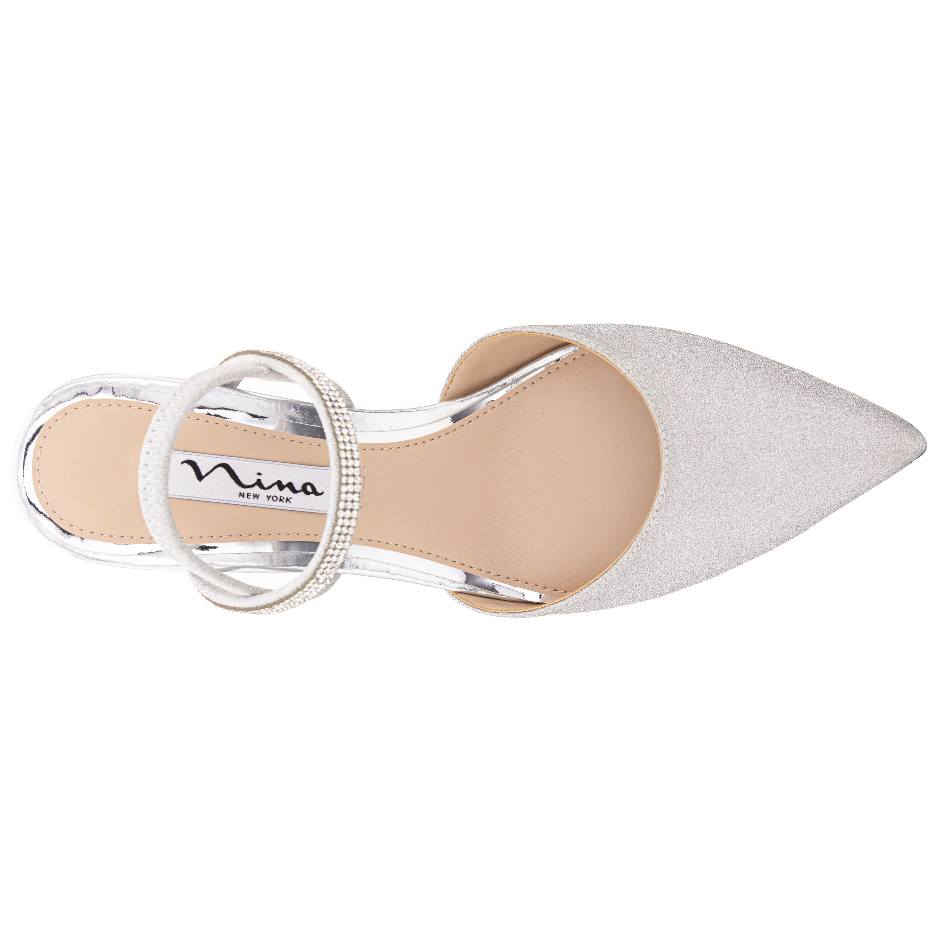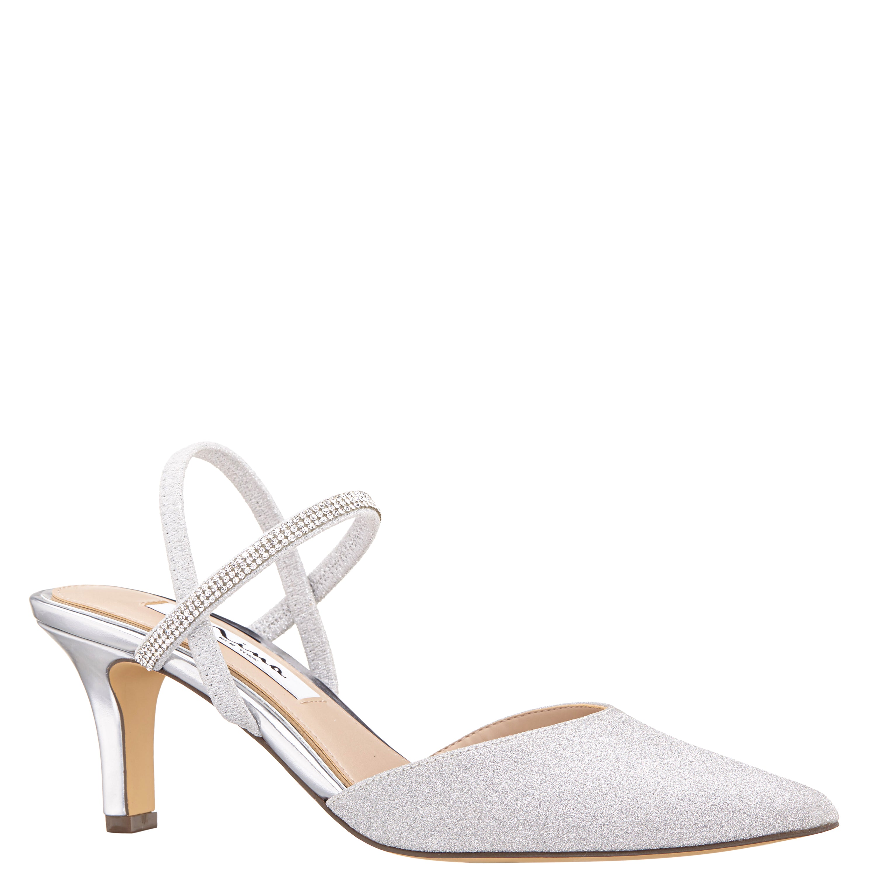 Simply stunning and so easy to wear, BIllie by Nina, is adorned with a crystal covered elastic instep strap for easy entry, as well as an elastic heel strap for a secure fit. Set on a universal mid-height heel, this pump compliments any event outfit from a pantsuit to a gown. Offered in an array of glamorous materializations.
