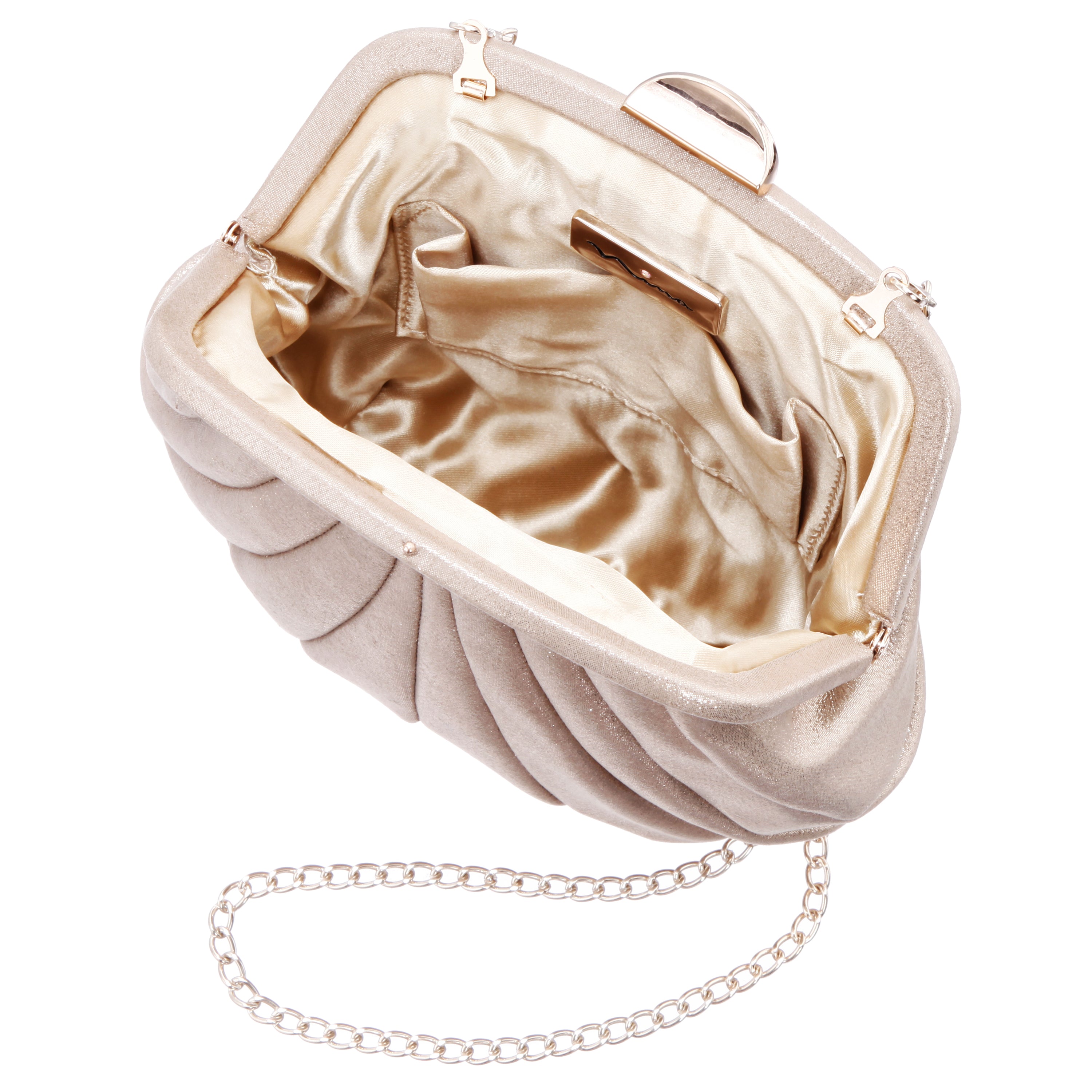 This art-deco inspired metallic frame bag is elegant in its simplicity and adds a regality to any ensemble.