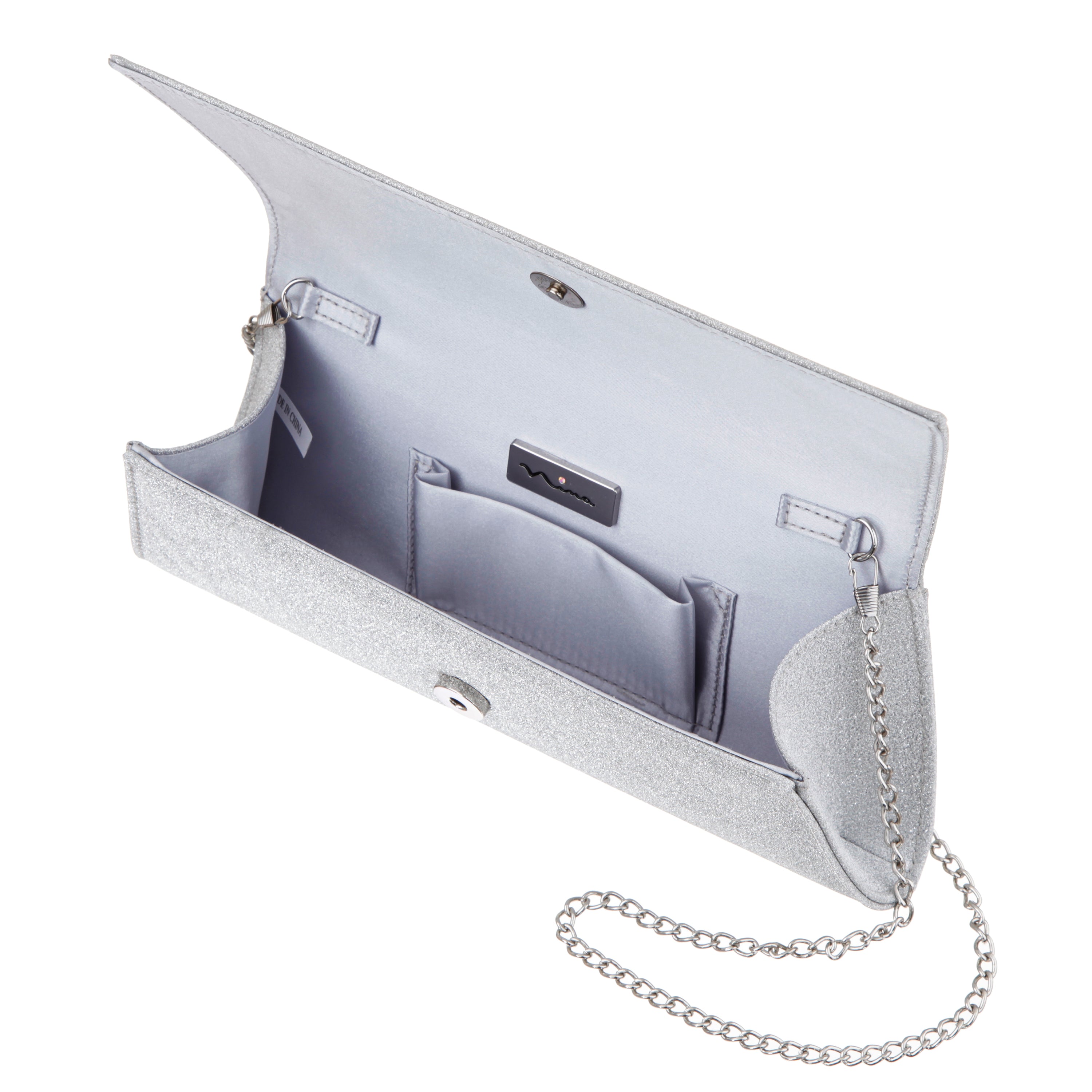 Bring a touch of refined sparkle to your evening look with the ZOEY by Nina. This slim clutch features a softly curved flap silhouette and is crafted in radiant glitter fabric that catches the light with every move. The minimalist shape is elevated by its shimmering texture and optional flat curb chain strap, allowing you to wear it as a clutch or shoulder bag. Whether you're headed to a cocktail hour or formal soirée, ZOEY by Nina adds effortless glam to any outfit.