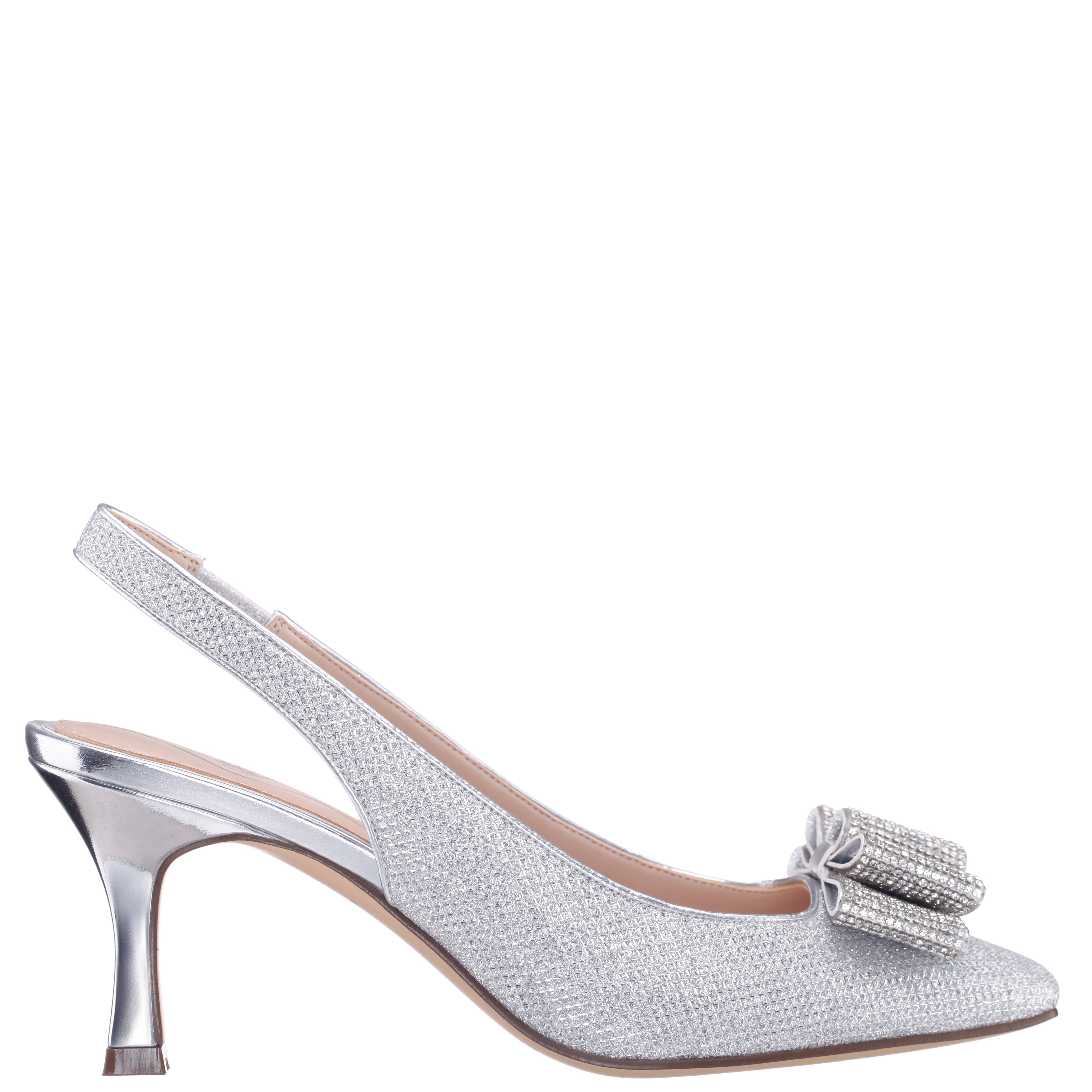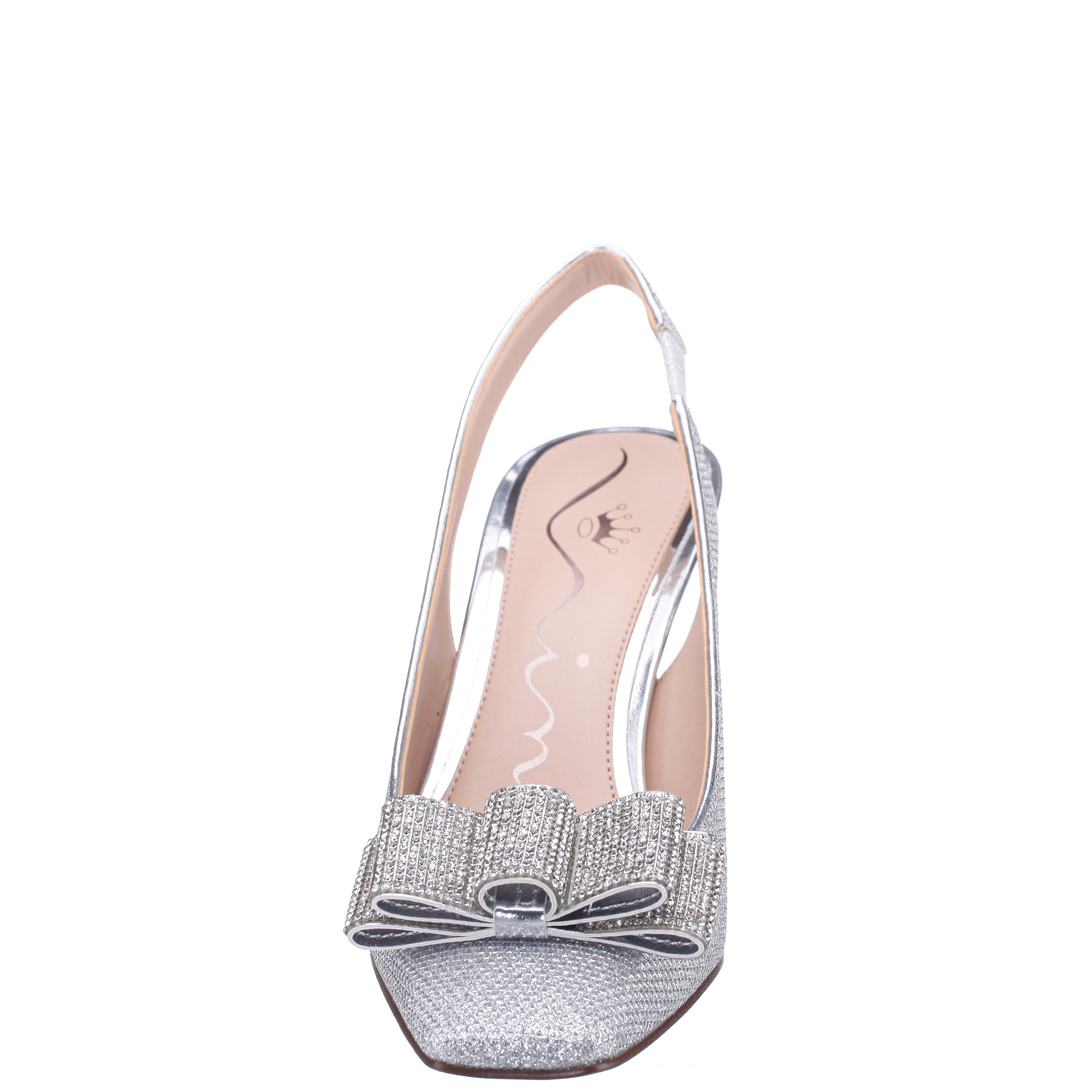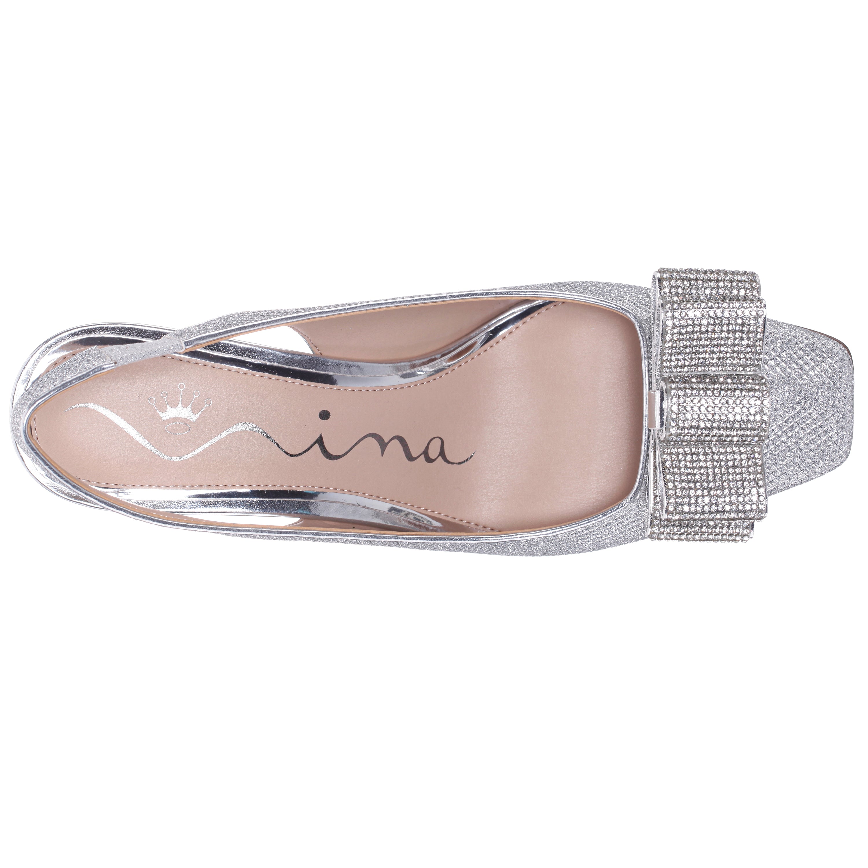 Designed to captivate, JOLANDA by Nina Shoes is a chic slingback pump that embodies modern elegance. Its softly squared toe and flattering throatline create a leg-lengthening effect, while the 2-3/4" (71mm) mid heel delivers both comfort and height. Offered in plush velvets or sparkling mesh, this pump is elevated by a double-layer crystal bow that shimmers with every step. Glamorous and chic, JOLANDA transitions seamlessly from cocktail hour to black-tie affairs. For complementary styles, explore our satin shop or browse our newest arrivals.