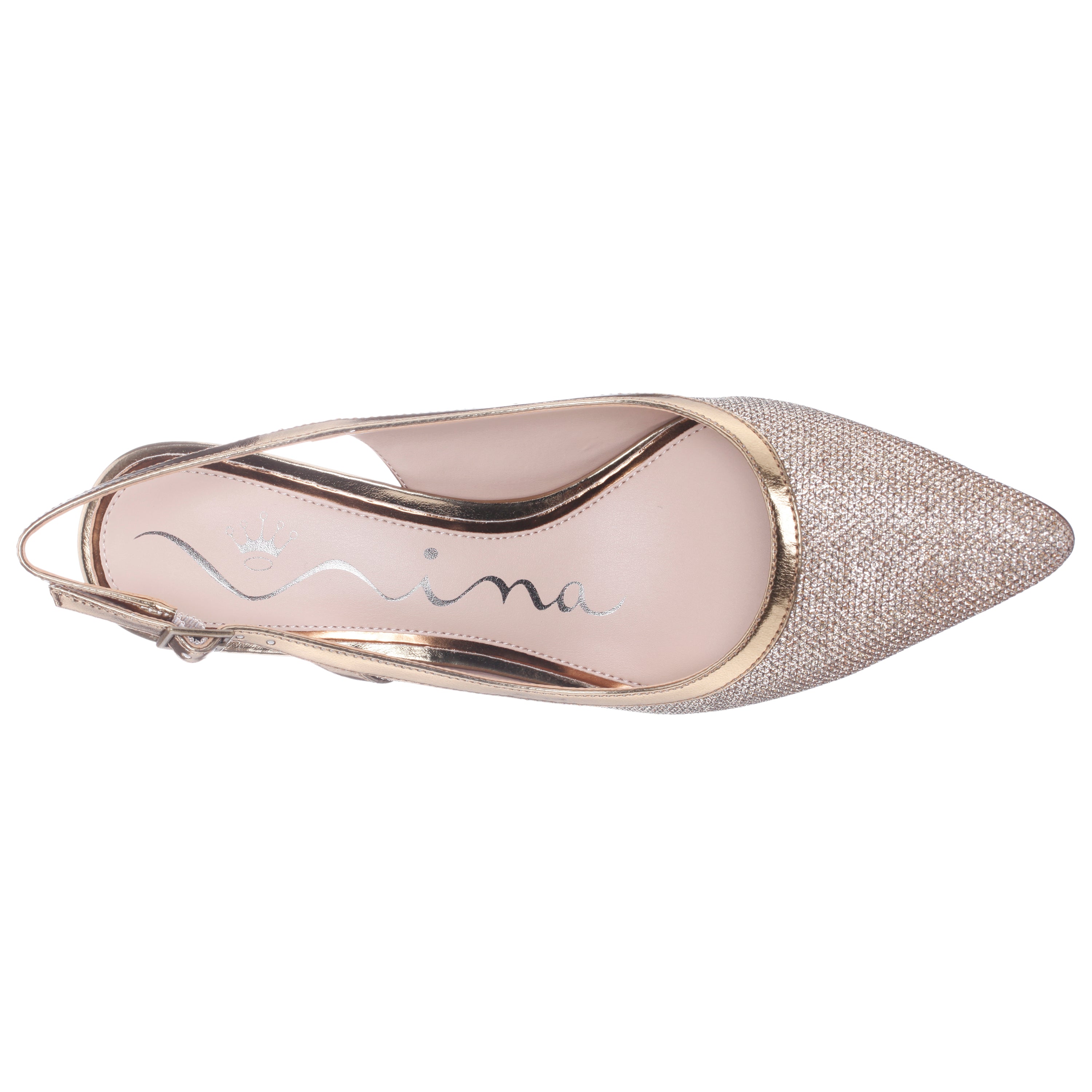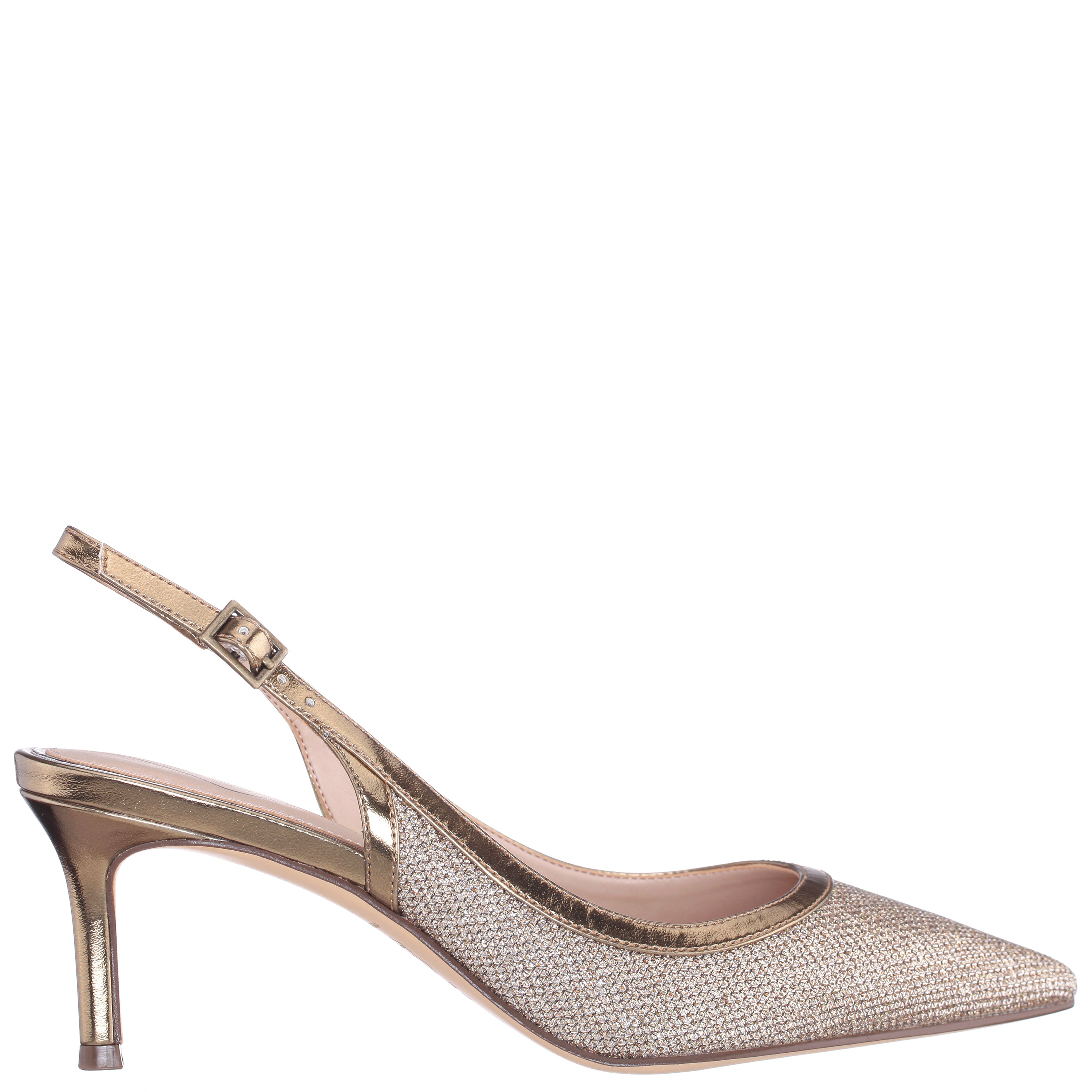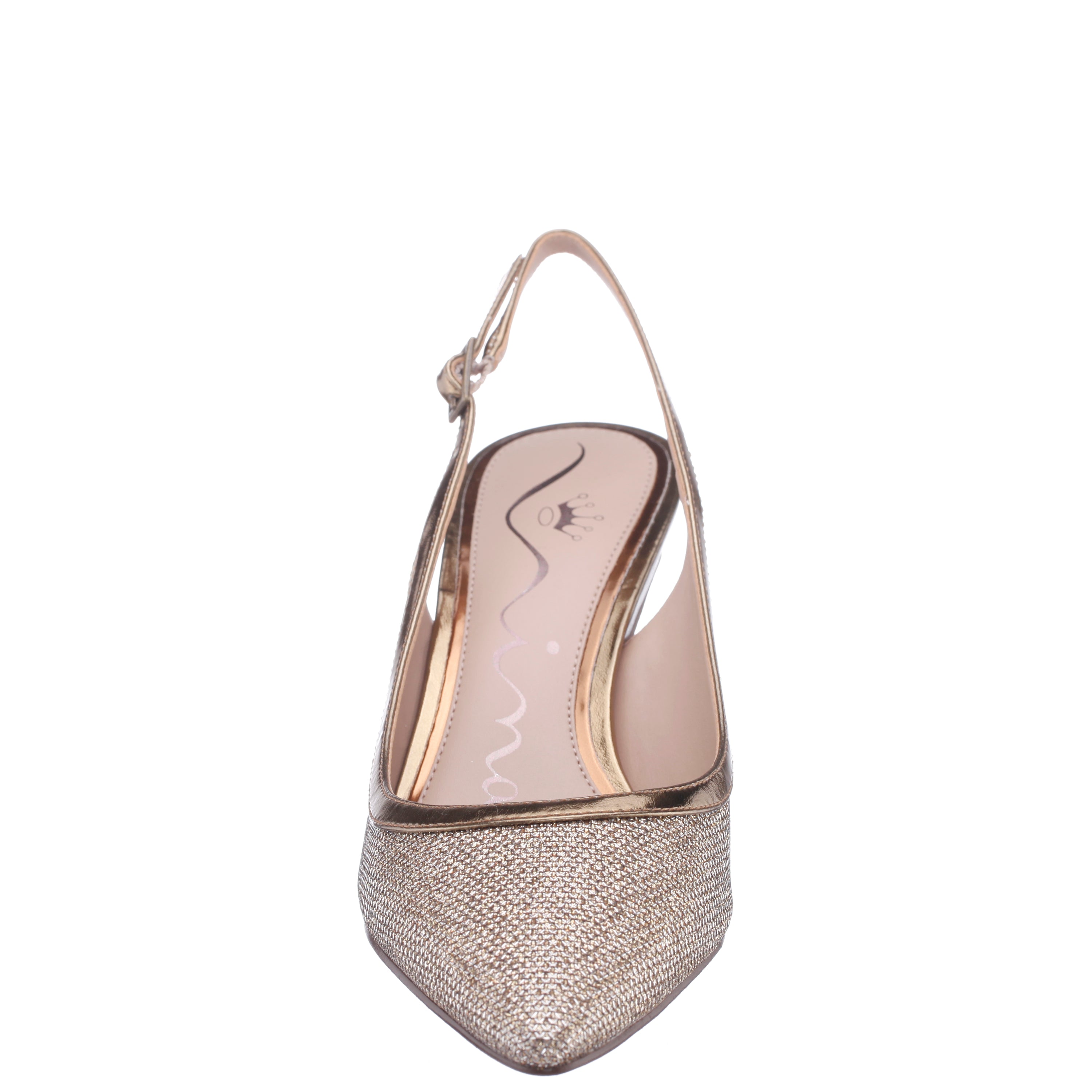 A pump for all seasons, NAZURI by Nina Shoes is a classic slingback pump designed in a fresh, trend-right material with just the right touch of metallic shine to complete and complement any day or night ensemble. Set on a shapely mid-height heel, with an elegant pointed toe and an adjustable slingback strap, NAZURI by Nina Shoes adds modern elegance without compromising comfort.