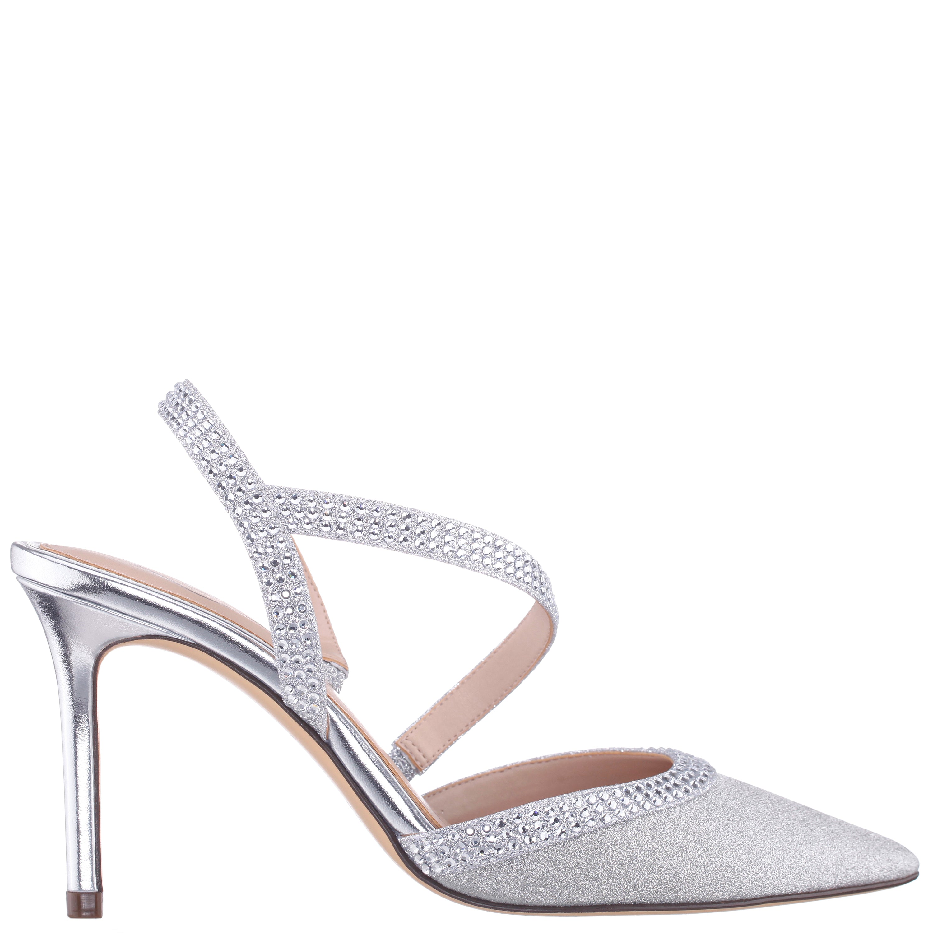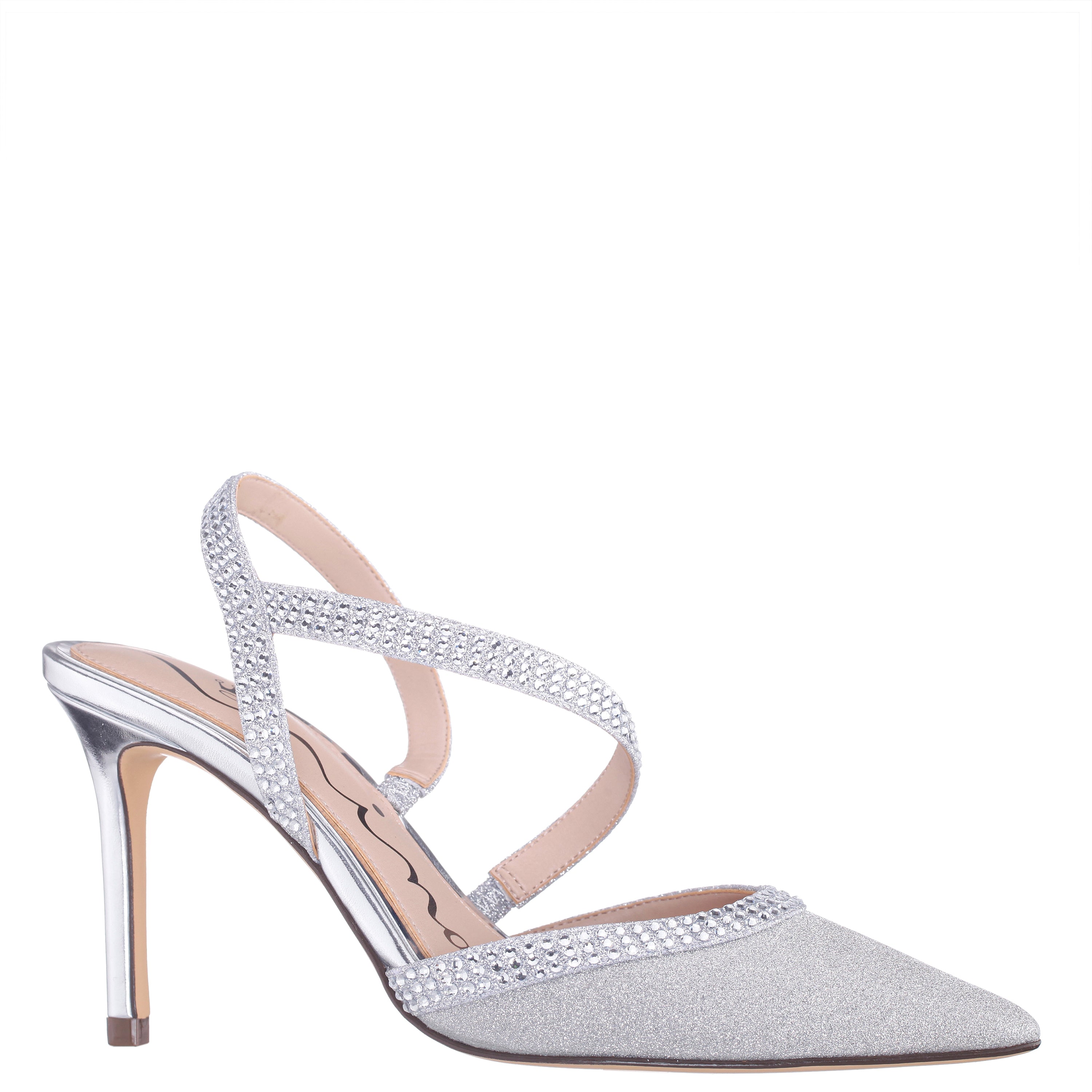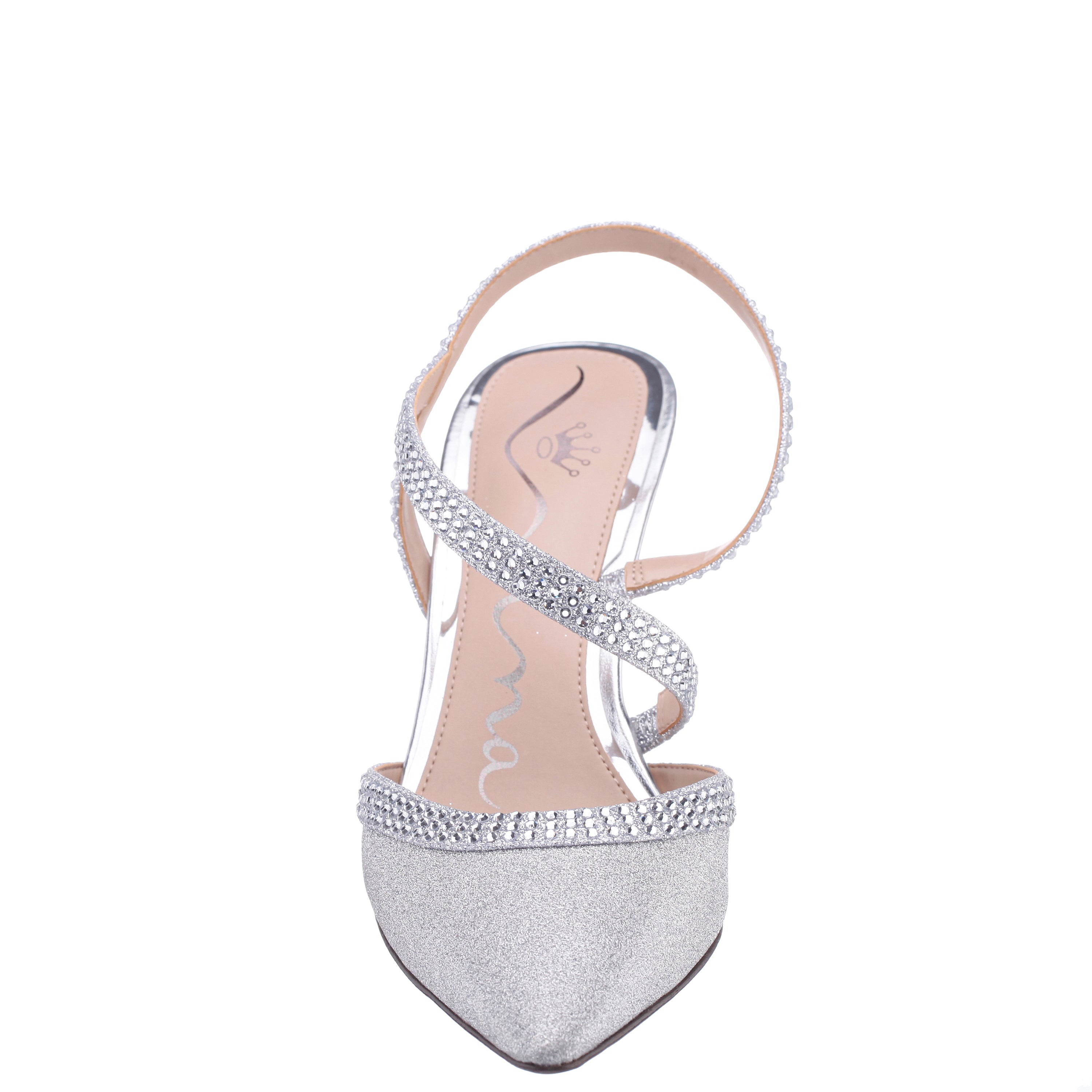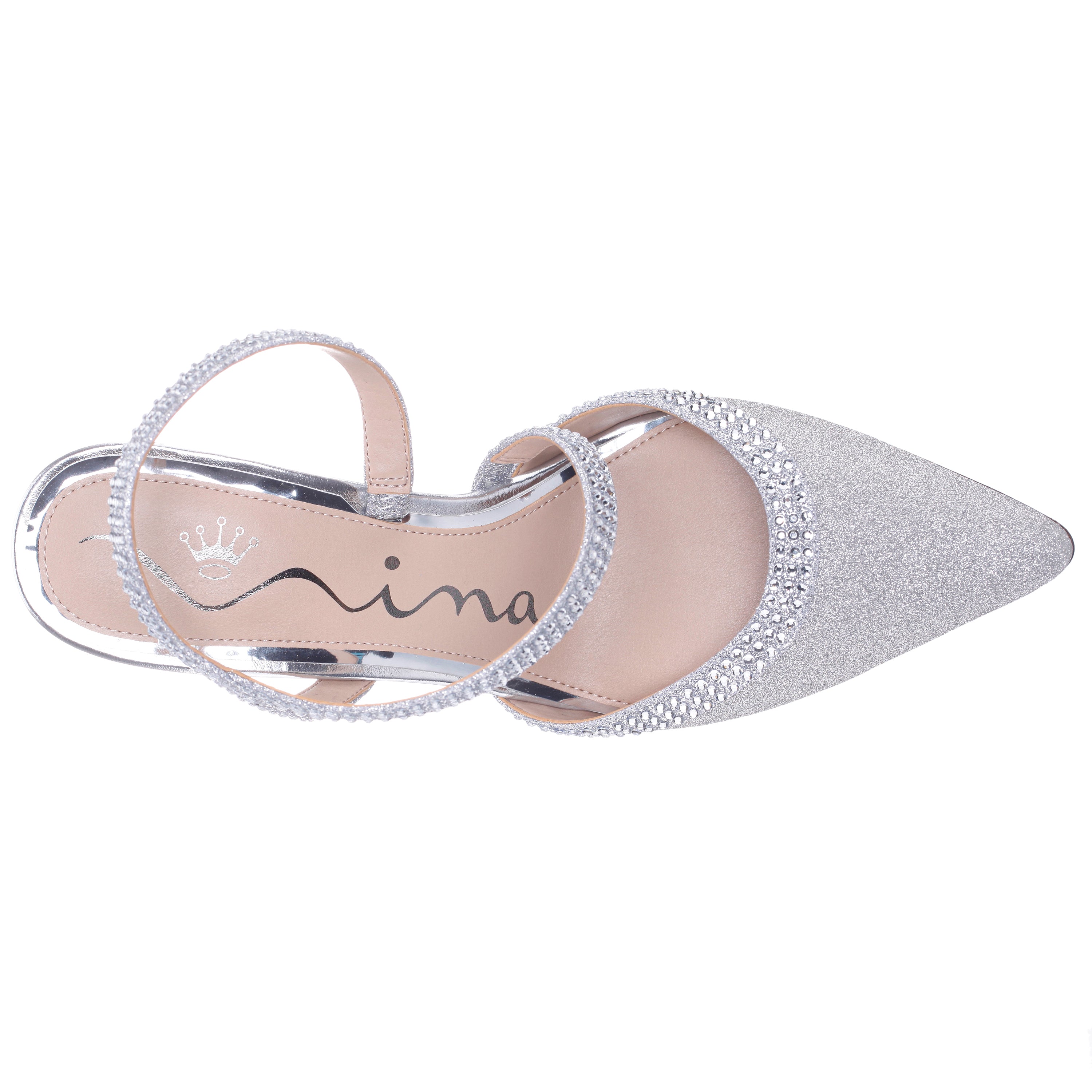 Bold yet elegant, NICARA by Nina Shoes is a sophisticated pointed-toe pump adorned with sparkling crystal-accented details. A slender strap, fully covered in matching crystals, wraps gracefully across the instep to create a stunning silhouette. Designed with a lightly cushioned insole for comfort, this pump brings event-worthy glamour to ensure you look and feel your best, wherever you go.