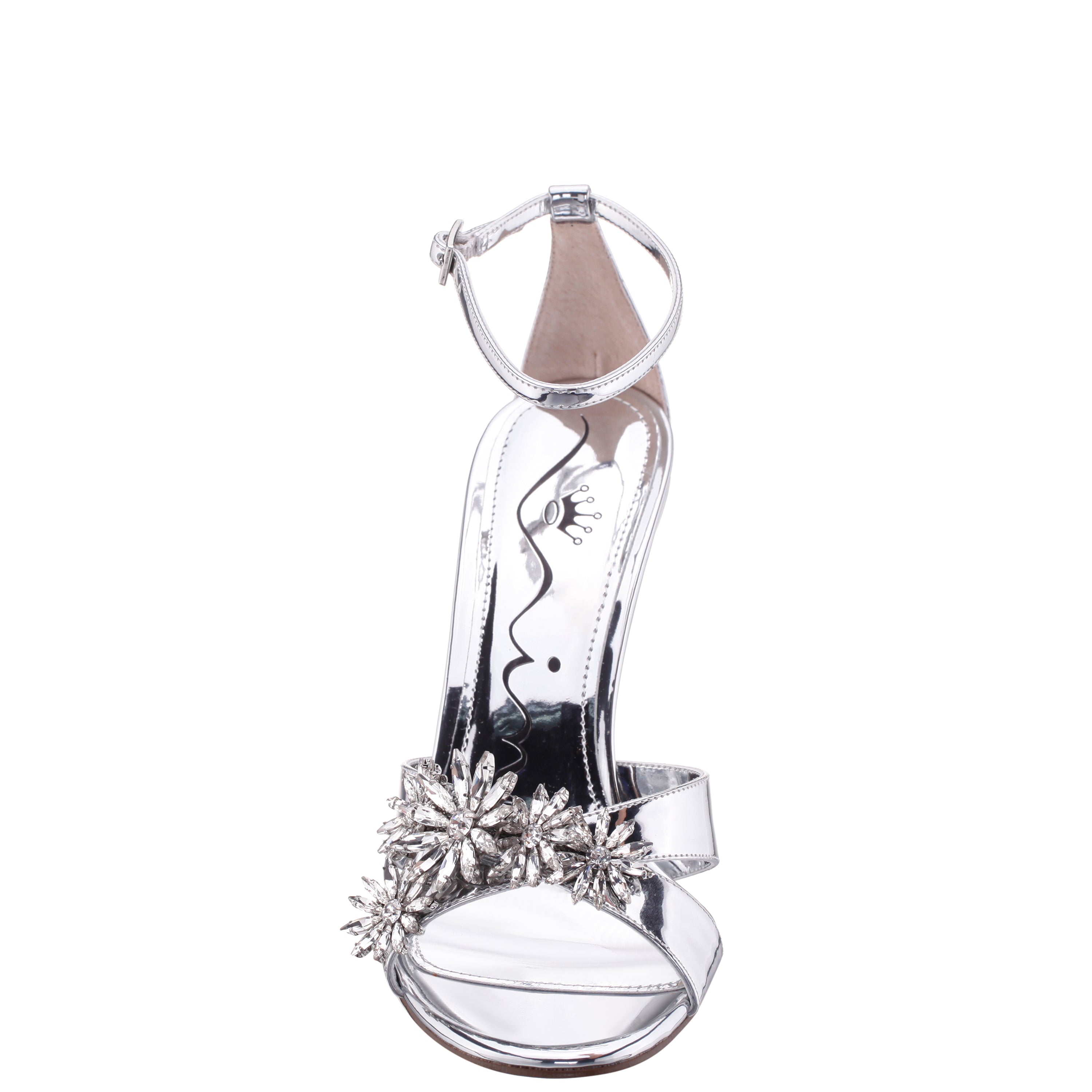 SILVER CHROME GLAZE HIGH-HEEL SANDALS WITH CRYSTAL FLOWER EMBELLISHMENT