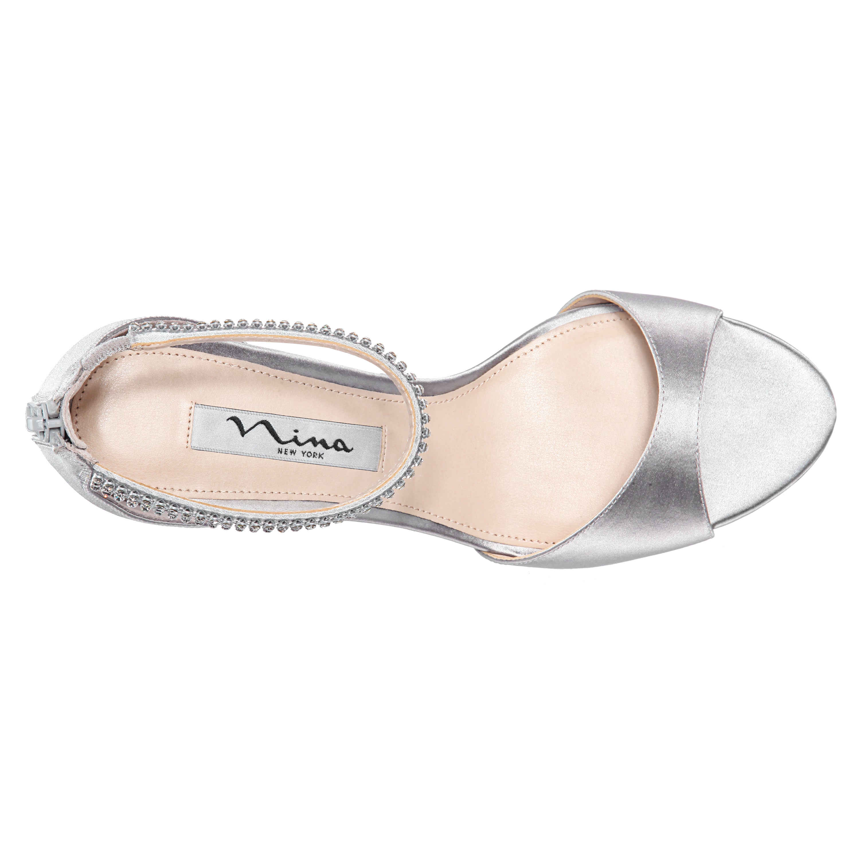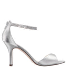 NEW SILVER SATIN WITH CRYSTAL ANKLE-BRACELET SANDALS AND ZIPPER ENTRY ON A MID-HEEL
