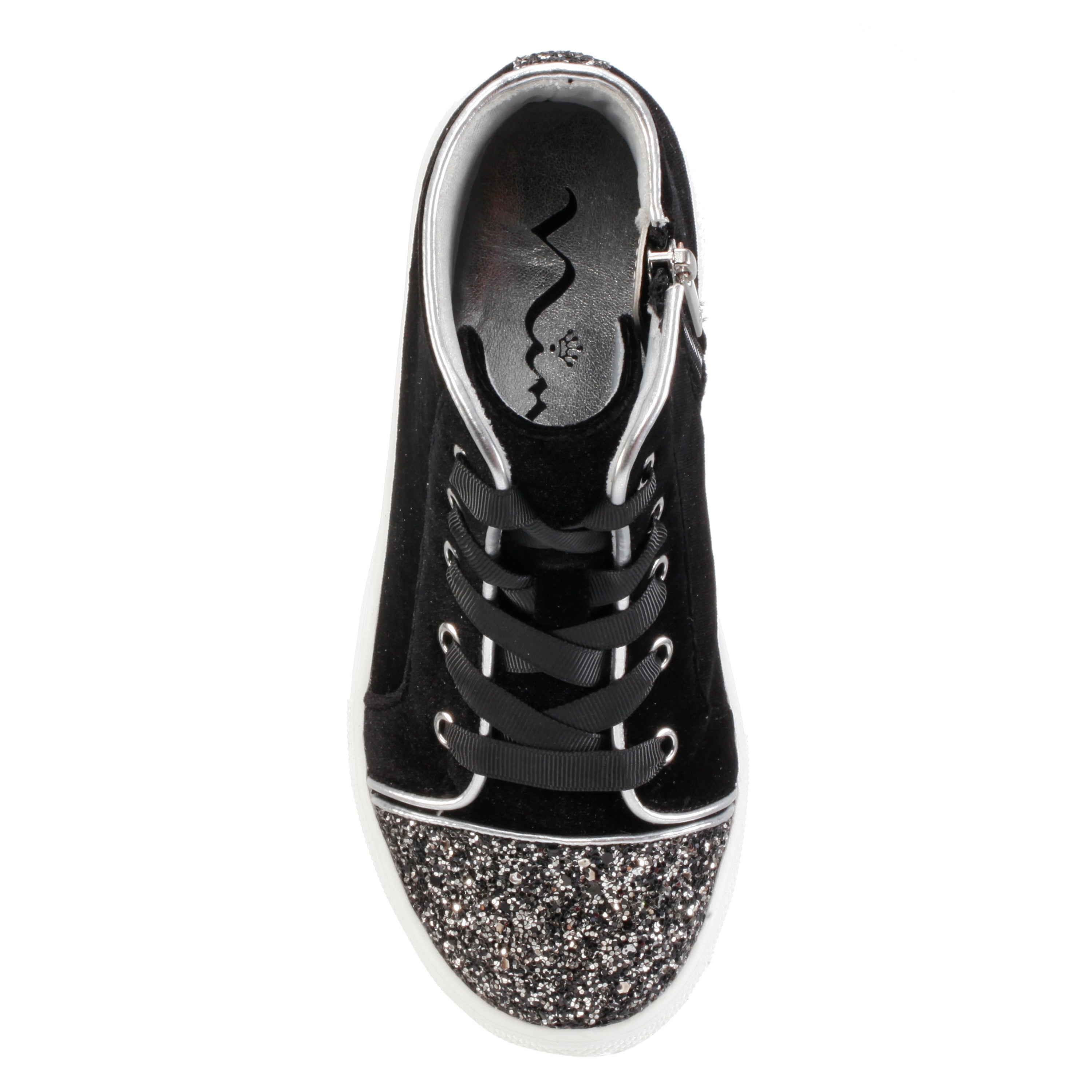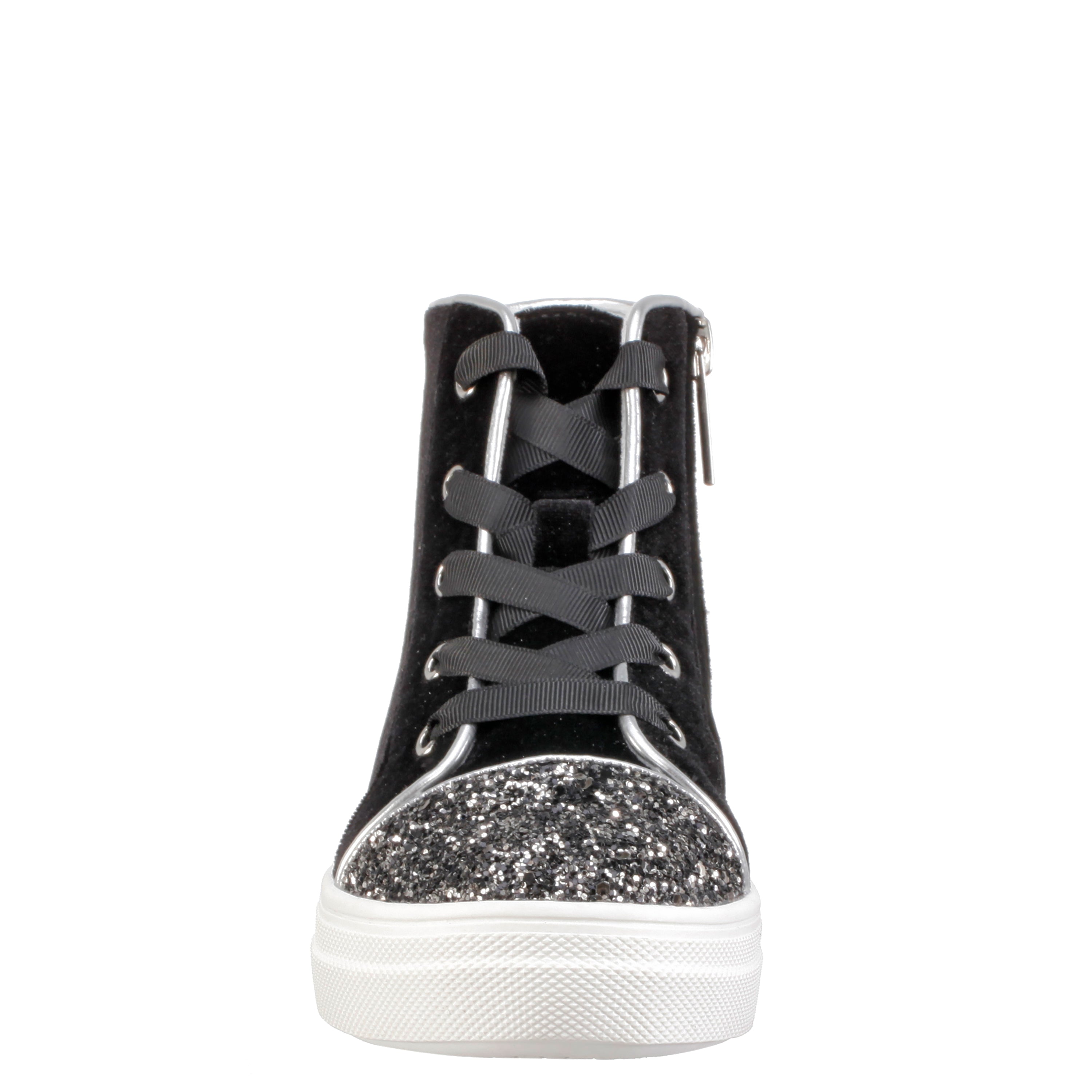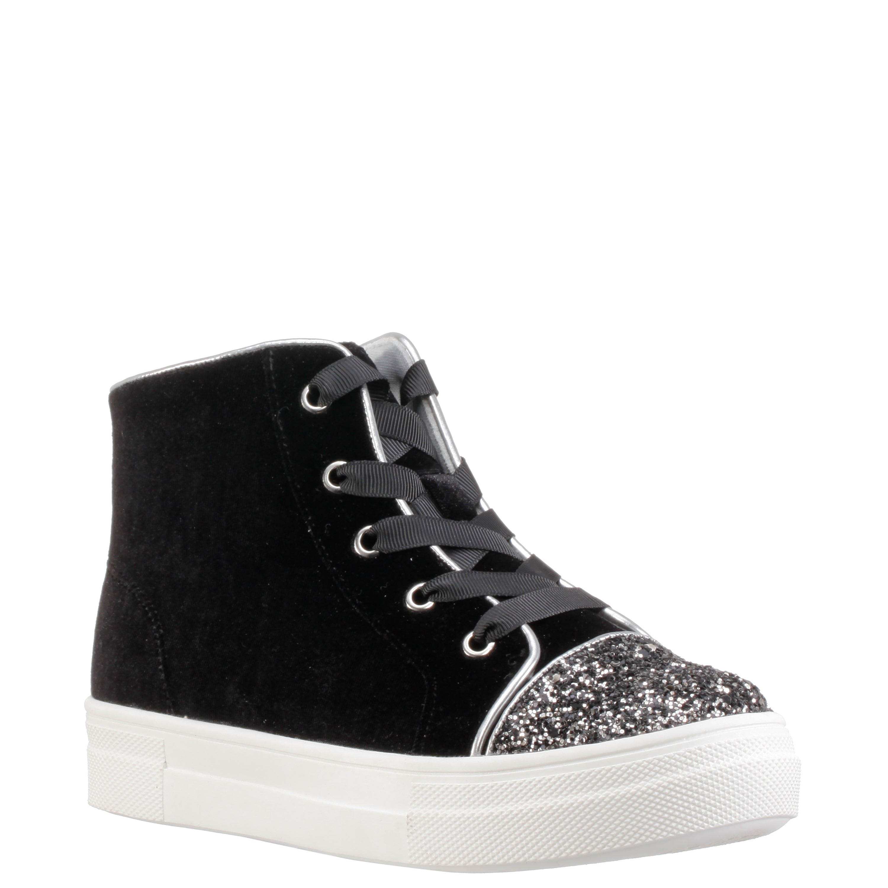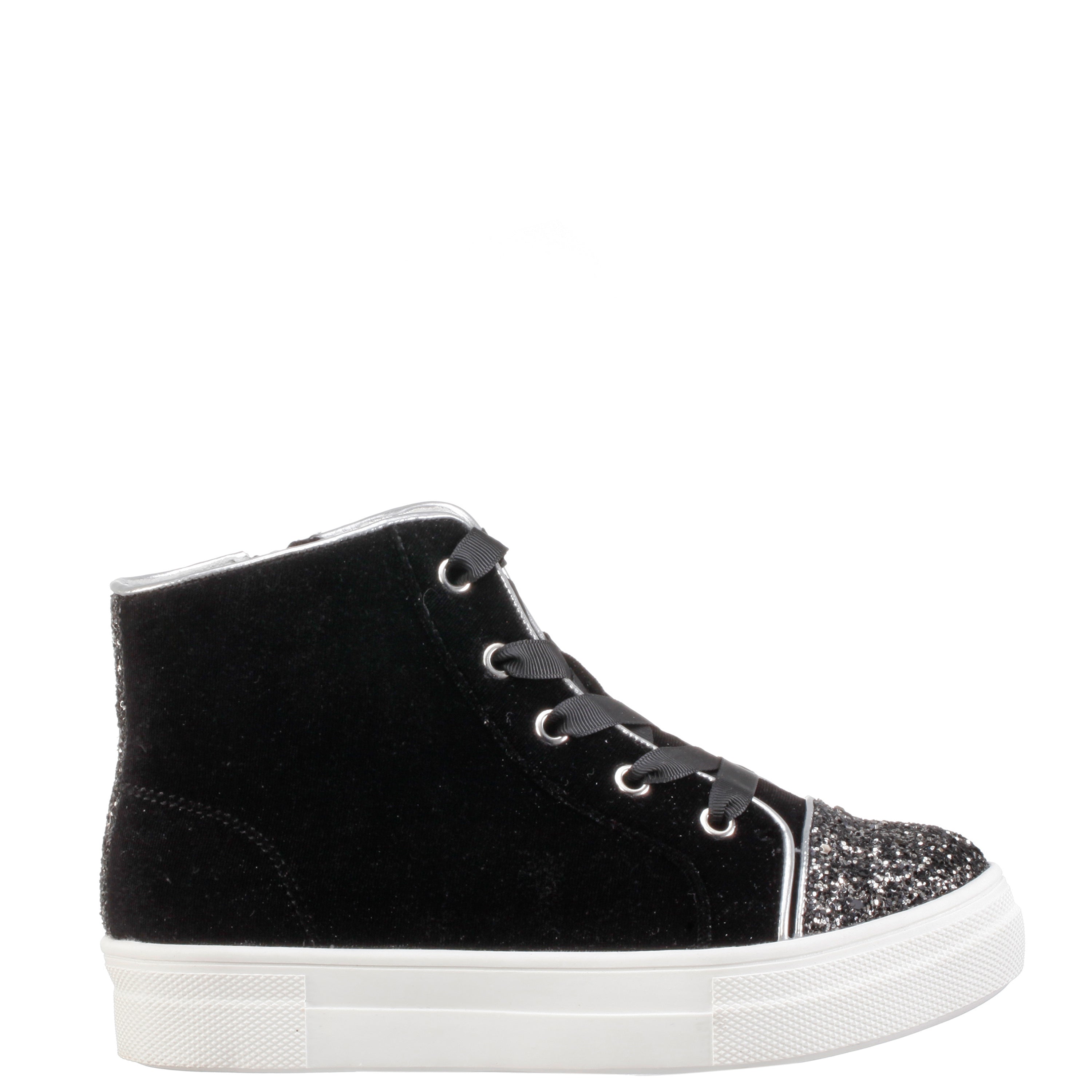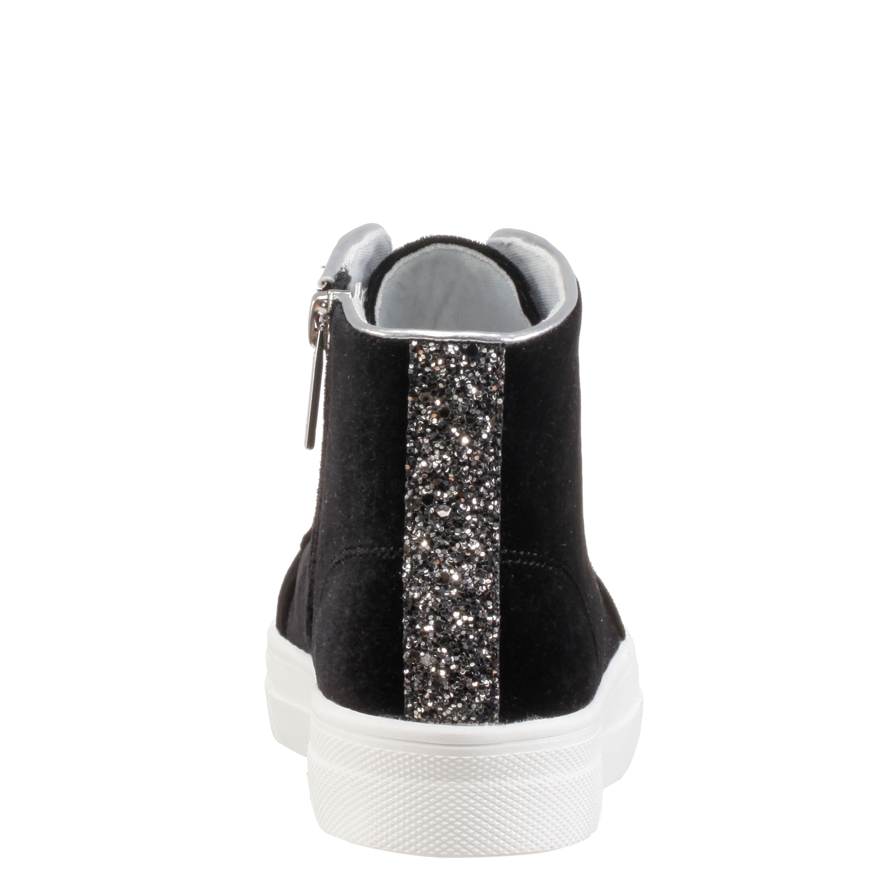 Plush velvet, chunky glitter, and grosgrain ribbon laces make DEVORAH a stand-out style. Designed with an inside zipper for ease of wear, this hi-top sneaker pairs well with casual and dressy looks alike.