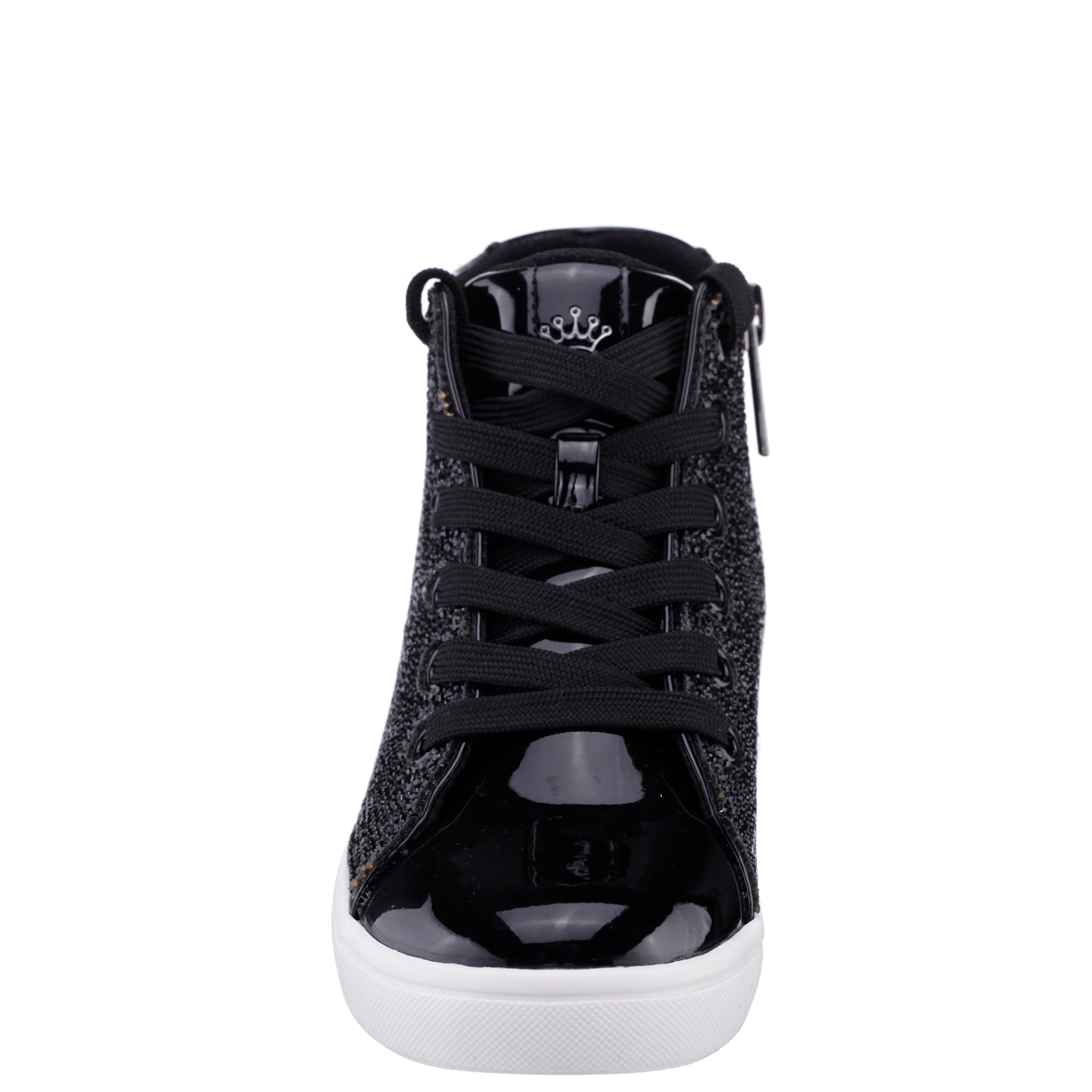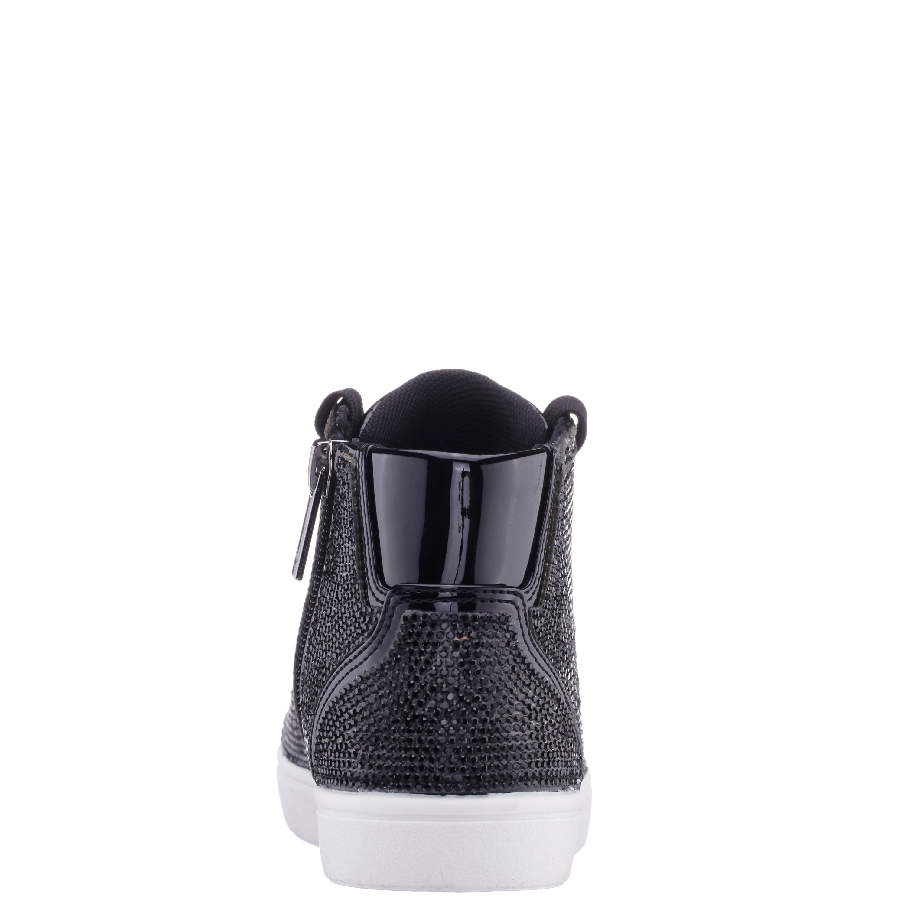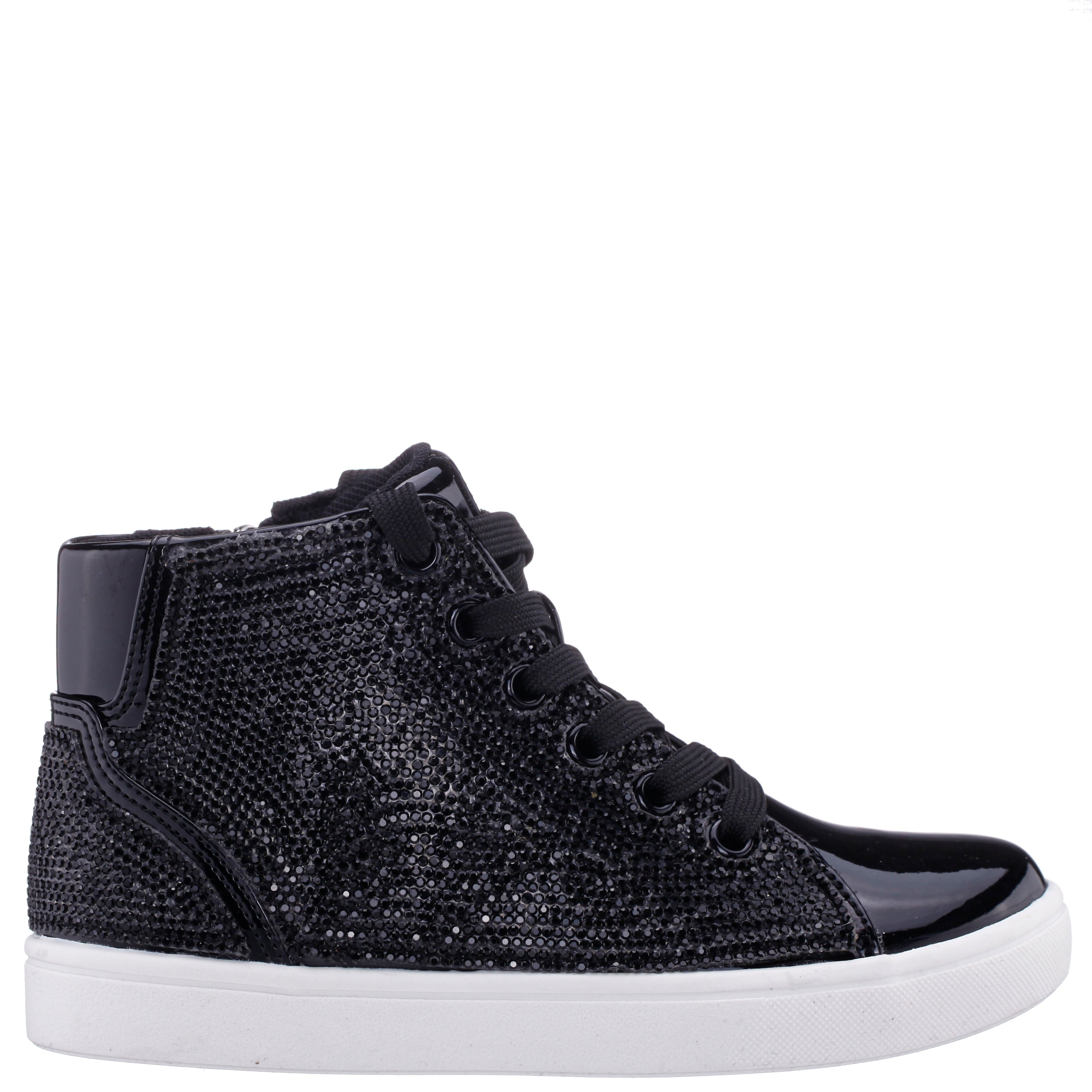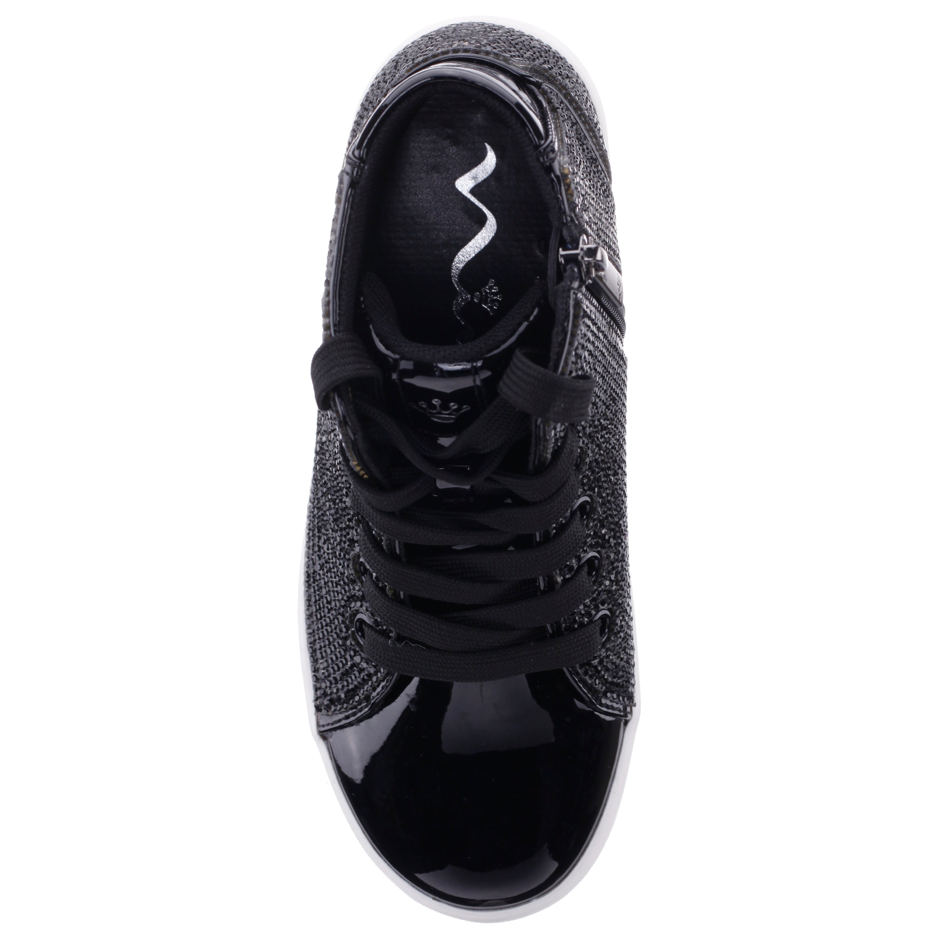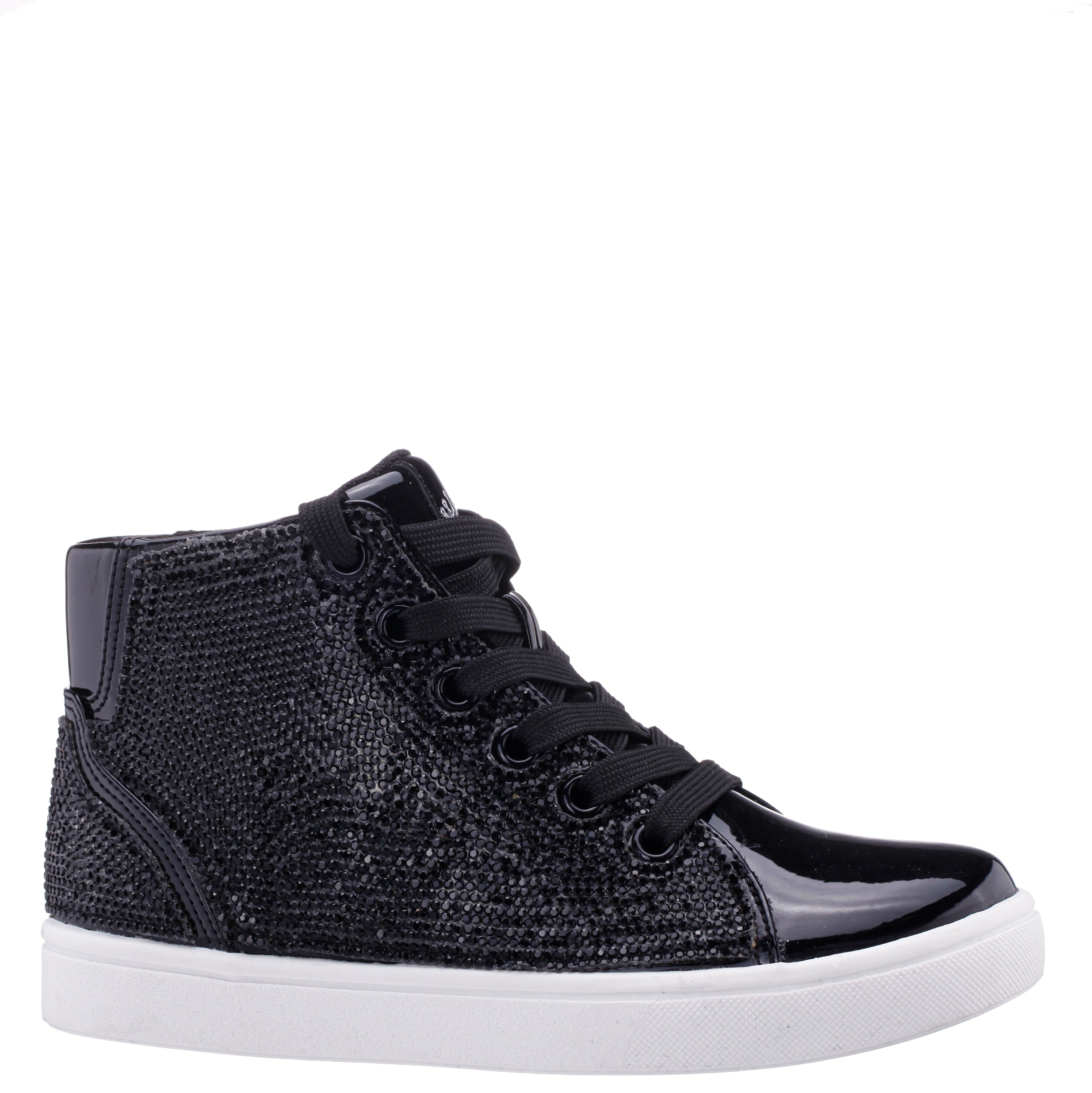 Glitzy and full of attitude, KULA by Nina is a bold high-top sneaker that turns everyday outfits into standout moments. Designed with shimmering crystal accents, gleaming eyelets, and a sleek branded zipper pull, this fashion-forward style sparkles with personality. The lace-up front and inside zipper offer easy wear, while the round toe, memory foam insole, and non-slip outsole keep her steps comfy and secure. From school days to special outings, KULA brings glam to every step.
