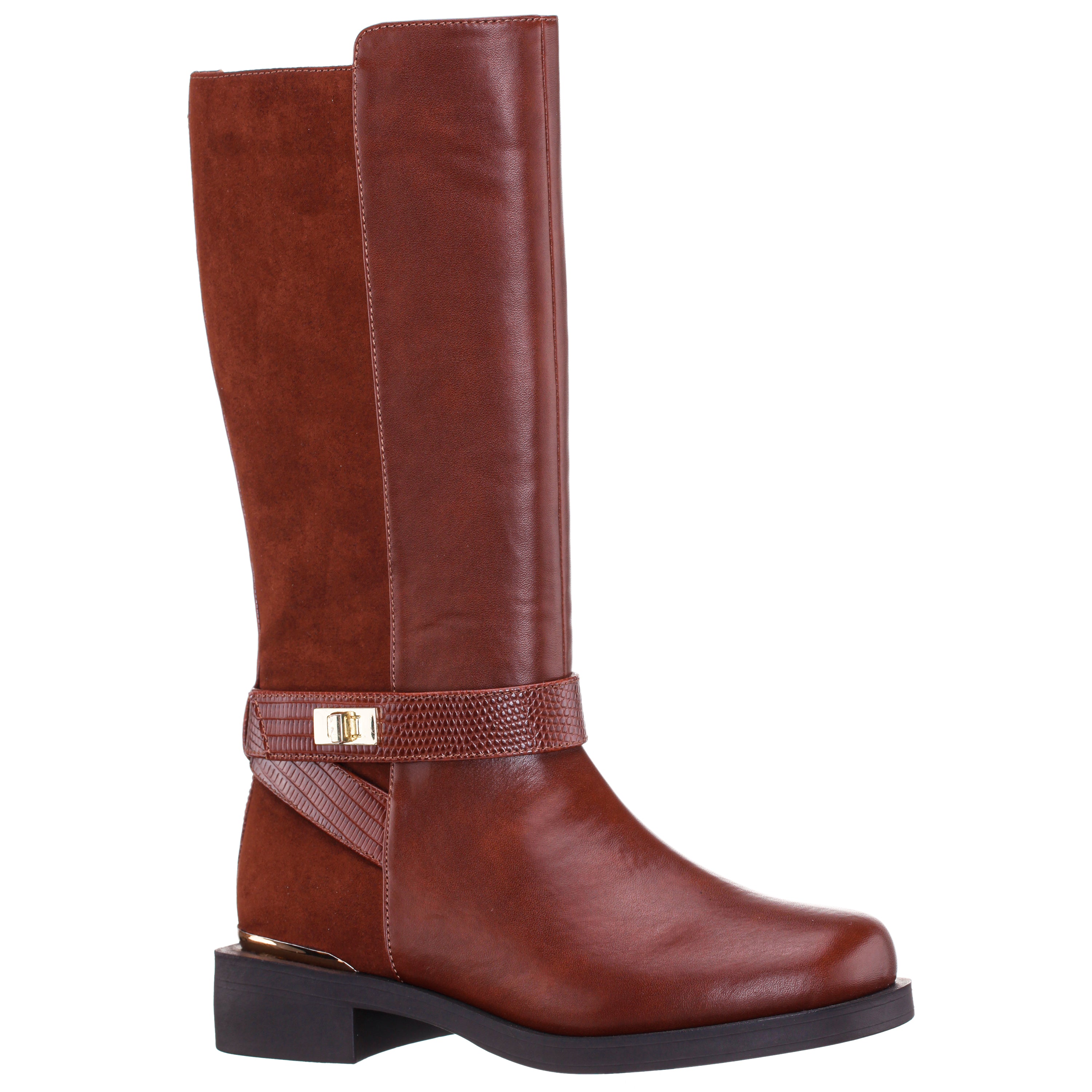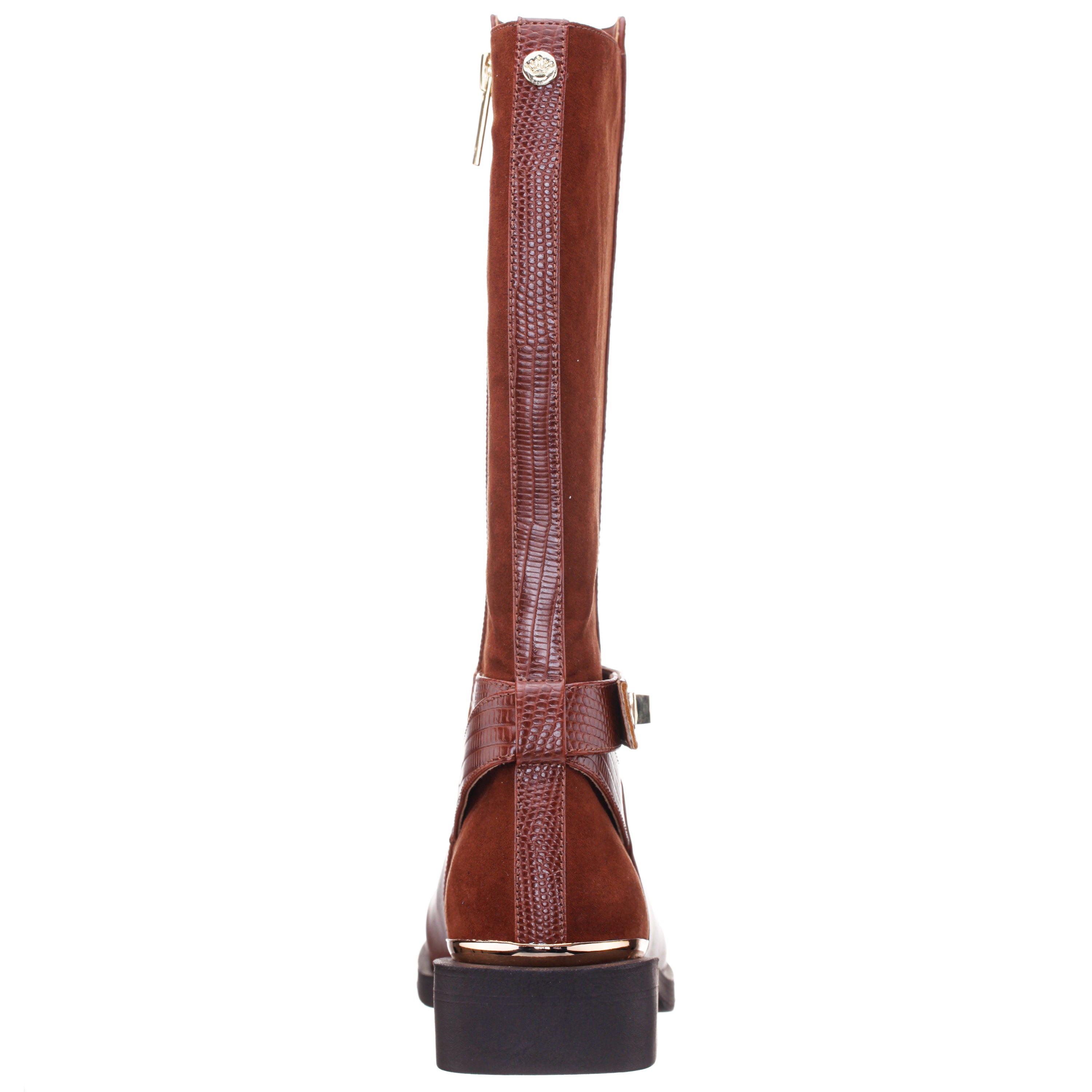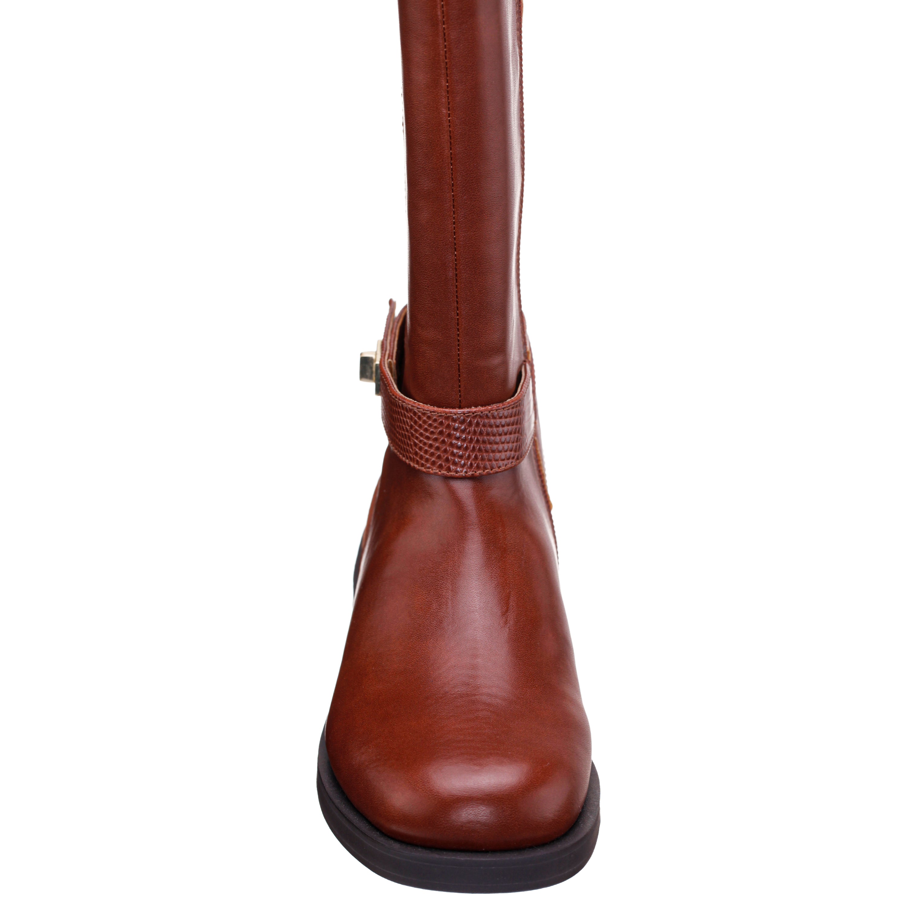 This modern take on the classic equestrian riding boot blends mixed materials seamlessly. With straps adorned with a decorative lock ornament, a stylish heel rand, and an inside zipper for convenience, it's a perfect fusion of fashion and function.
