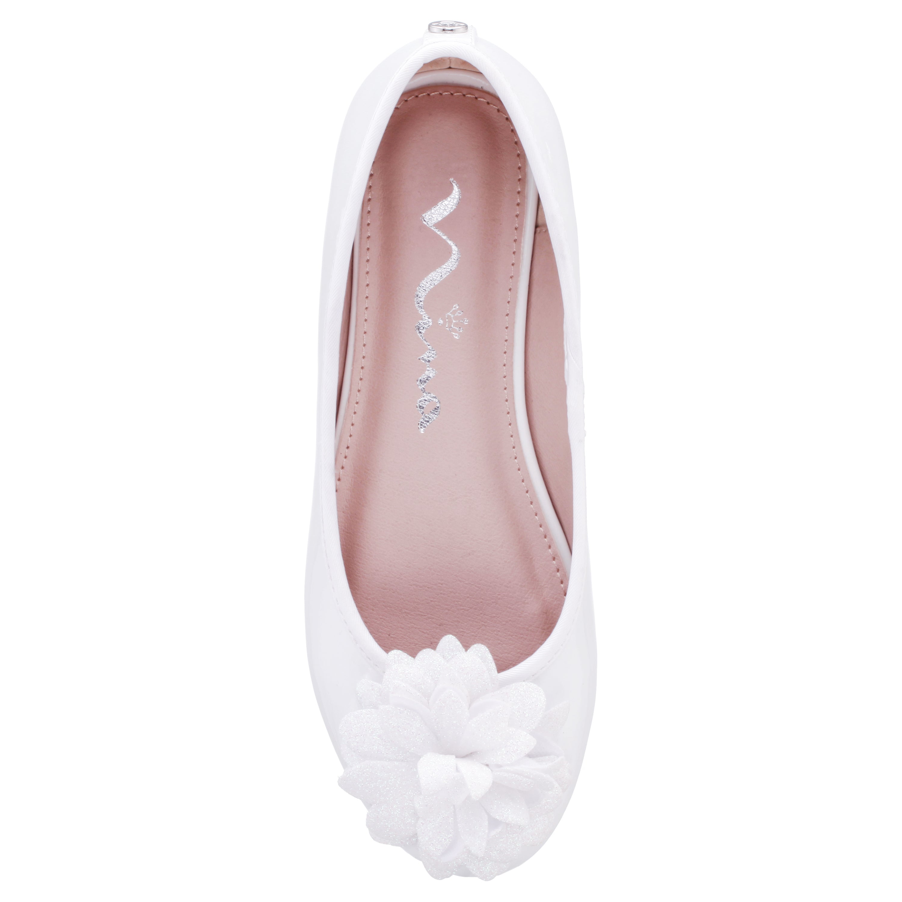 Add a touch of magic to every outfit with JEANESSE by Nina Shoes, a sweet and shimmering girls ballet flat made to shine. Featuring a radiant crackle metallic finish and a standout 3-D glitter flower, this special-occasion flat is the perfect pairing for all her spring dresses. With a soft memory foam insole and a flexible non-slip sole, JEANESSE keeps her comfortable and stylish from morning celebrations to evening twirls.