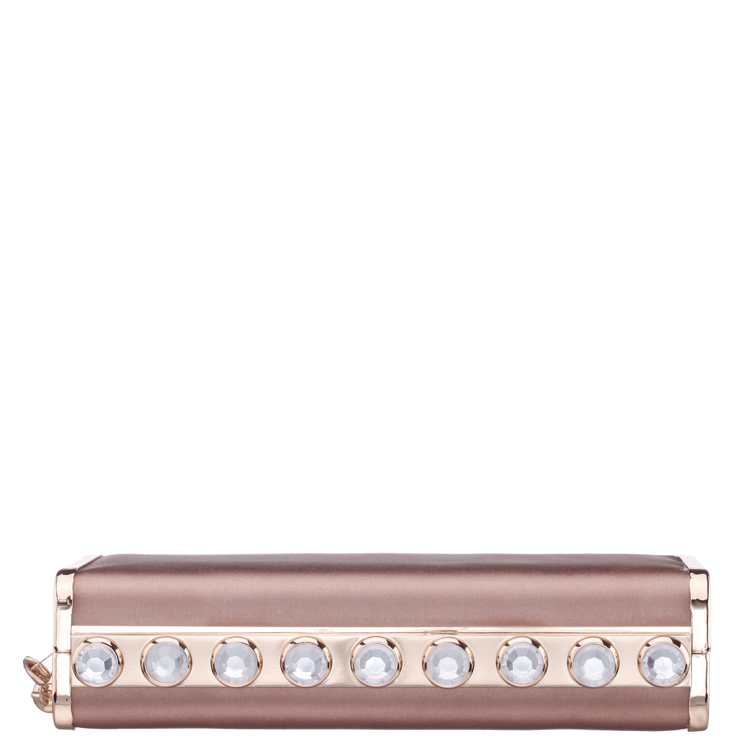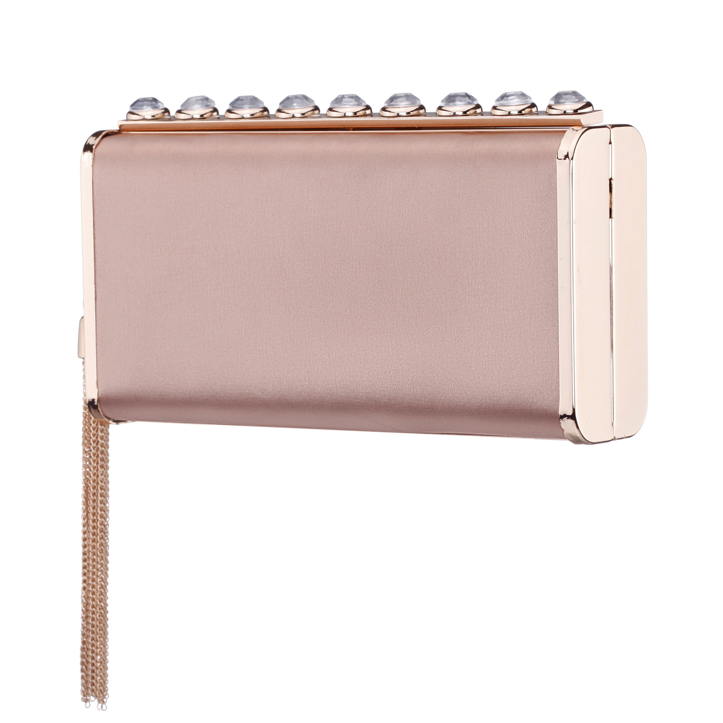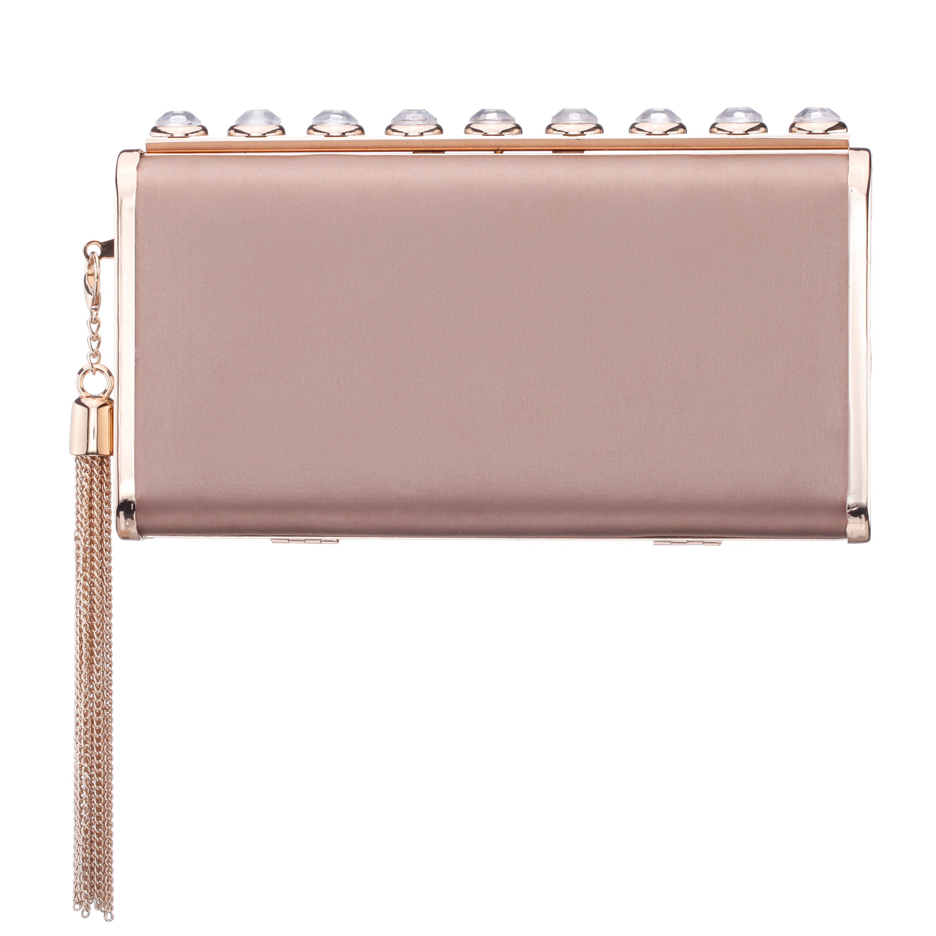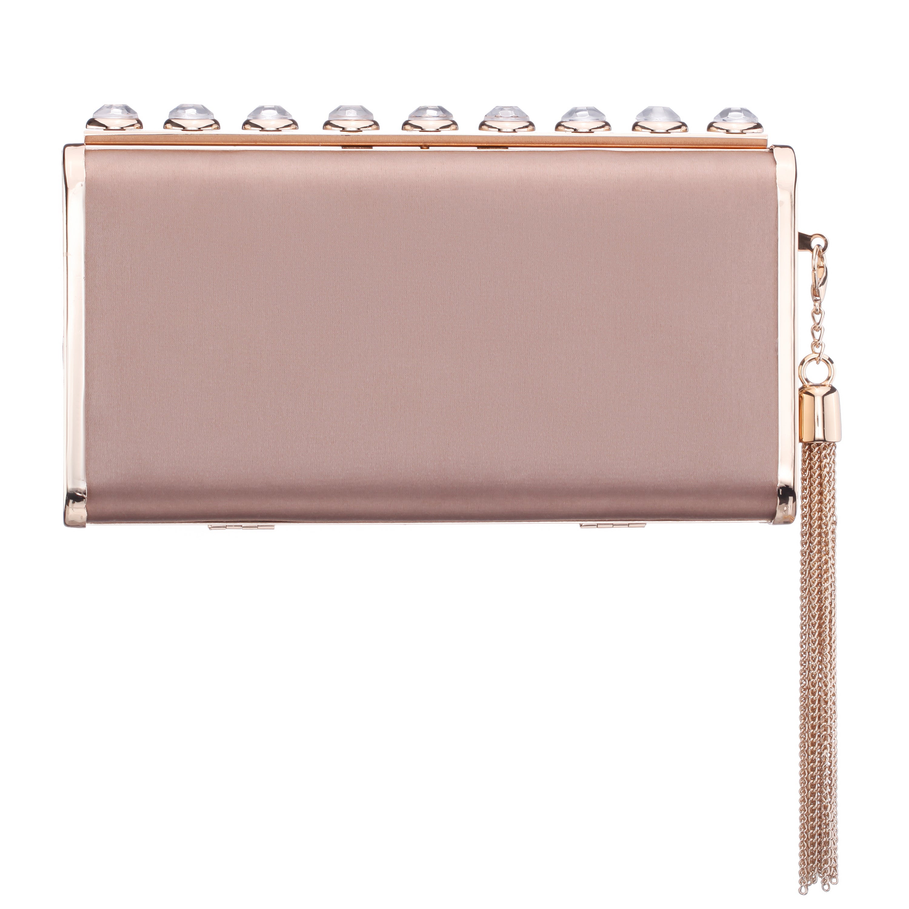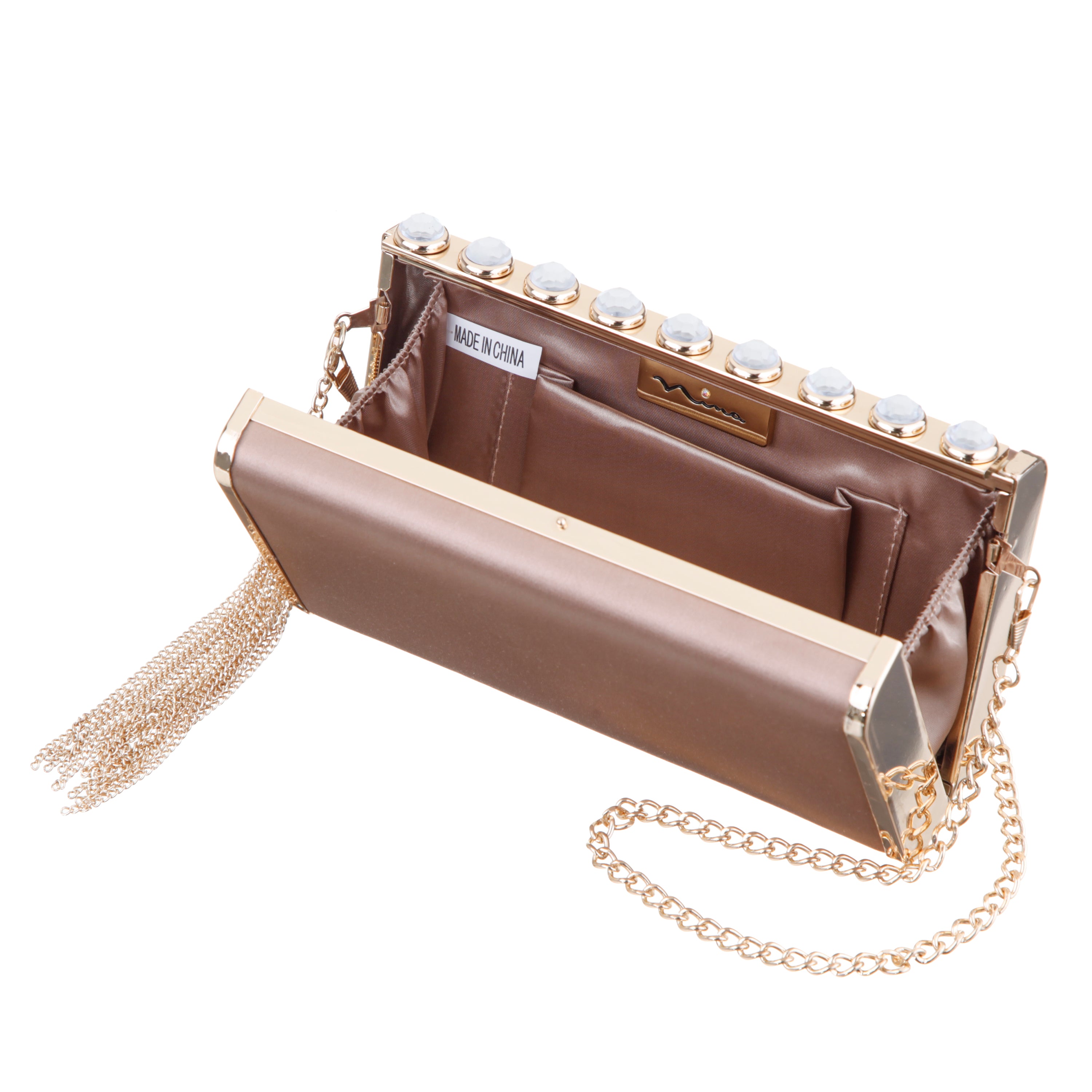 The AMOS by Nina is the ultimate go-to evening minaudière, blending chic minimalism with statement-worthy shine. With its sleek, structured design and variety of eye-catching finishes, AMOS brings polish and poise to every occasion—whether you're dressing up for a cocktail party, formal event, or elegant night out. Its compact shape is just the right size for essentials, and the lift-lock closure ensures everything stays secure. A soft satin-lined interior with a back wall pocket offers discreet storage, while the 18” drop-length chain strap adds effortless versatility. From shimmer to bold textures, the AMOS by Nina is made to stand out beautifully.