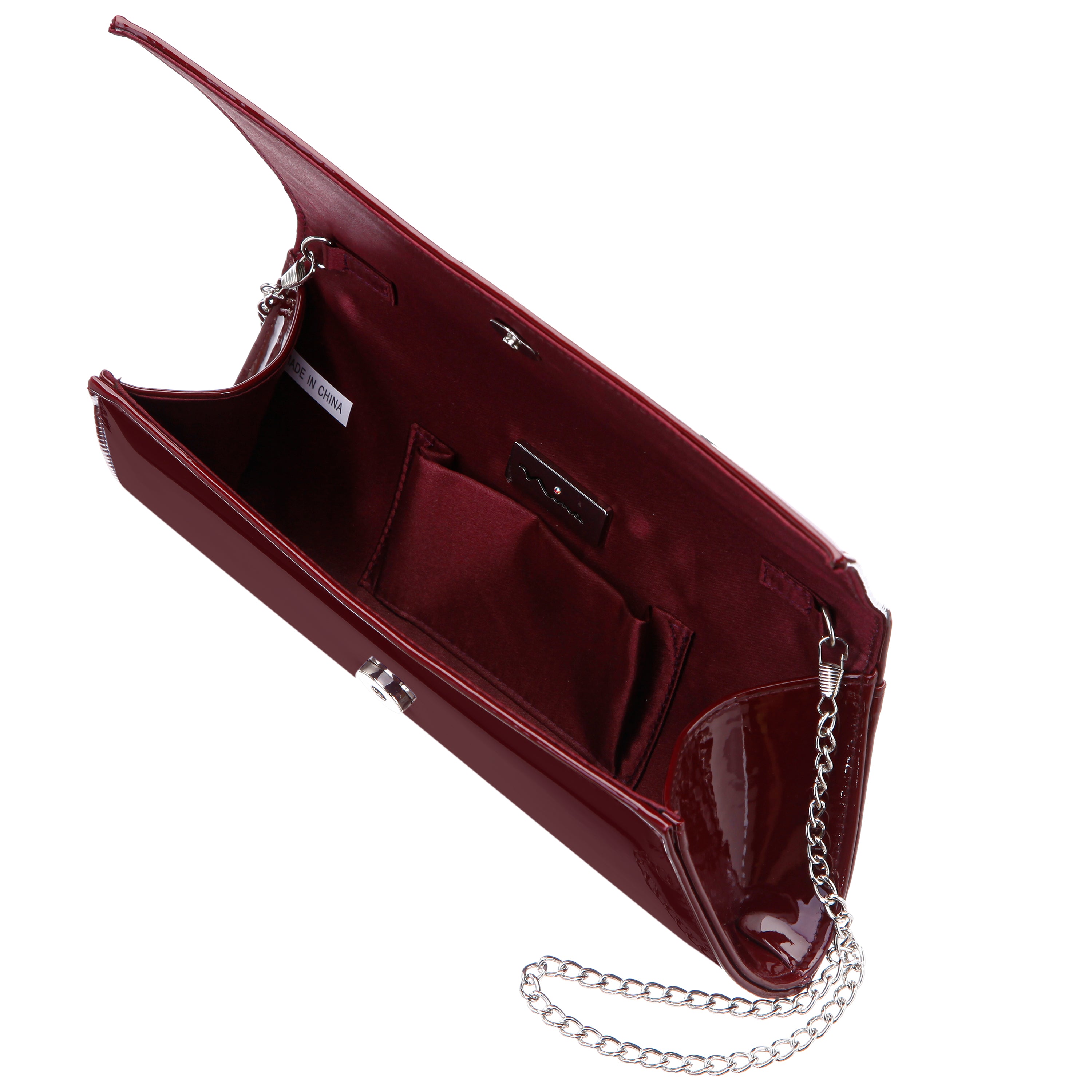 ZOEY by Nina – Curved Flap Slim Clutch Refined and elegant, the ZOEY by Nina is a sleek slim clutch that adds polish to any evening or special occasion look. Its modern curved flap design gives a soft, sculpted silhouette, while the smooth finish and compact shape keep it effortlessly chic. Secured with a magnetic snap closure, ZOEY features a satin-lined interior with a convenient wall pocket for small essentials. Carry it as a clutch or wear it hands-free with the 18" flat curb chain strap. Available in timeless tones like Navy, Platino, True Silver, Red Rouge, Ecru, Nude, and Honey, ZOEY is your go-to accessory for understated glam.Key Features