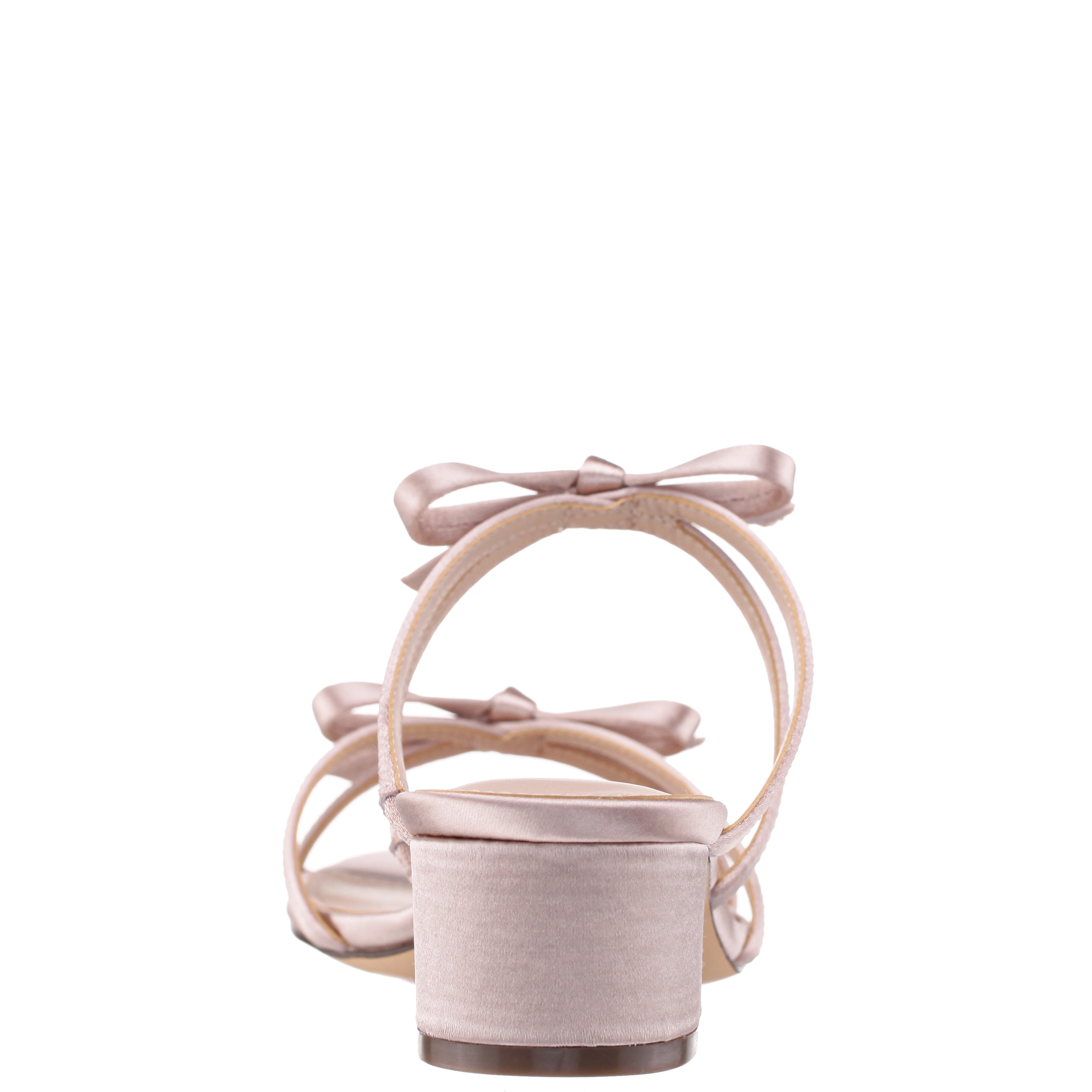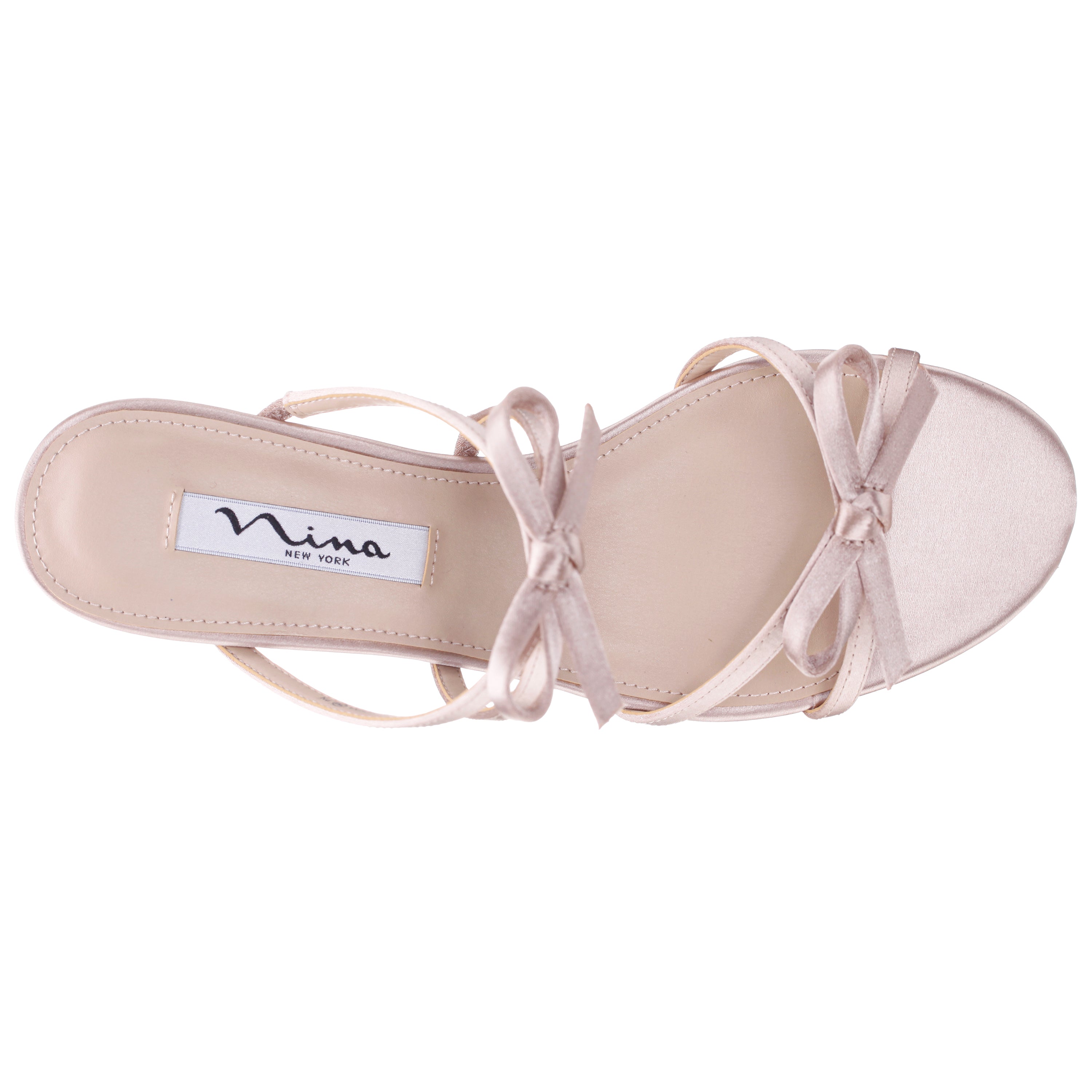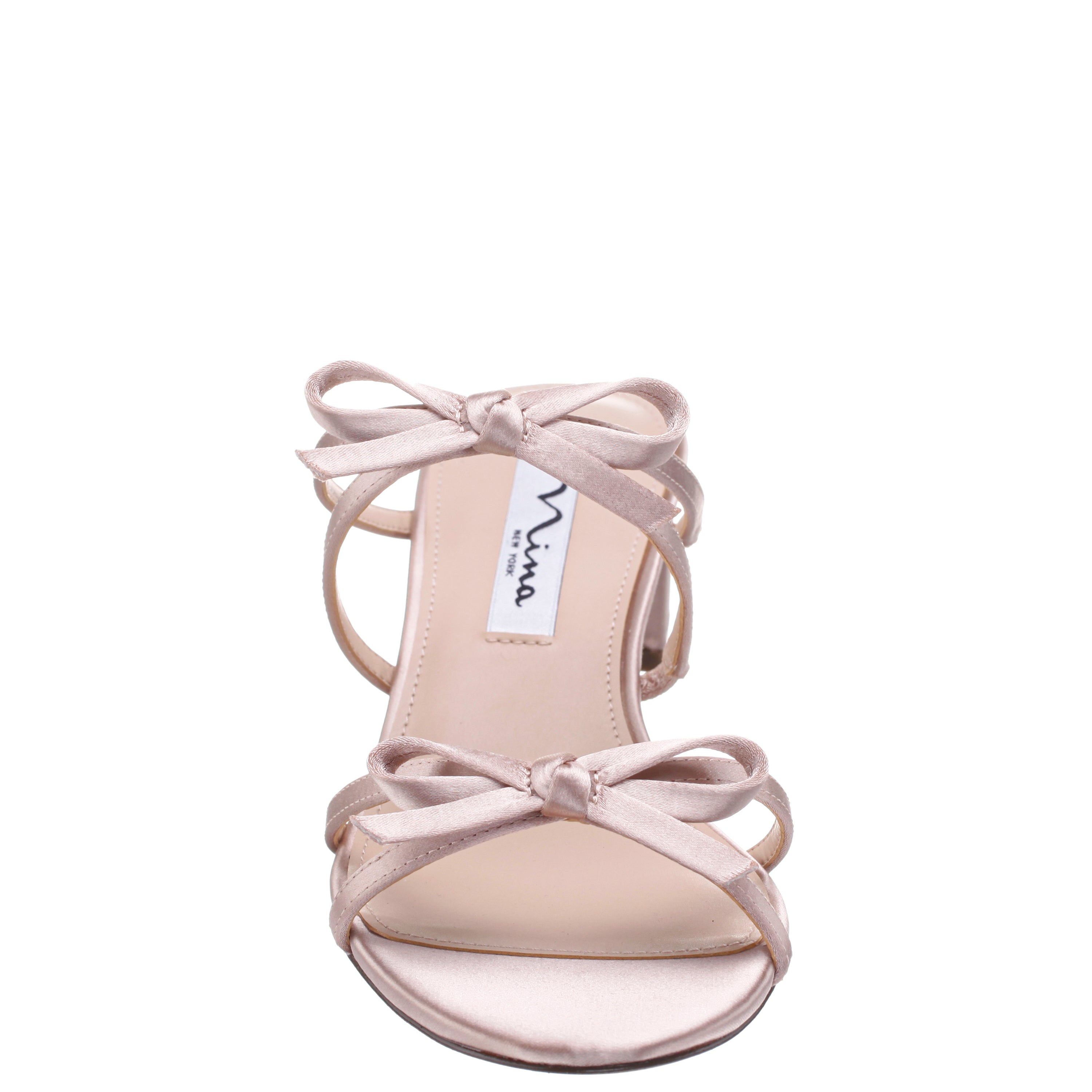 Gaby Sandal Feminine and flirty, the Gaby By Nina Shoes is enchanting in its simplicity. Designed with lustrous satin straps adorned with delicate bows, this slip-on style exudes effortless elegance. Perfect for brides or special occasions.