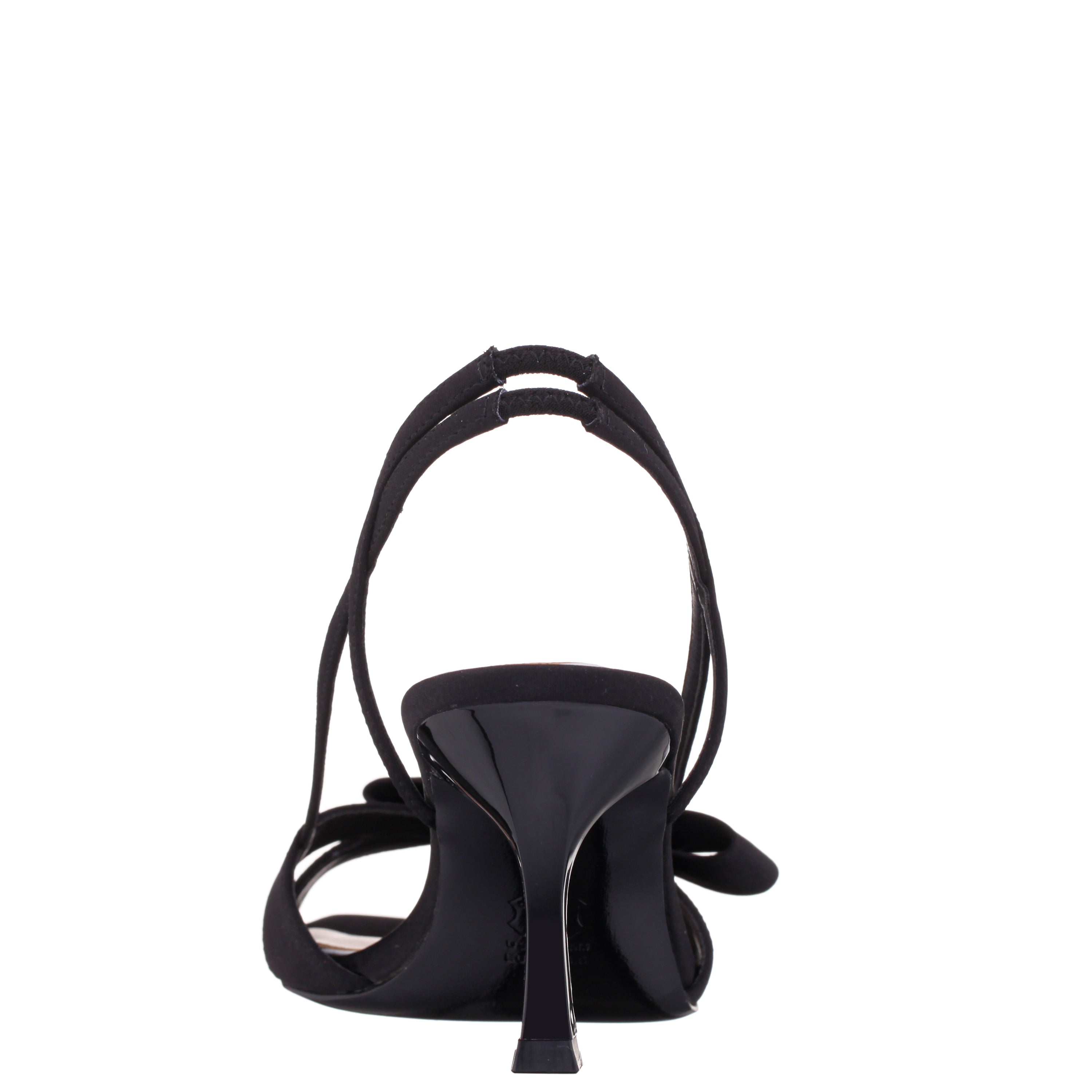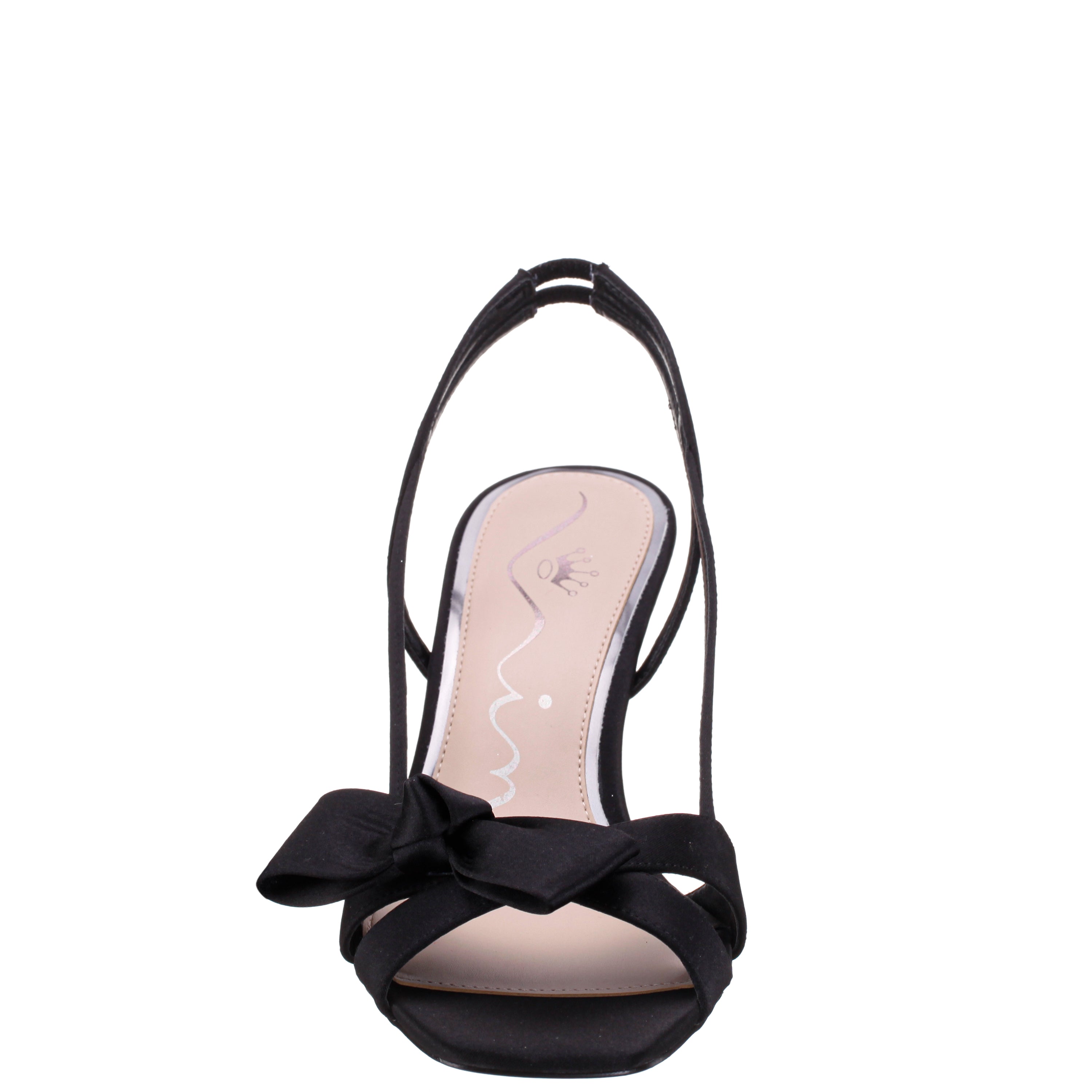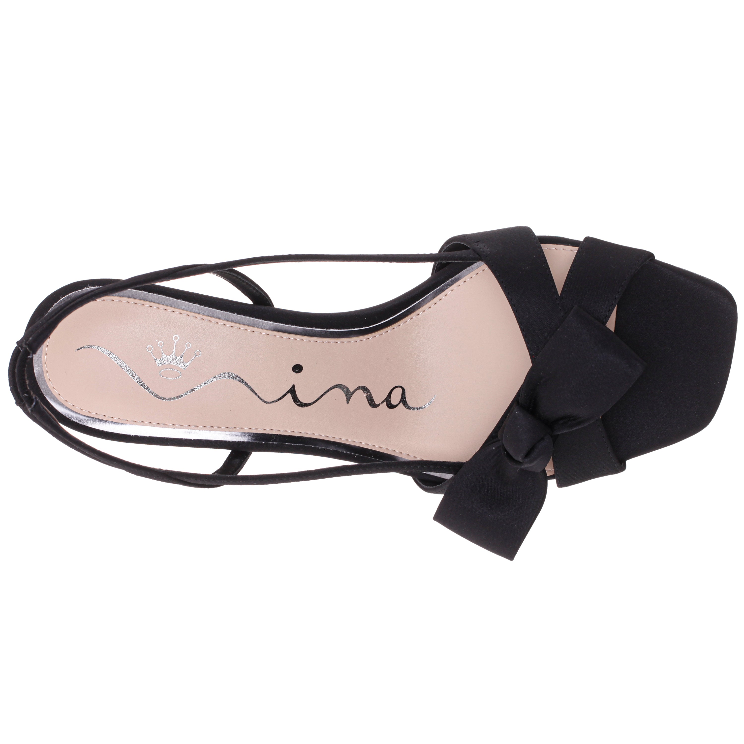 A classic bow makes a feminine statement on Lizette by Nina, a slingback sandal on a modern, softly-squared shaped-toe lifted by an elegant ABS heel.