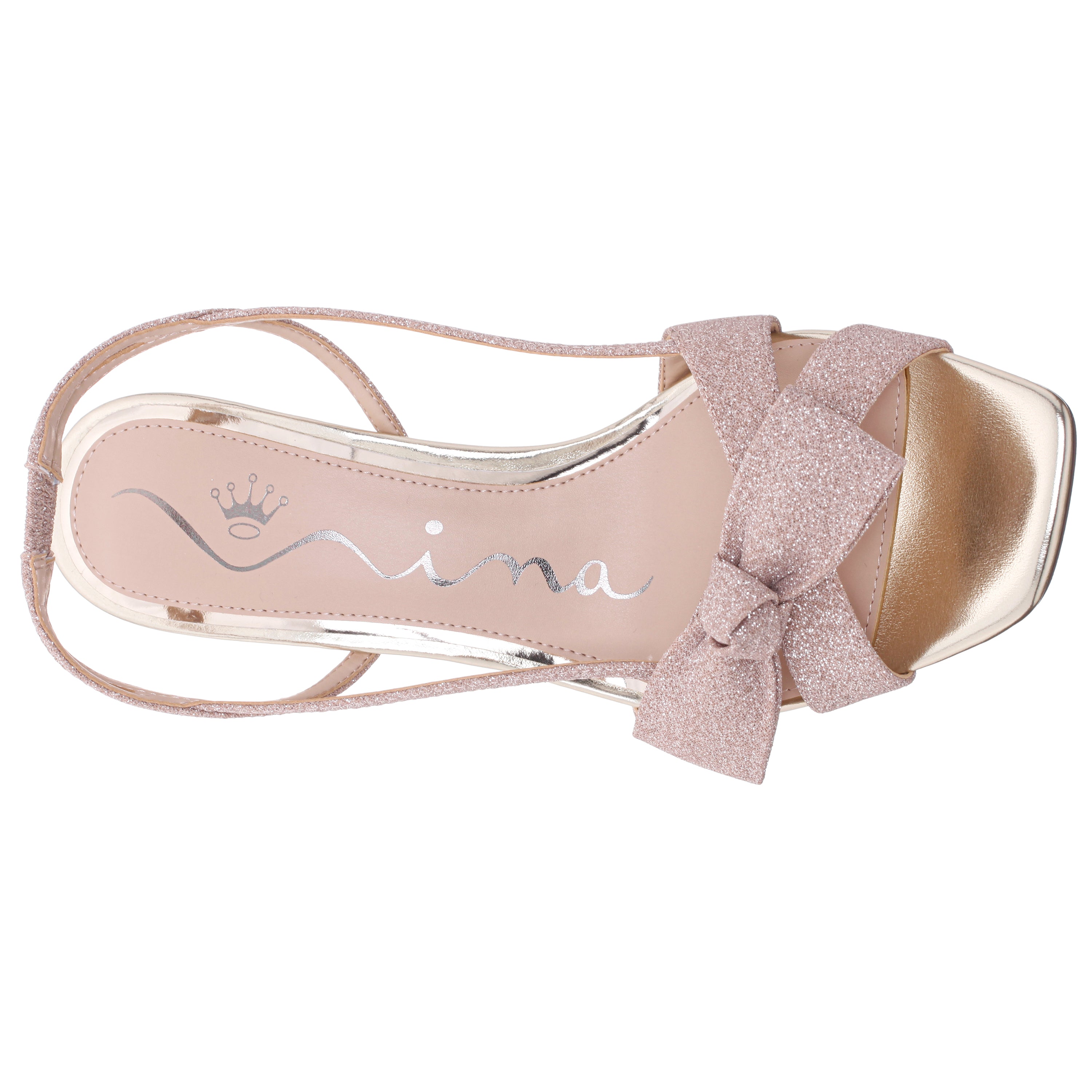 A classic bow makes a feminine statement on Lizette by Nina, a slingback sandal on a modern, softly-squared shaped-toe lifted by an elegant ABS heel.