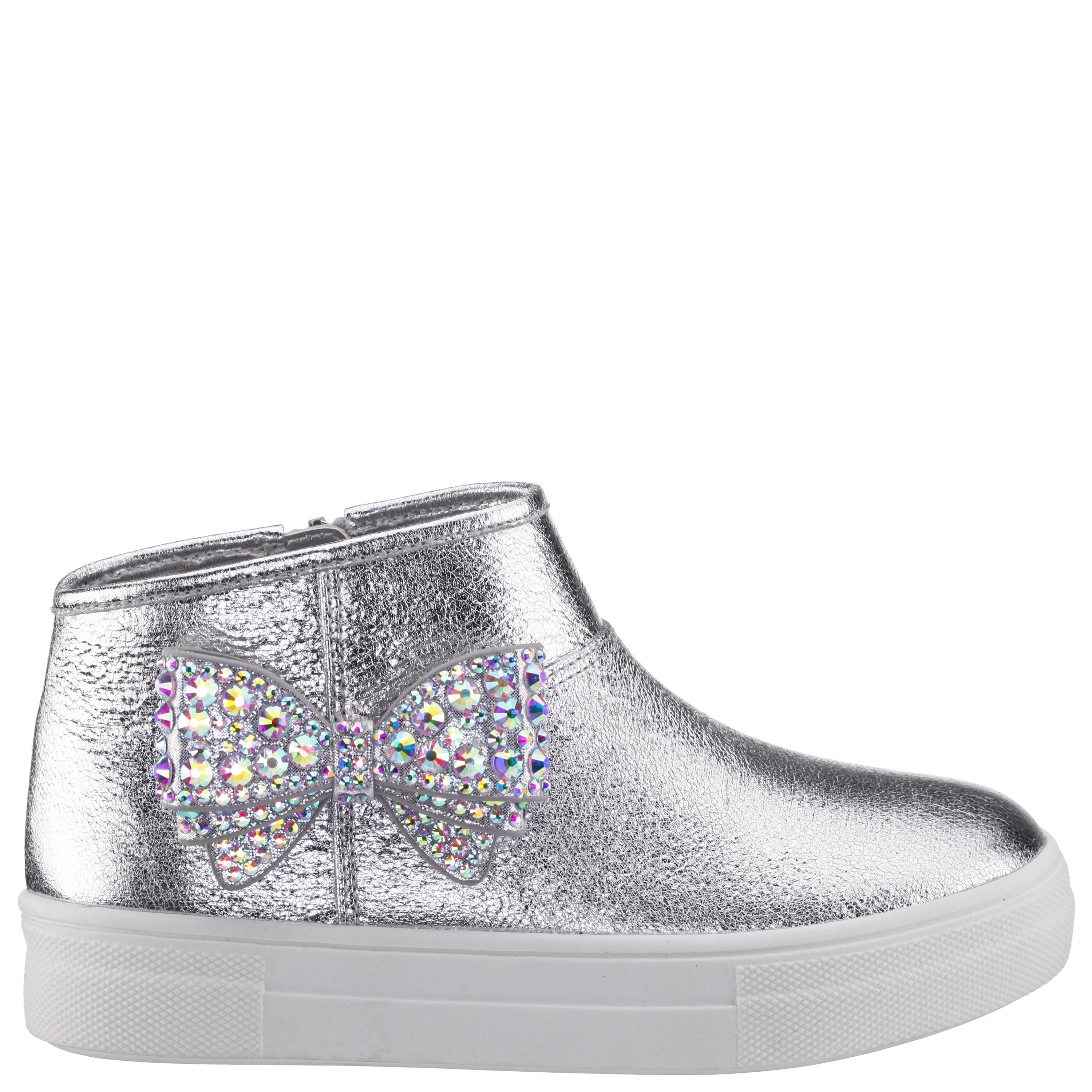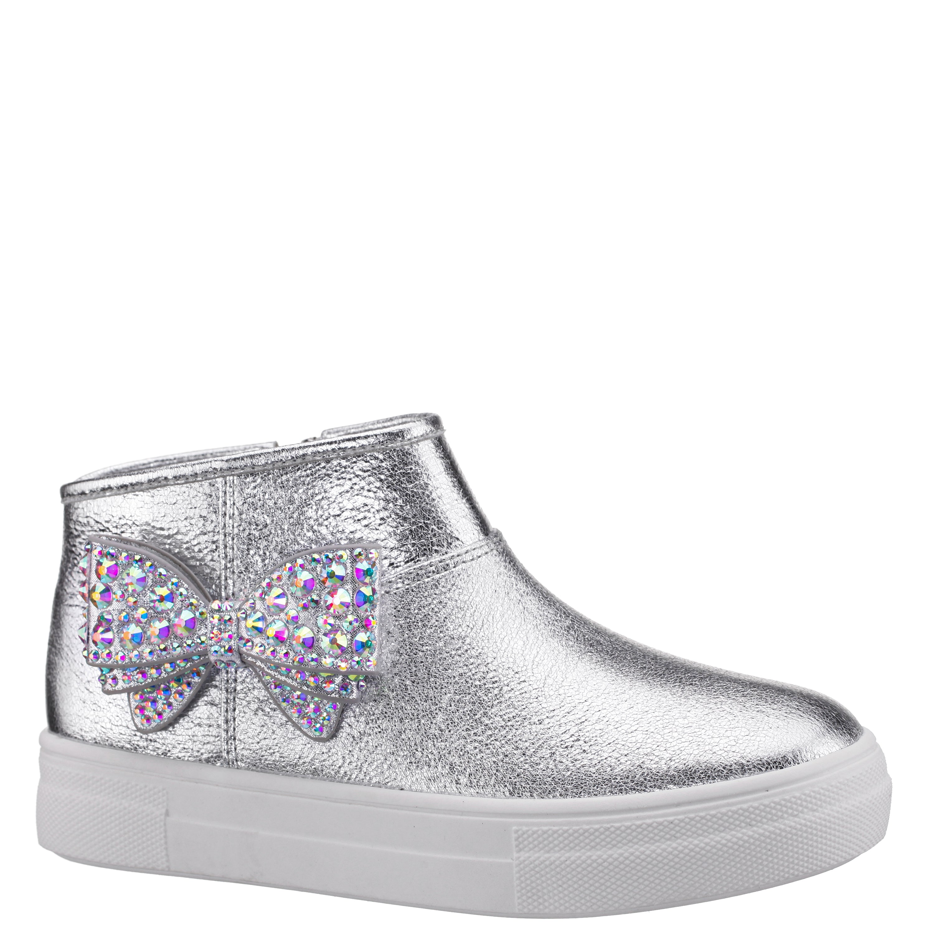 Sparkle meets street style in GWENNY by Nina Shoes, a fashionable girls high top sneaker with just the right touch of glam. This hybrid sneaker boot features a dazzling rhinestone bow that adds standout shine, while the inside zipper makes getting ready quick and easy. With a cushioned memory foam insole and a flexible non-slip sole, GWENNY delivers comfort, sparkle, and cool-girl vibes all day long.