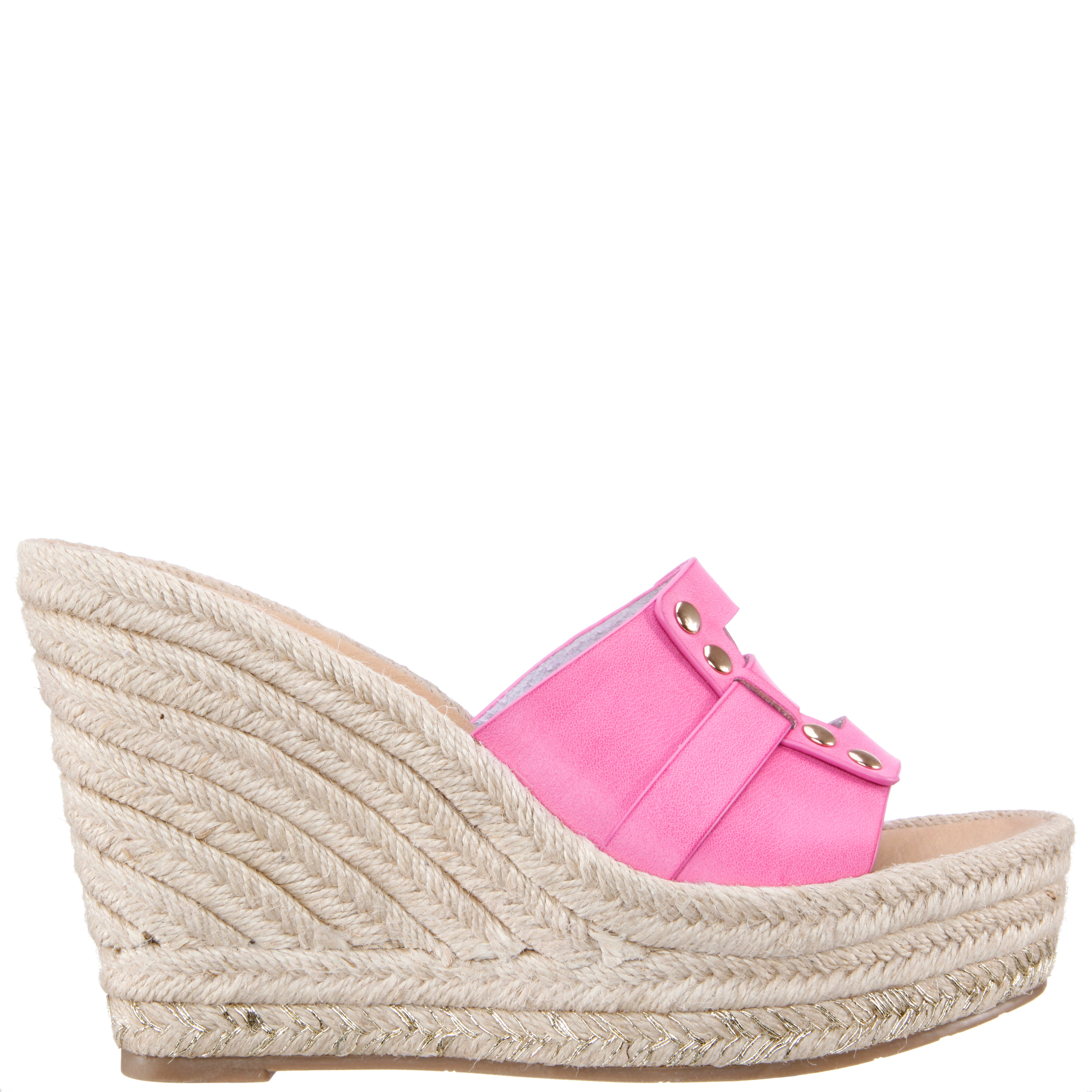 Simply chic unlined vegan vachetta slip on slide with clean lines accented with grommets. A natural jute wrapped platform wedge accented with metallic thread detail, it features a molded contoured footbed with memory foam padding, wrapped in a breathable, soft sueded finish.