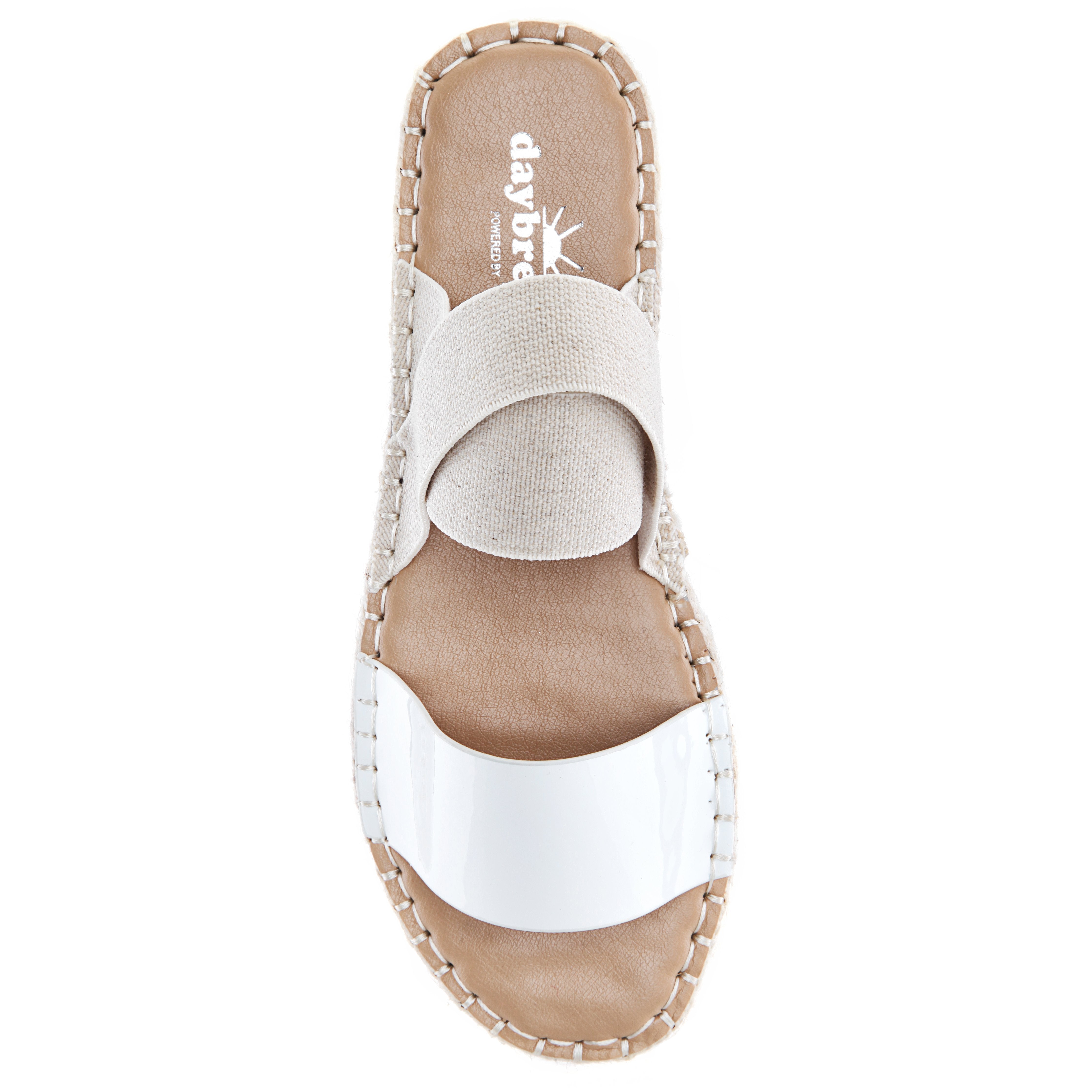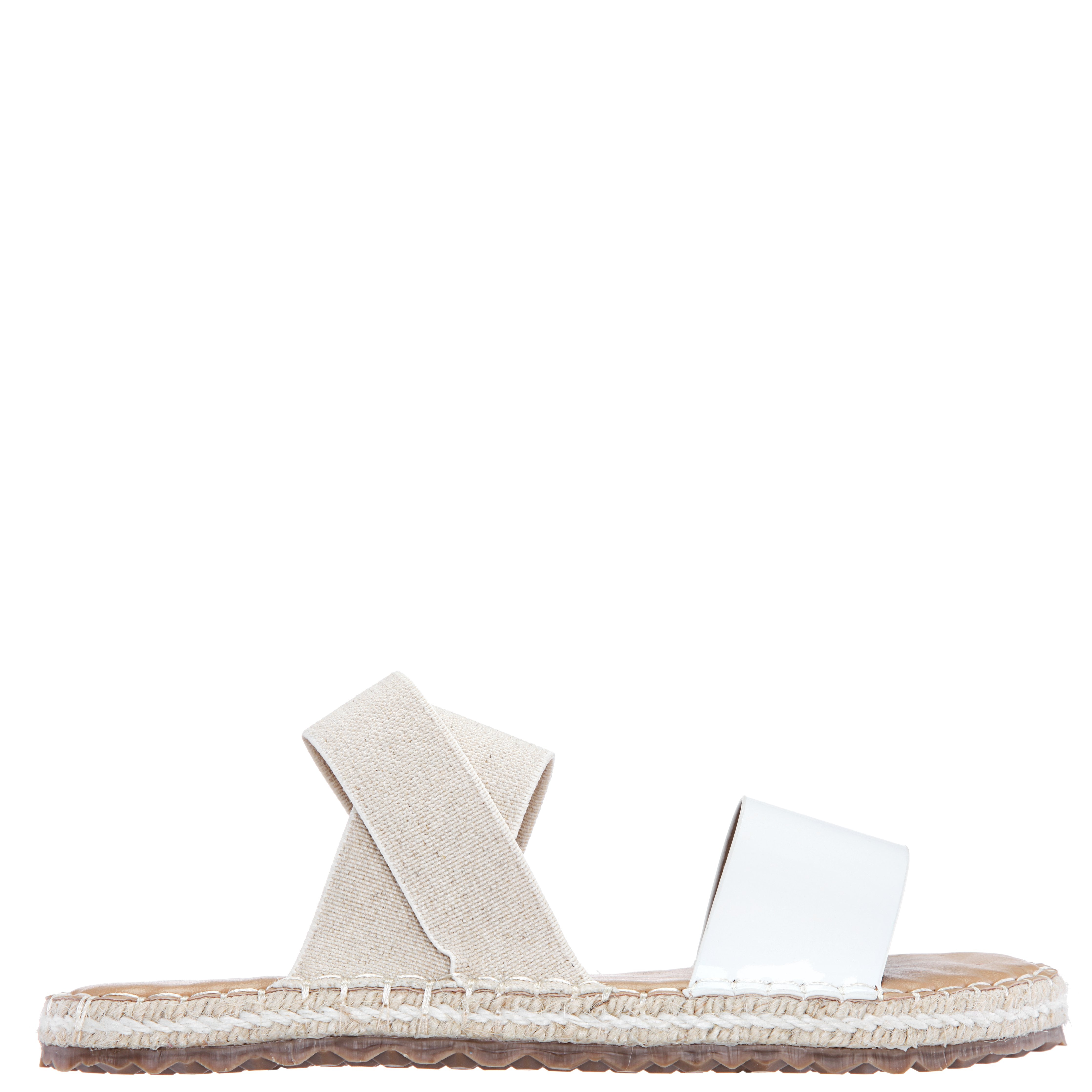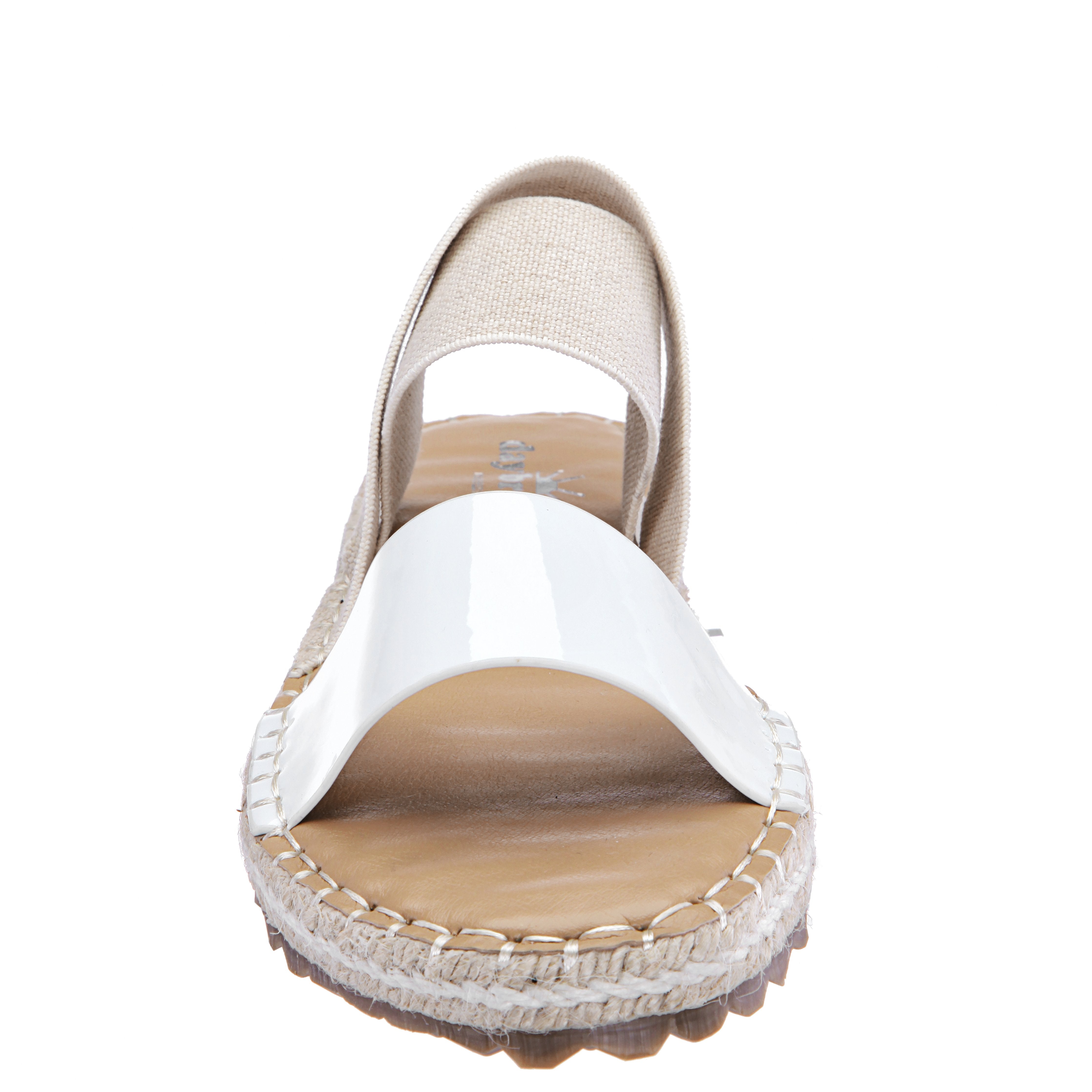 Vibrant colors or neutrals in vegan patent with comfy stretch elastic back & instep strap. Wear this pull-on espadrille sandal with a bathing suit, jeans or a sundress. On a lightweight flexible jute bottom shot through with a colorful hand whip stitch detail.
