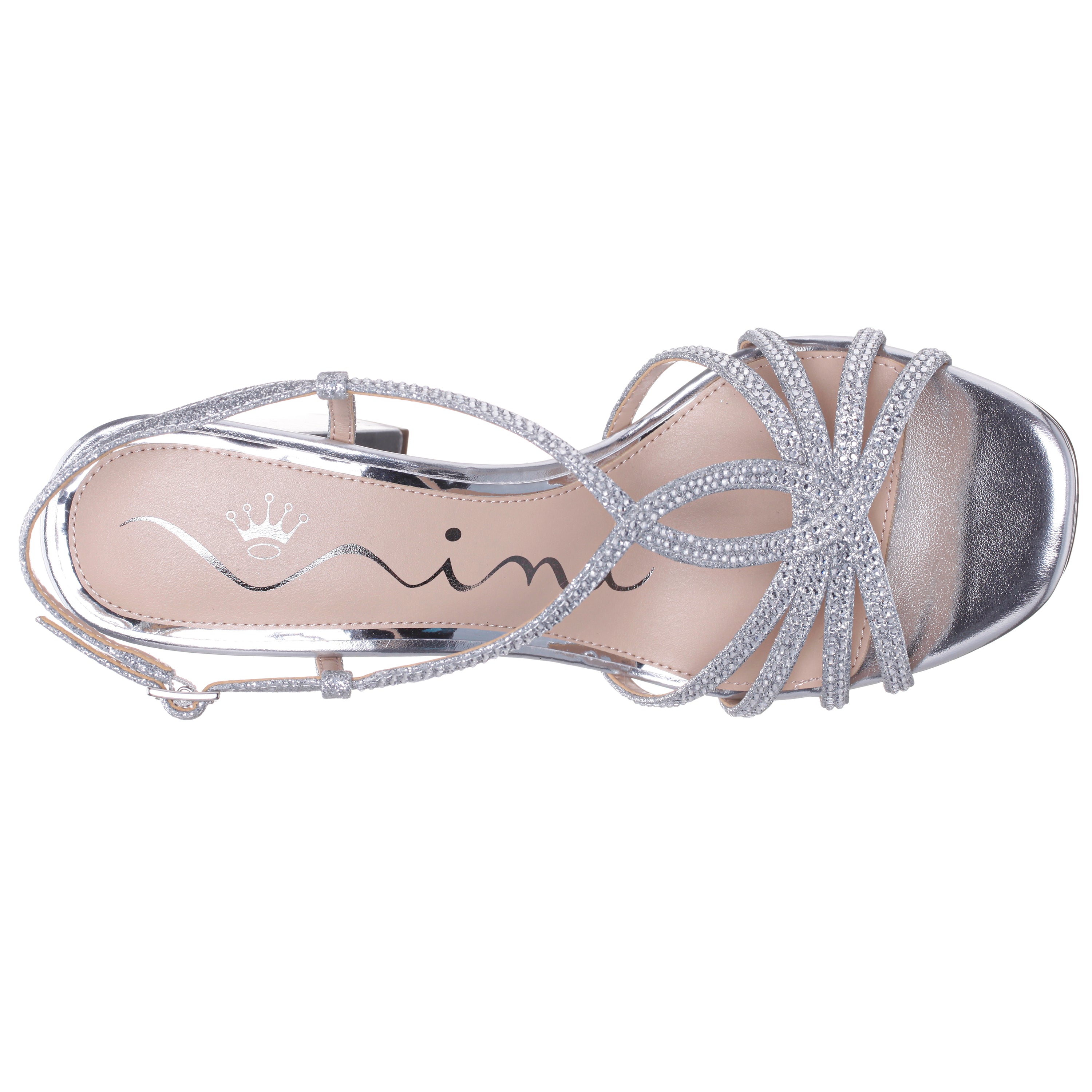 A bold metallic platform and chunky heel add scene-stealing style to Summer by Nina, whose dazzling hot-fix crystals illuminate the slender straps as they create a flattering pattern that elongates the leg. The sturdy heel and platform provides a stable, comfortable fit for when you're dressing up or dressing down.