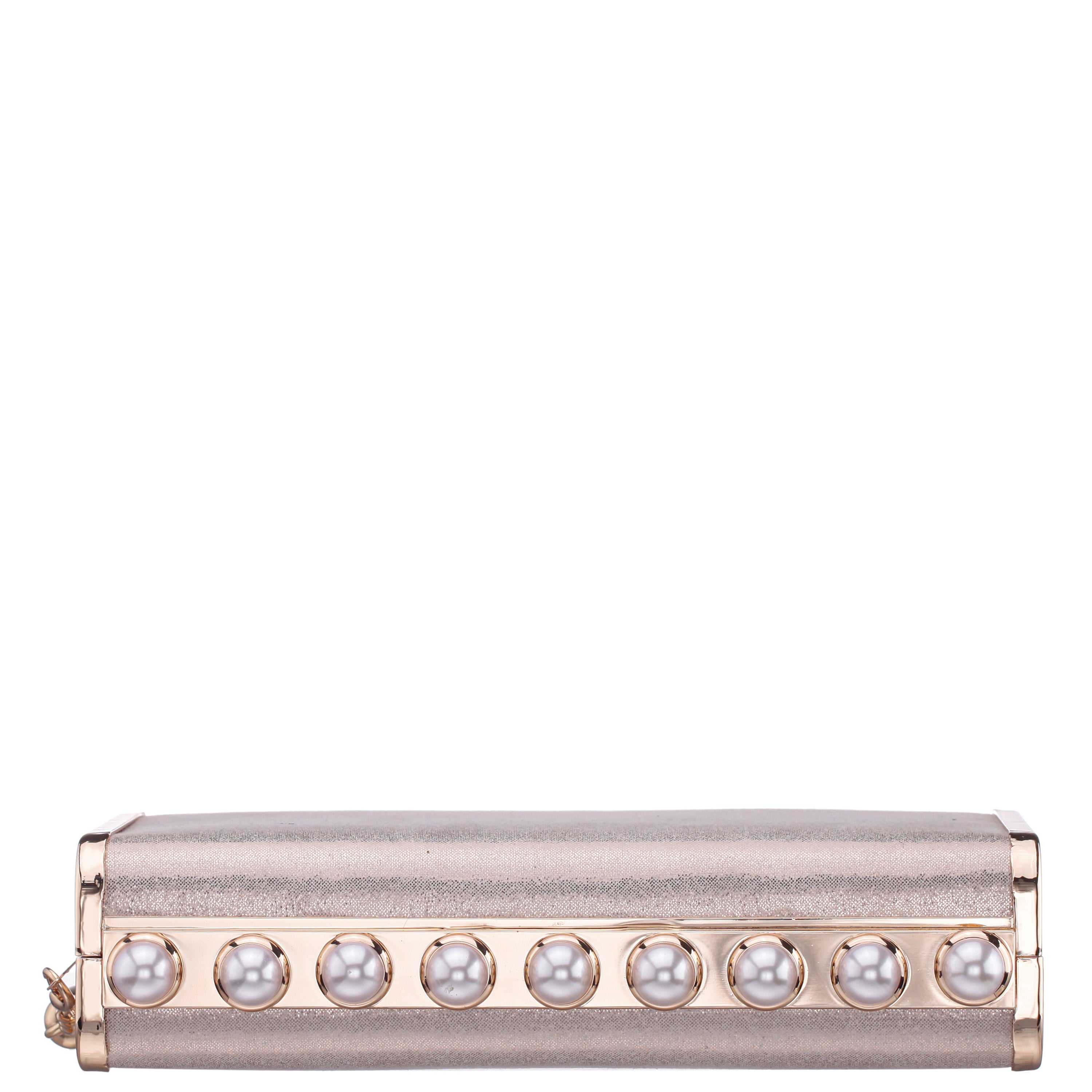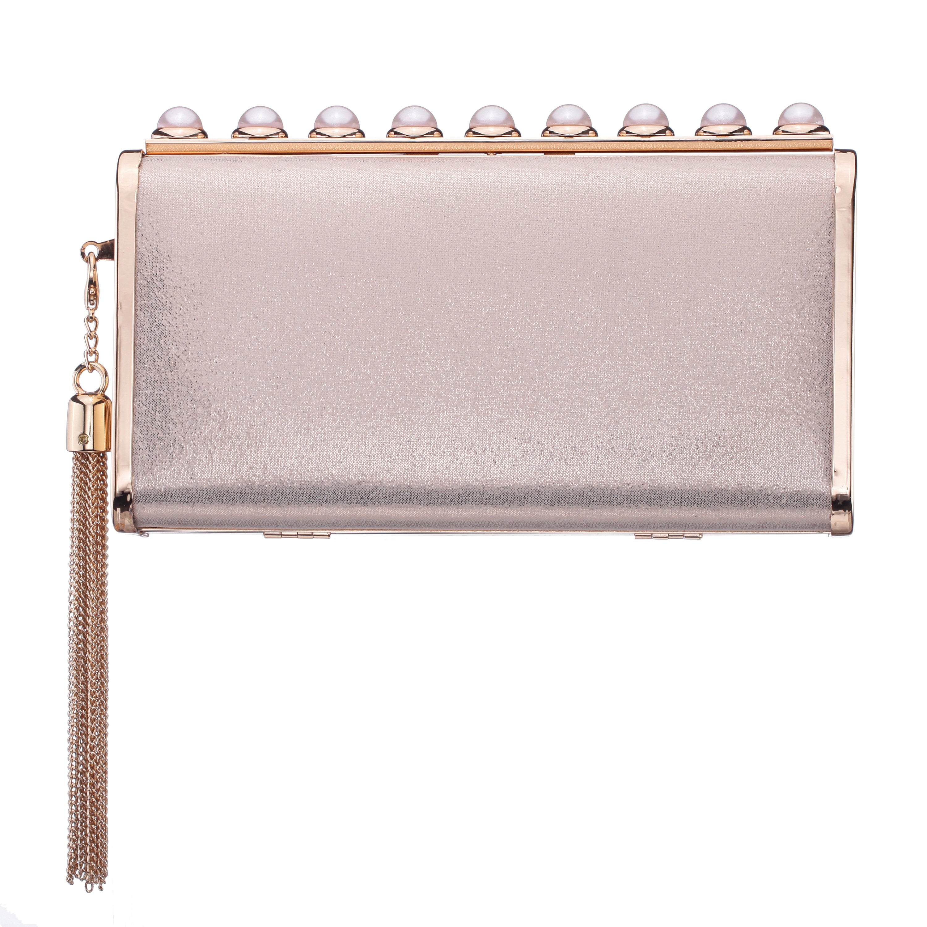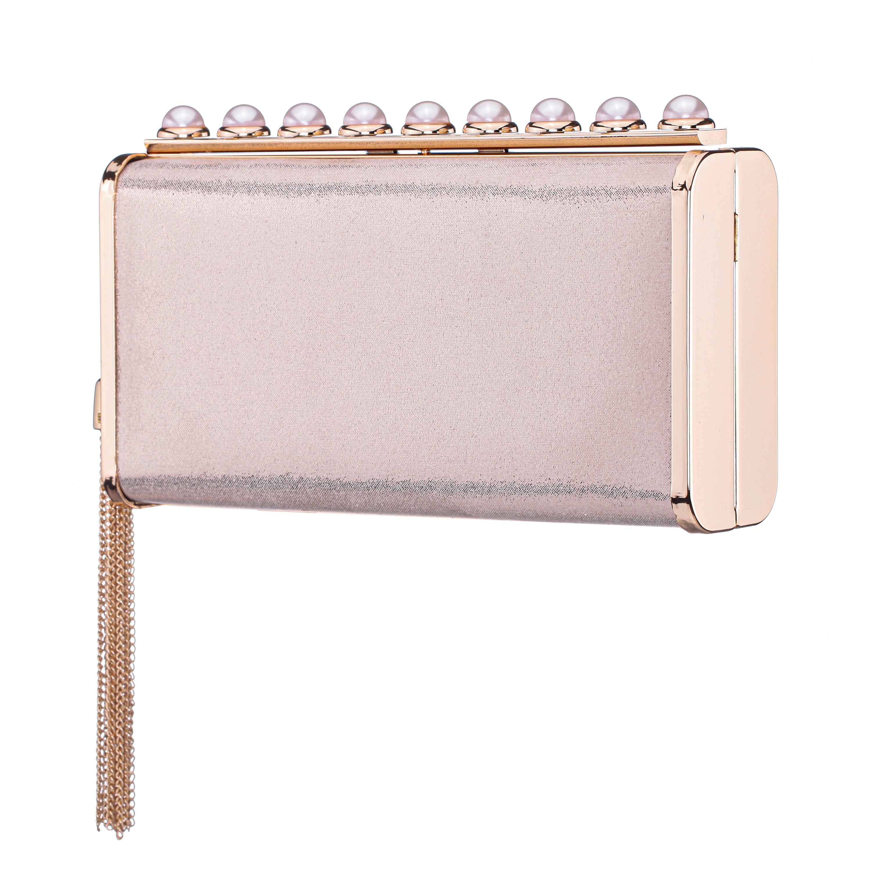 The AMOS by Nina is the ultimate go-to evening minaudière, blending chic minimalism with statement-worthy shine. With its sleek, structured design and variety of eye-catching finishes, AMOS brings polish and poise to every occasion—whether you're dressing up for a cocktail party, formal event, or elegant night out. Its compact shape is just the right size for essentials, and the lift-lock closure ensures everything stays secure. A soft satin-lined interior with a back wall pocket offers discreet storage, while the 18” drop-length chain strap adds effortless versatility. From shimmer to bold textures, the AMOS by Nina is made to stand out beautifully.